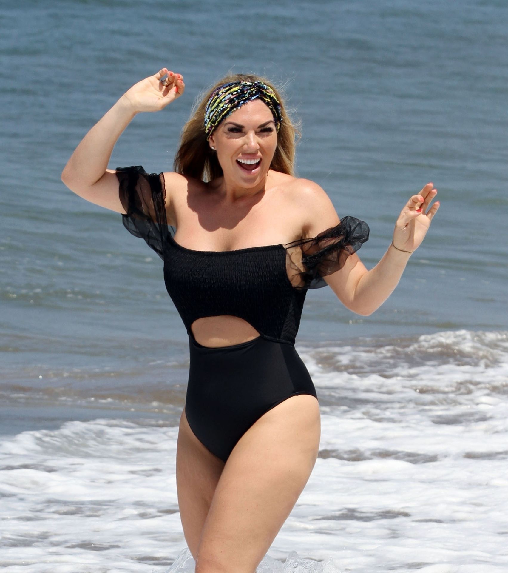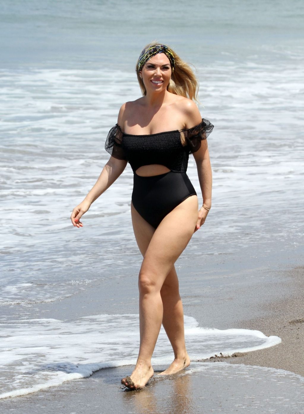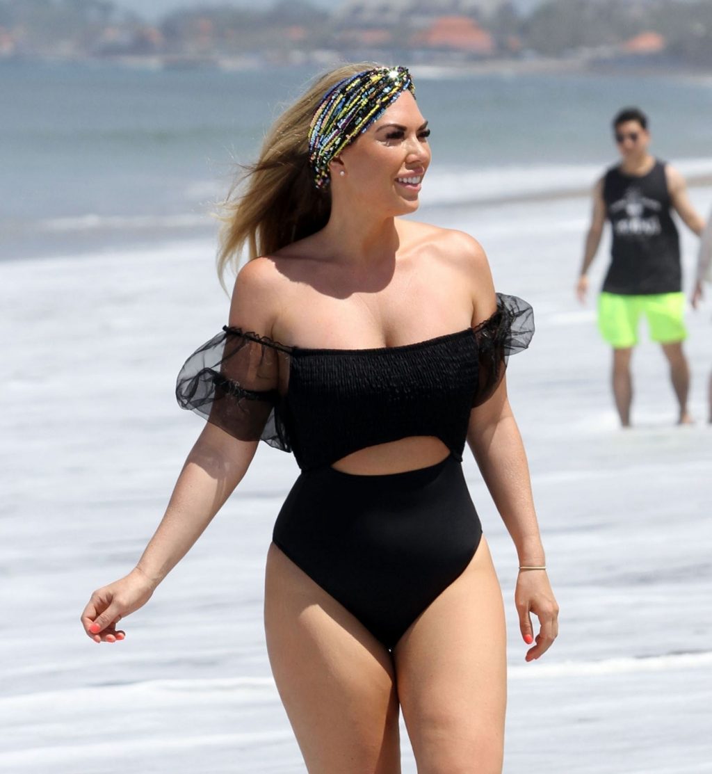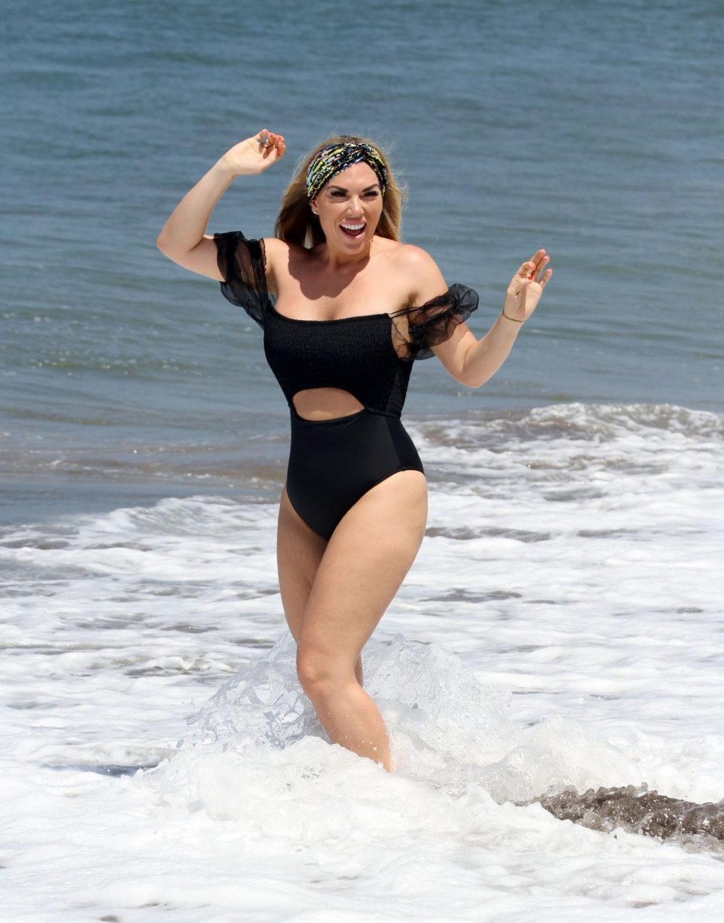 La star de la télé-réalité Frankie Essex affiche sa récente perte de poids en vacances à Tenerife, 01/03/2020. Frankie est vue en maillot de bain noir alors qu’elle saute hors de la mer sur l’île espagnole.