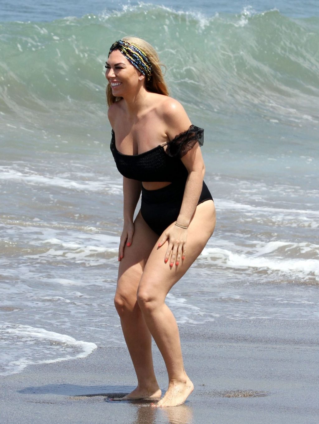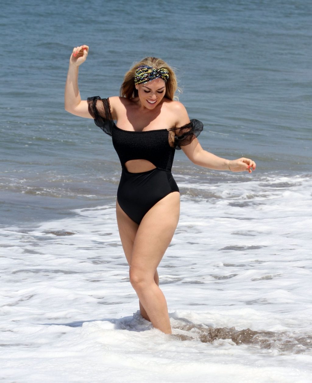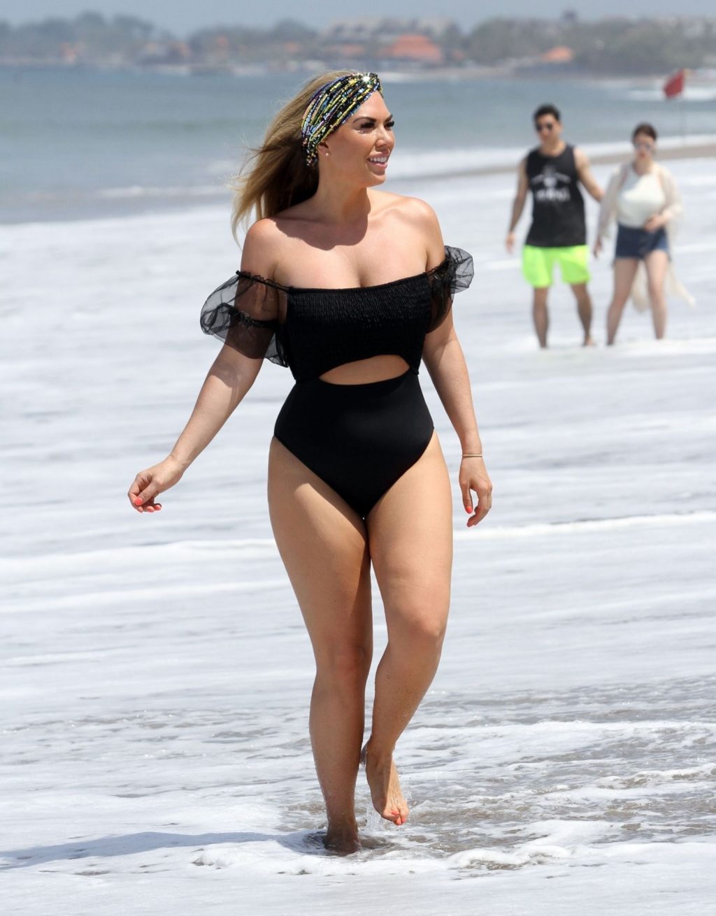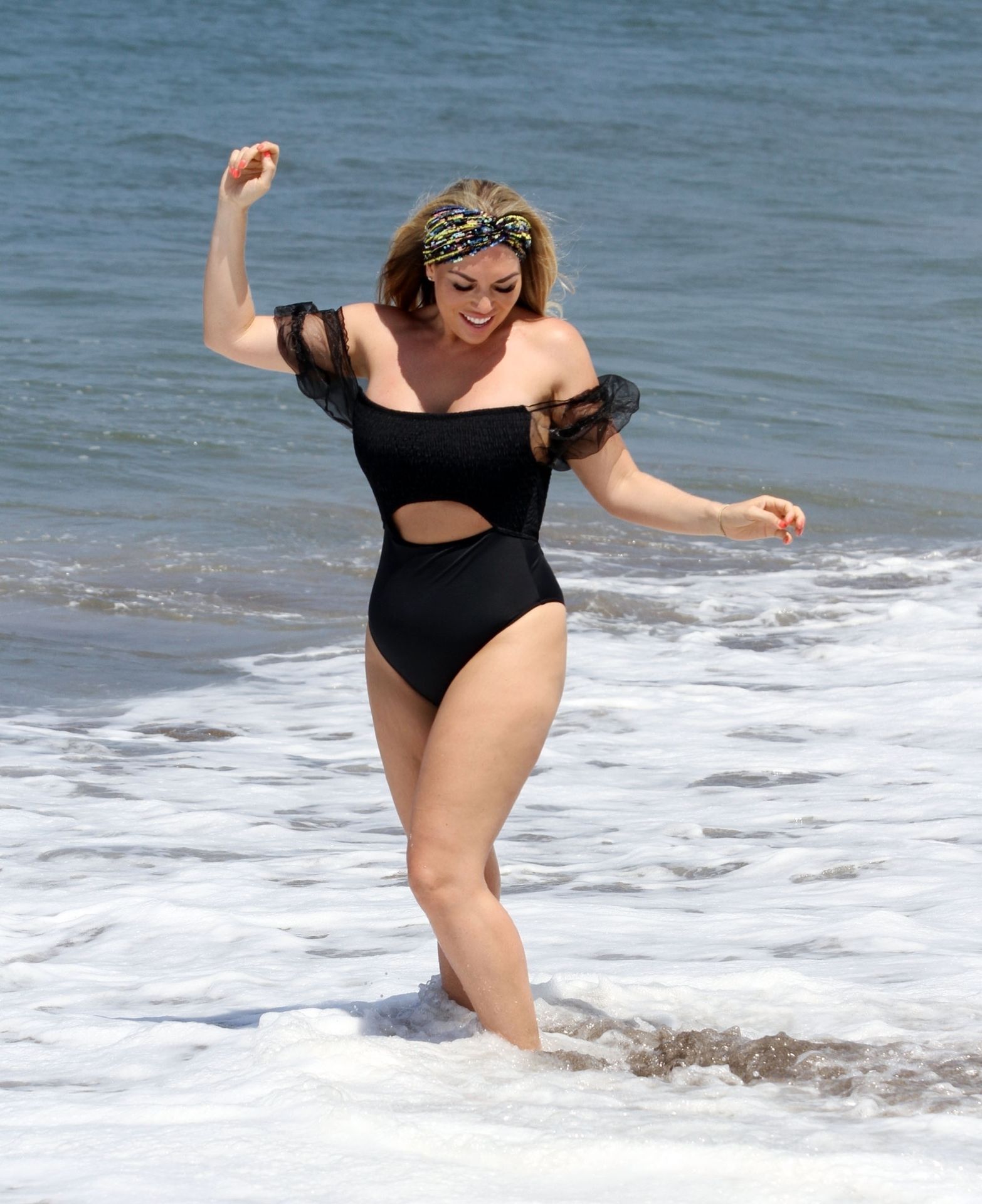 La star de la télé-réalité Frankie Essex affiche sa récente perte de poids en vacances à Tenerife, 01/03/2020. Frankie est vue en maillot de bain noir alors qu’elle saute hors de la mer sur l’île espagnole.