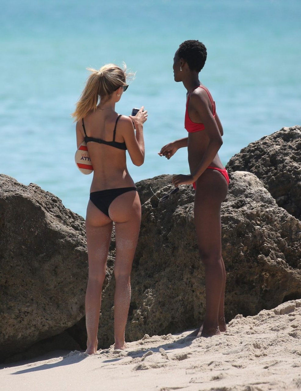 Les mannequins Frida Aasen et Herieth Paul portent des bikinis très légers alors qu’elles se rendent à la plage à Miami, 23/03/2019.