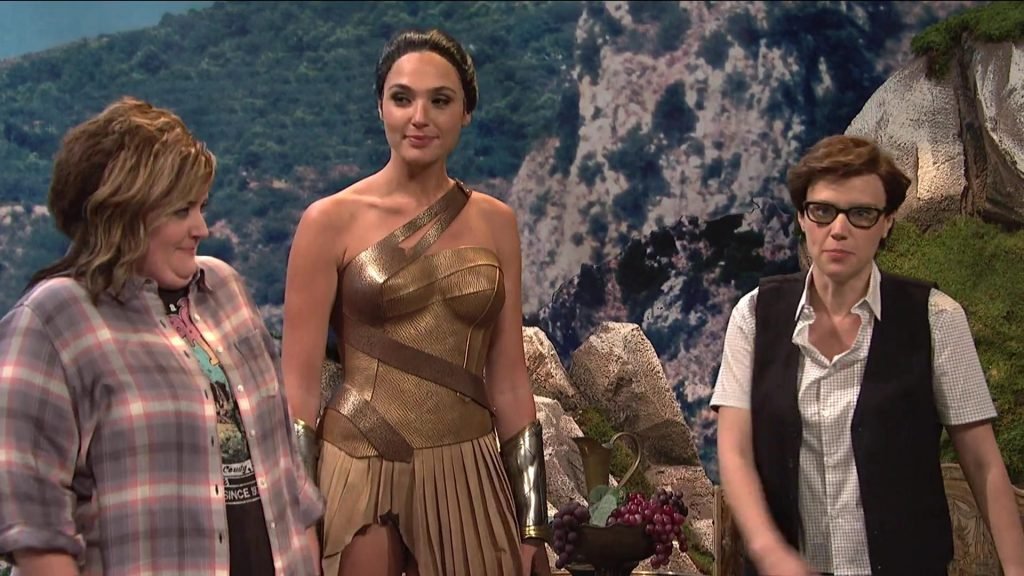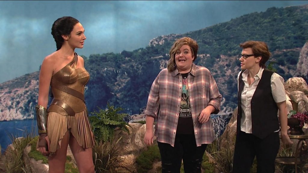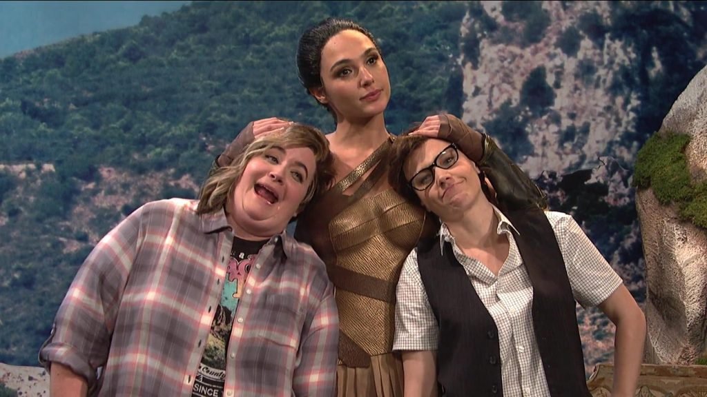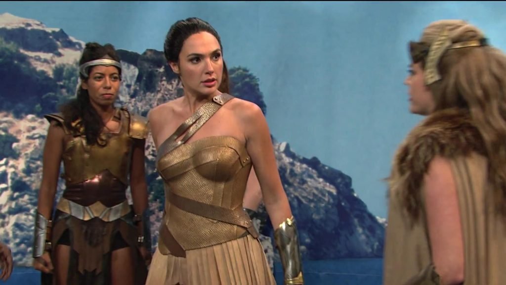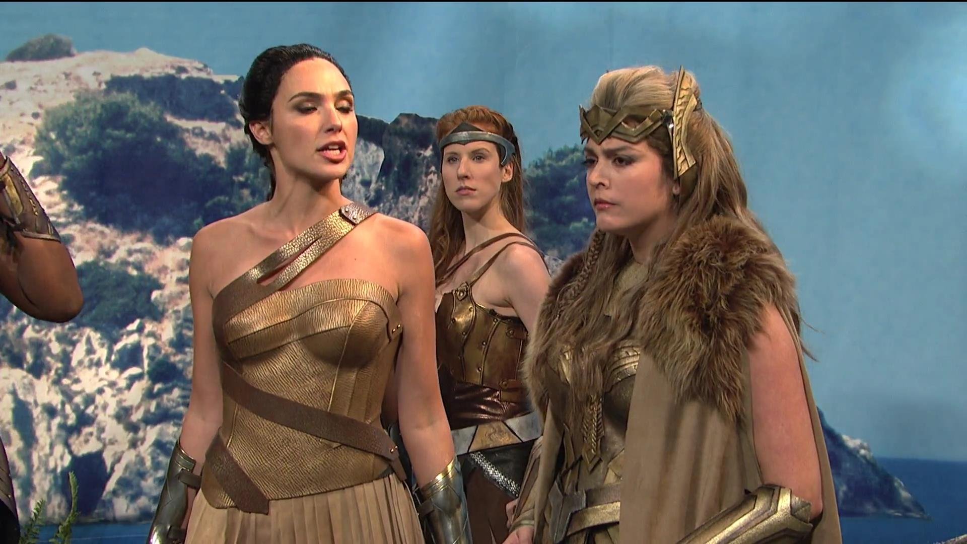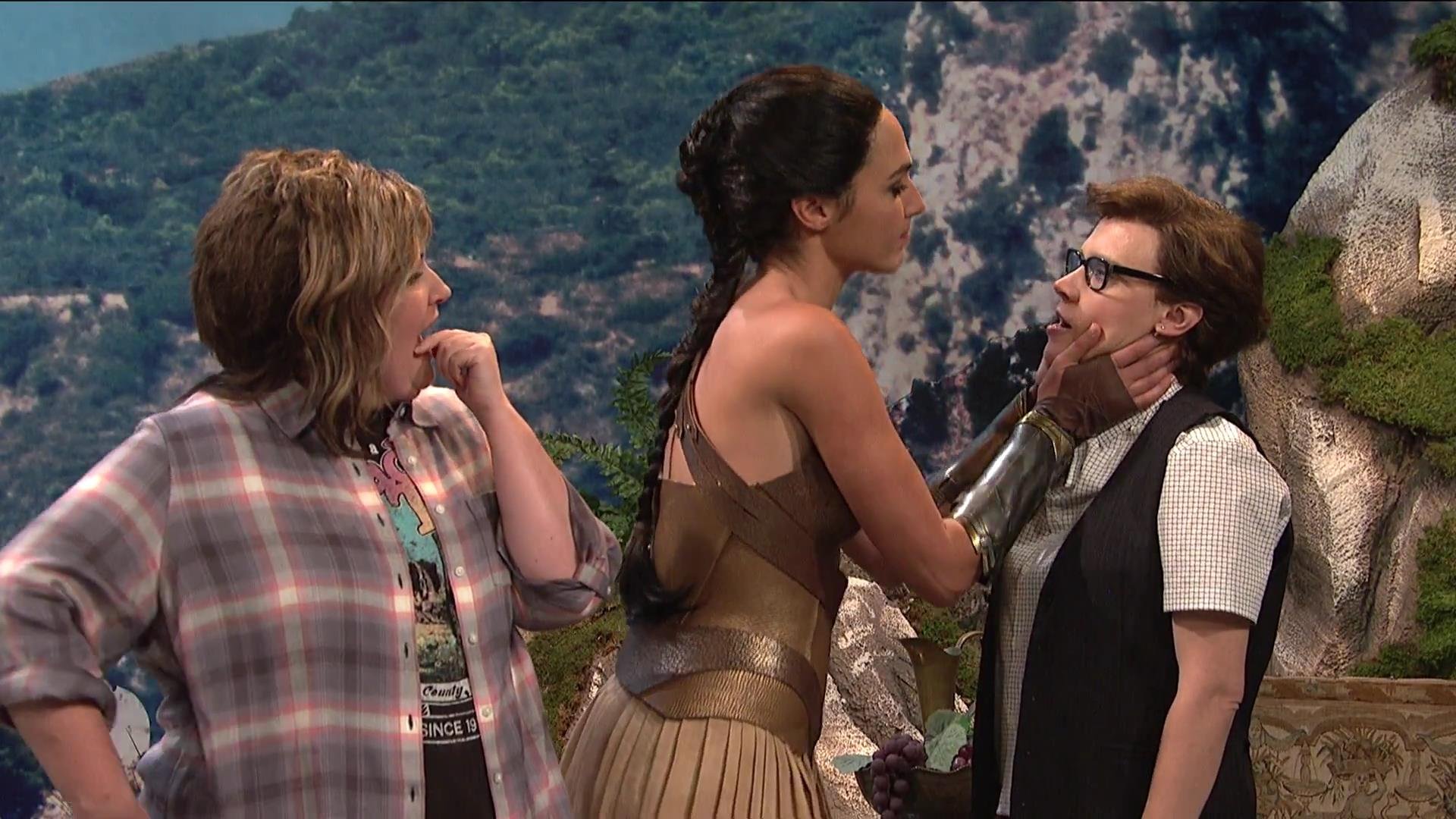 Lorsque deux femmes (Aidy Bryant, Kate McKinnon) tombent sur Themyscira, elles sont surprises d’apprendre que ses habitantes (Gal Gadot, Leslie Jones, Melissa Villaseñor, Heidi Gardner) ne sont pas ce à quoi elles s’attendaient. Saturday Night Live (Saison 43 / Épisode 2, 08/10/2017). Gal Gadot est une actrice israélienne (Wonder Woman) & mannequin. Âge – 32 ans (30 avril 1985).