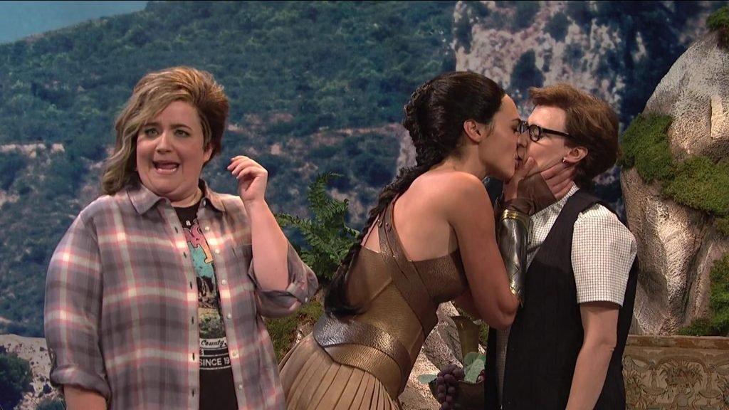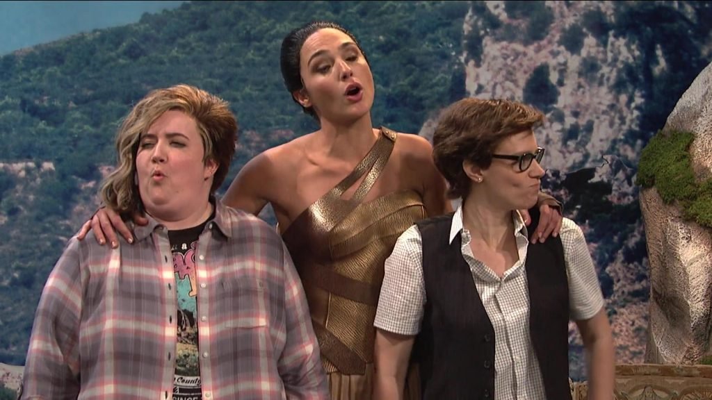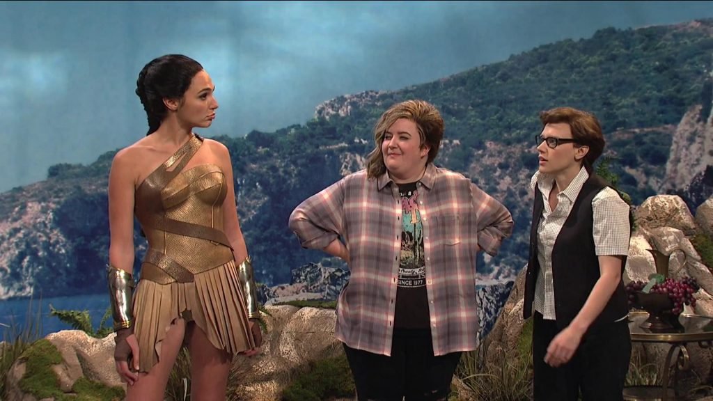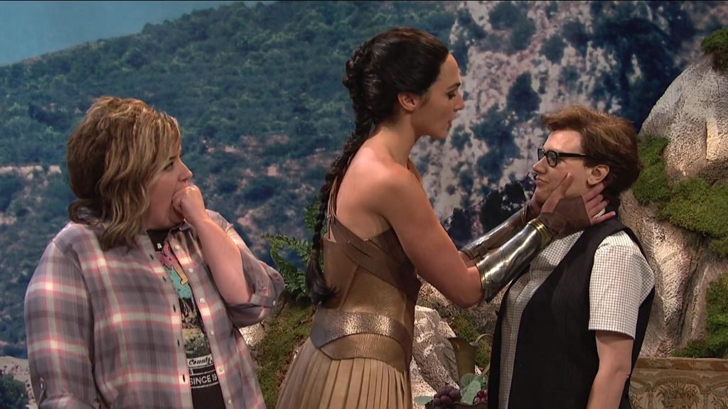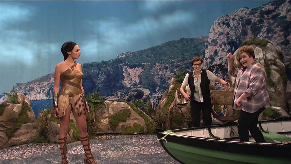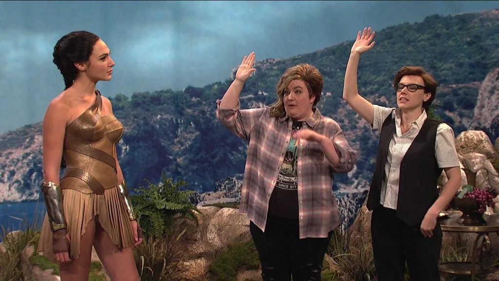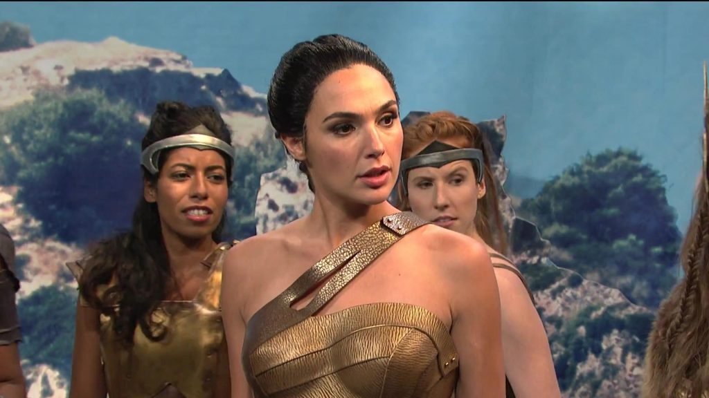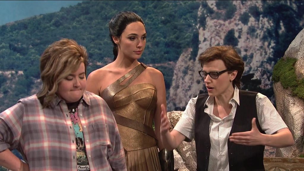 Lorsque deux femmes (Aidy Bryant, Kate McKinnon) tombent sur Themyscira, elles sont surprises d’apprendre que ses habitantes (Gal Gadot, Leslie Jones, Melissa Villaseñor, Heidi Gardner) ne sont pas ce à quoi elles s’attendaient. Saturday Night Live (Saison 43 / Épisode 2, 08/10/2017). Gal Gadot est une actrice israélienne (Wonder Woman) & mannequin. Âge – 32 ans (30 avril 1985).
