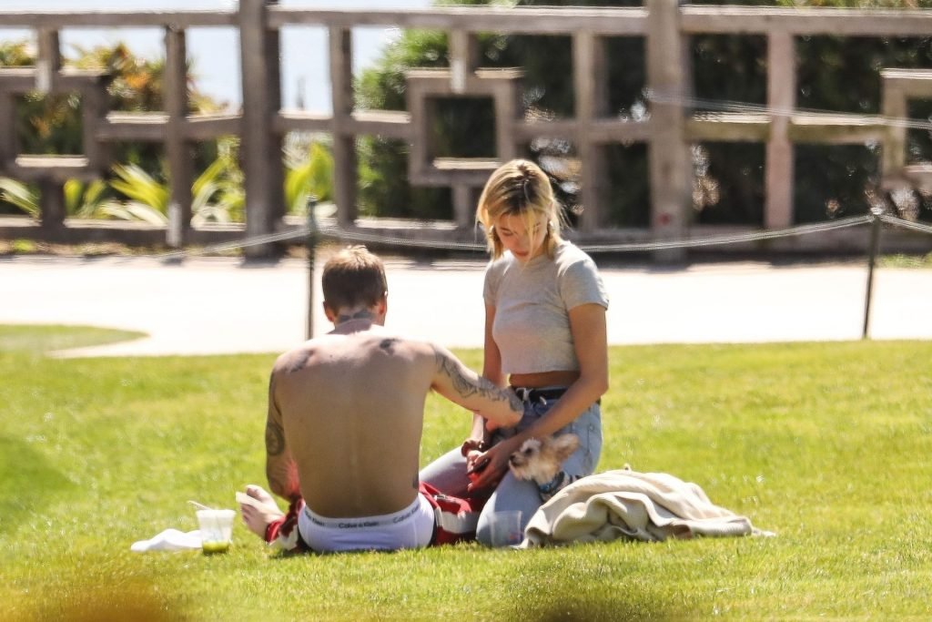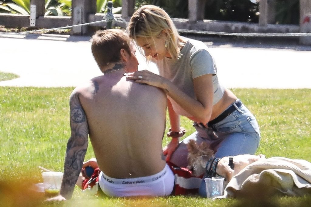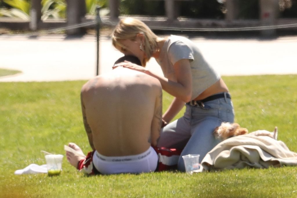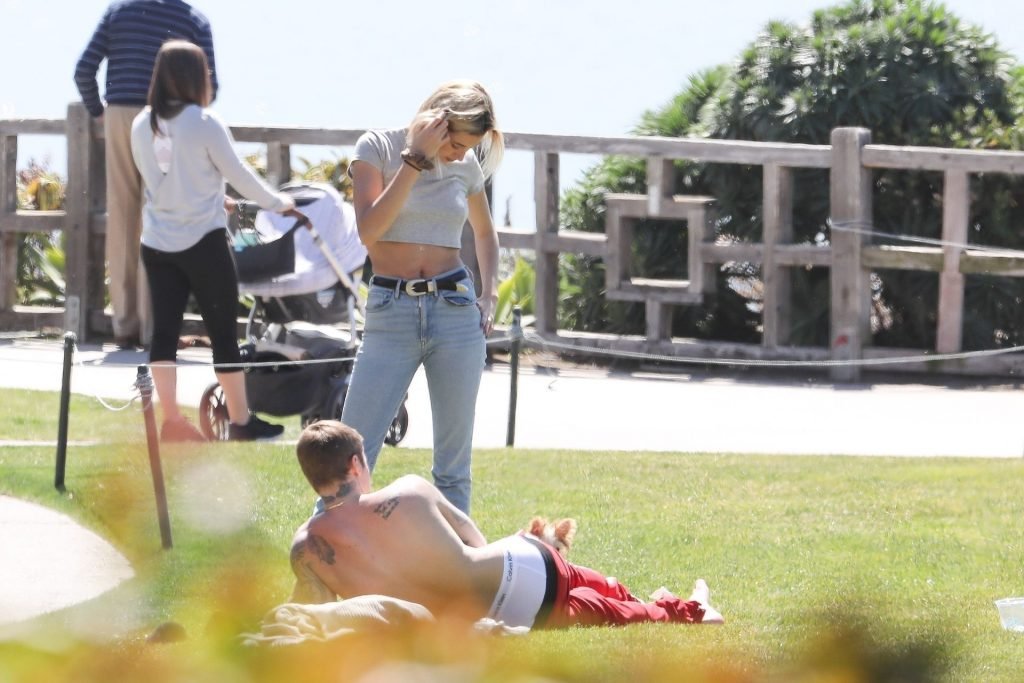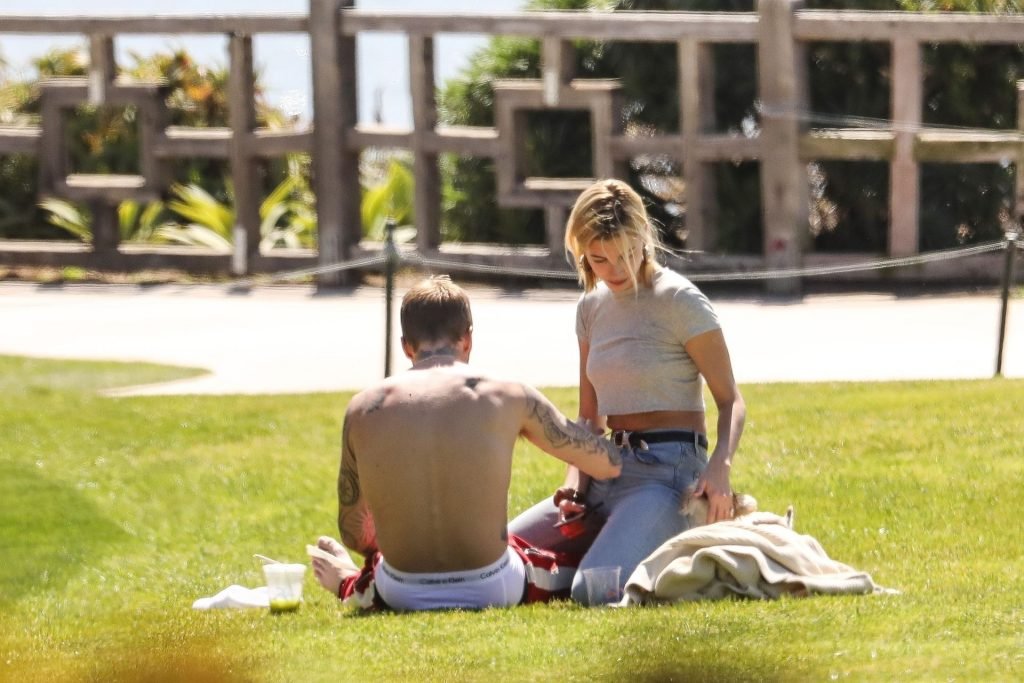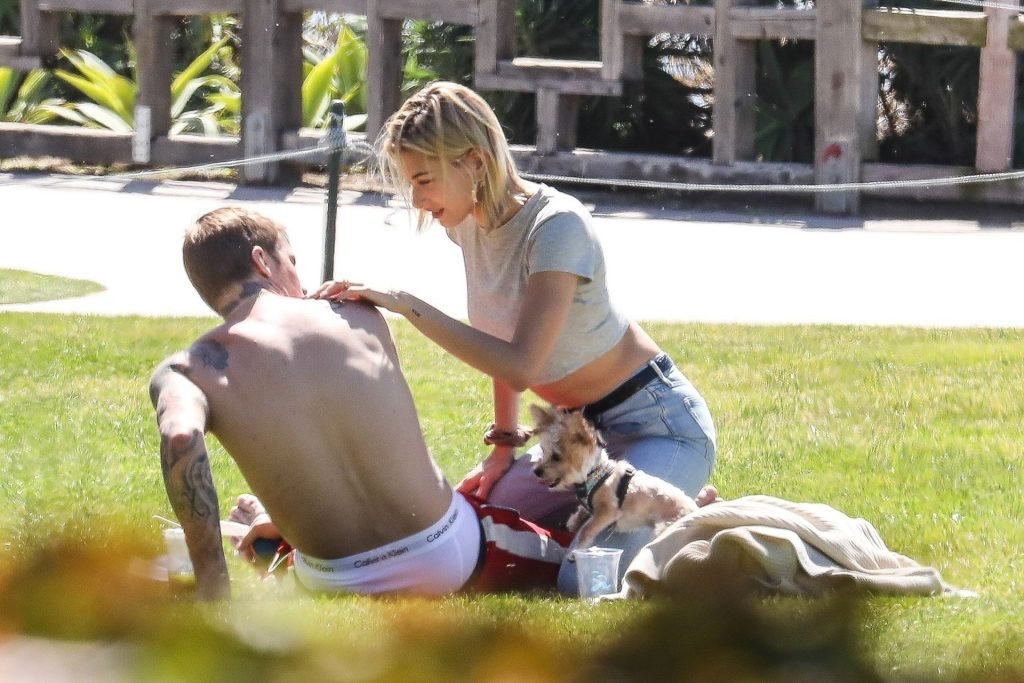 Après une promenade sur la plage, le couple prend quelques minutes pour se détendre sur l’herbe. Justin semble abattu alors qu’il baisse la tête et fait asseoir Hailey sur ses genoux, qui le réconforte en lui caressant doucement les cheveux.