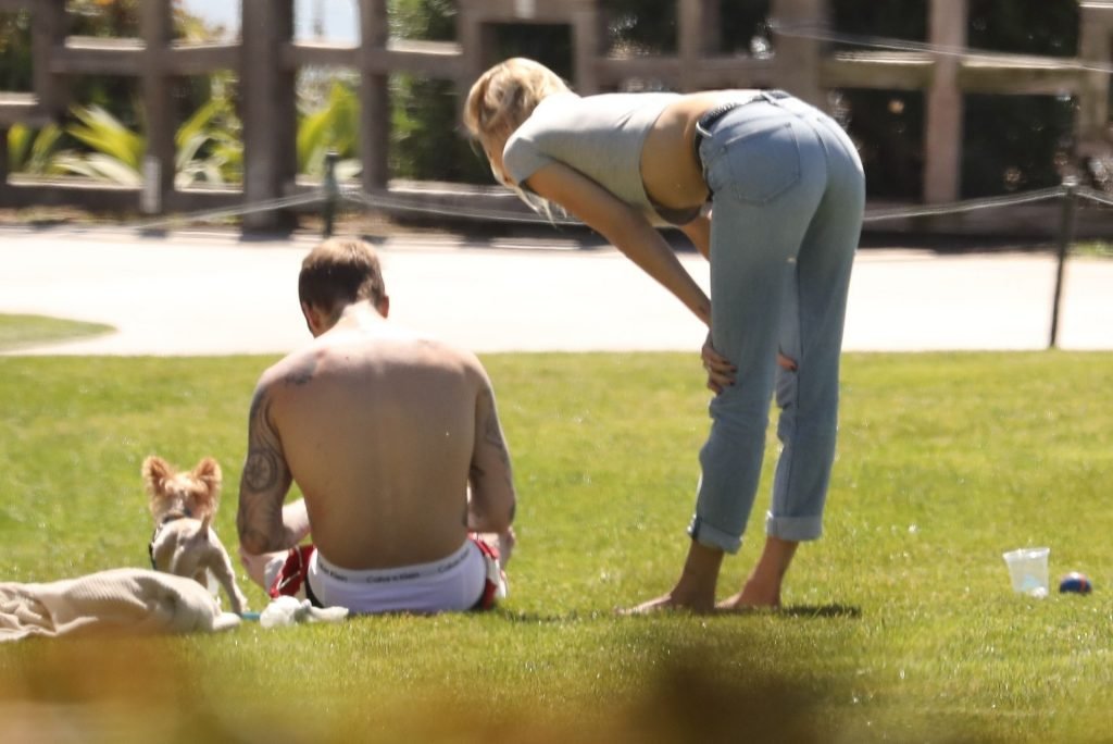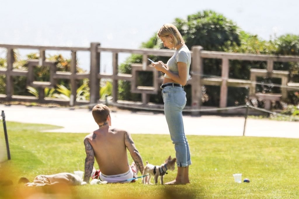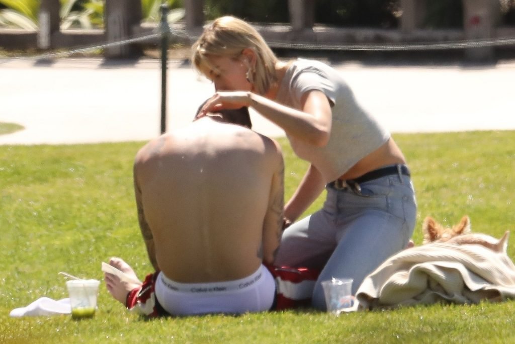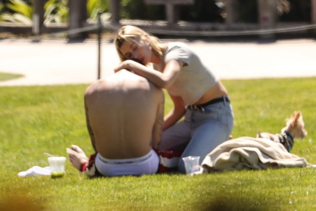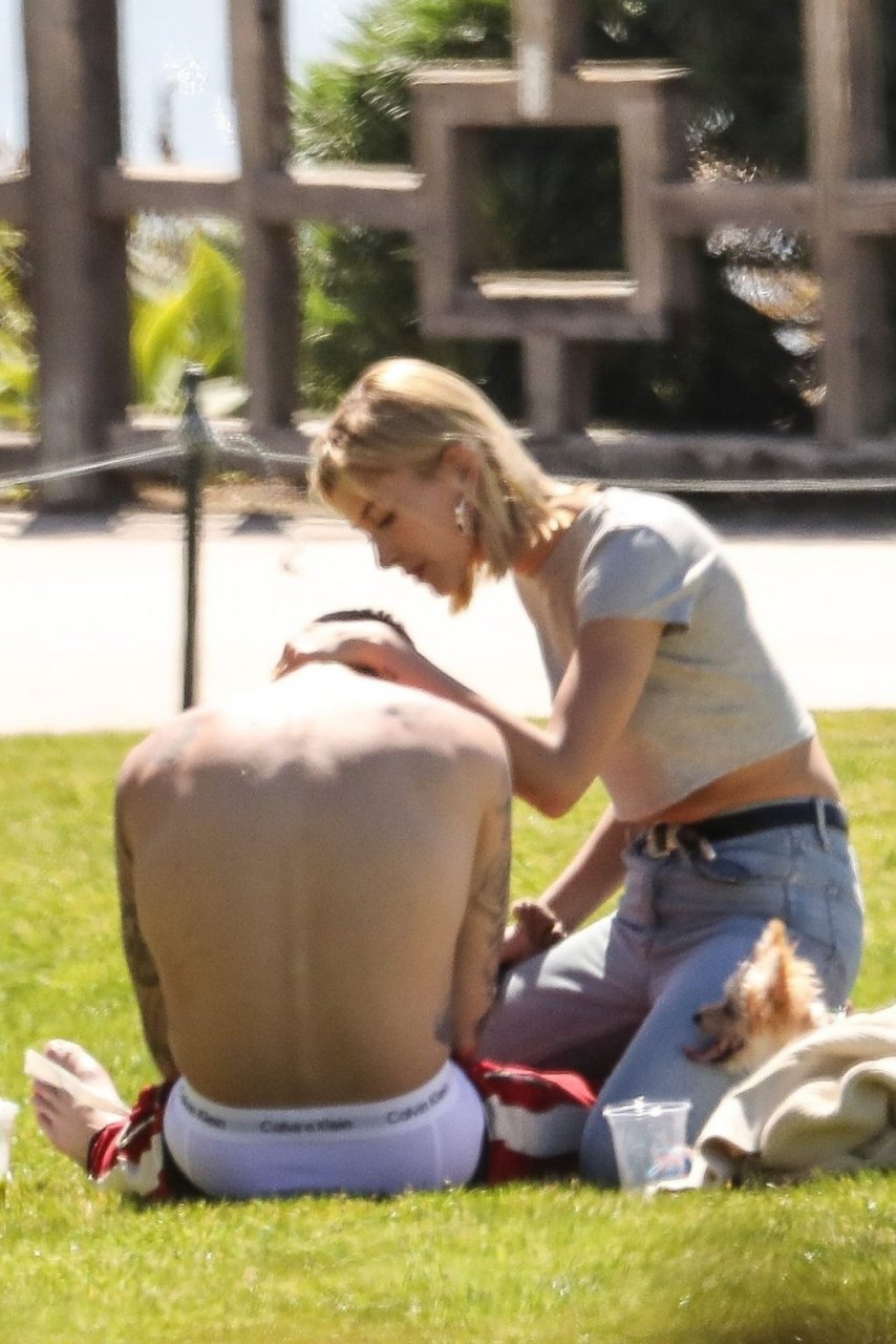Après une promenade sur la plage, le couple prend quelques minutes pour se détendre sur l’herbe. Justin semble abattu alors qu’il baisse la tête et fait asseoir Hailey sur ses genoux, qui le réconforte en lui caressant doucement les cheveux.