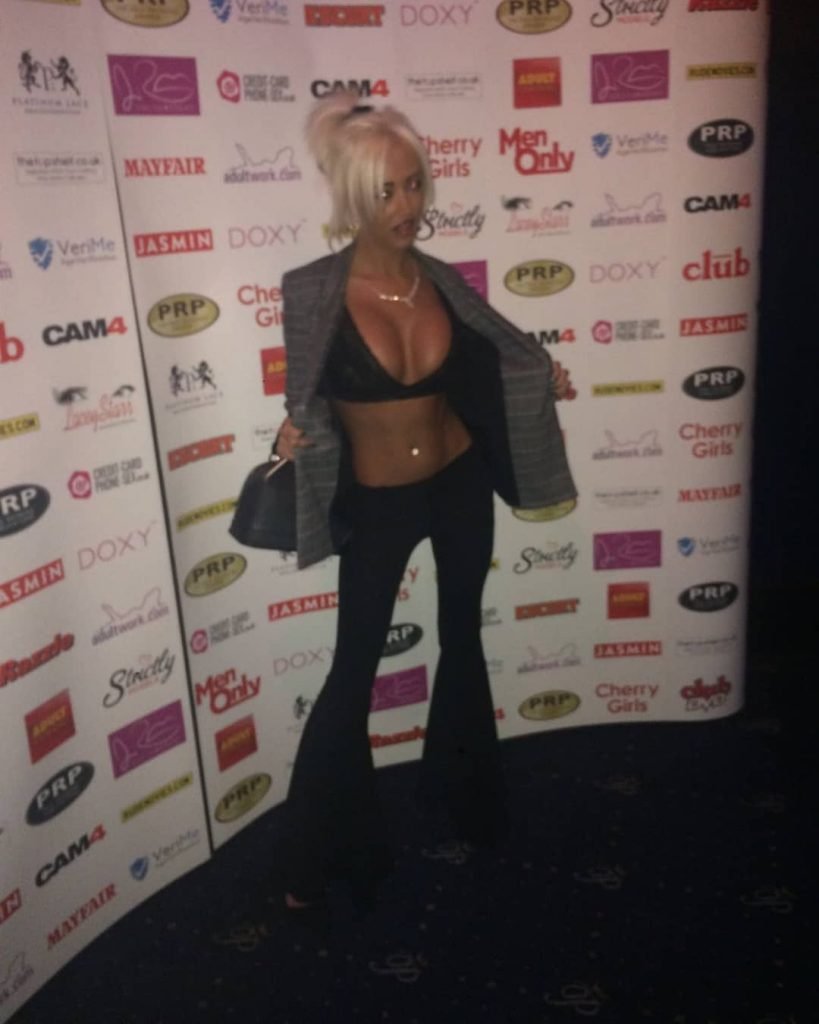Kerrie-Lee Cowan exhibe ses gros faux seins aux Paul Raymond Awards 2017 à Londres, 11/09/2017. Kerrie-Lee Cowan est un modèle adulte anglais.