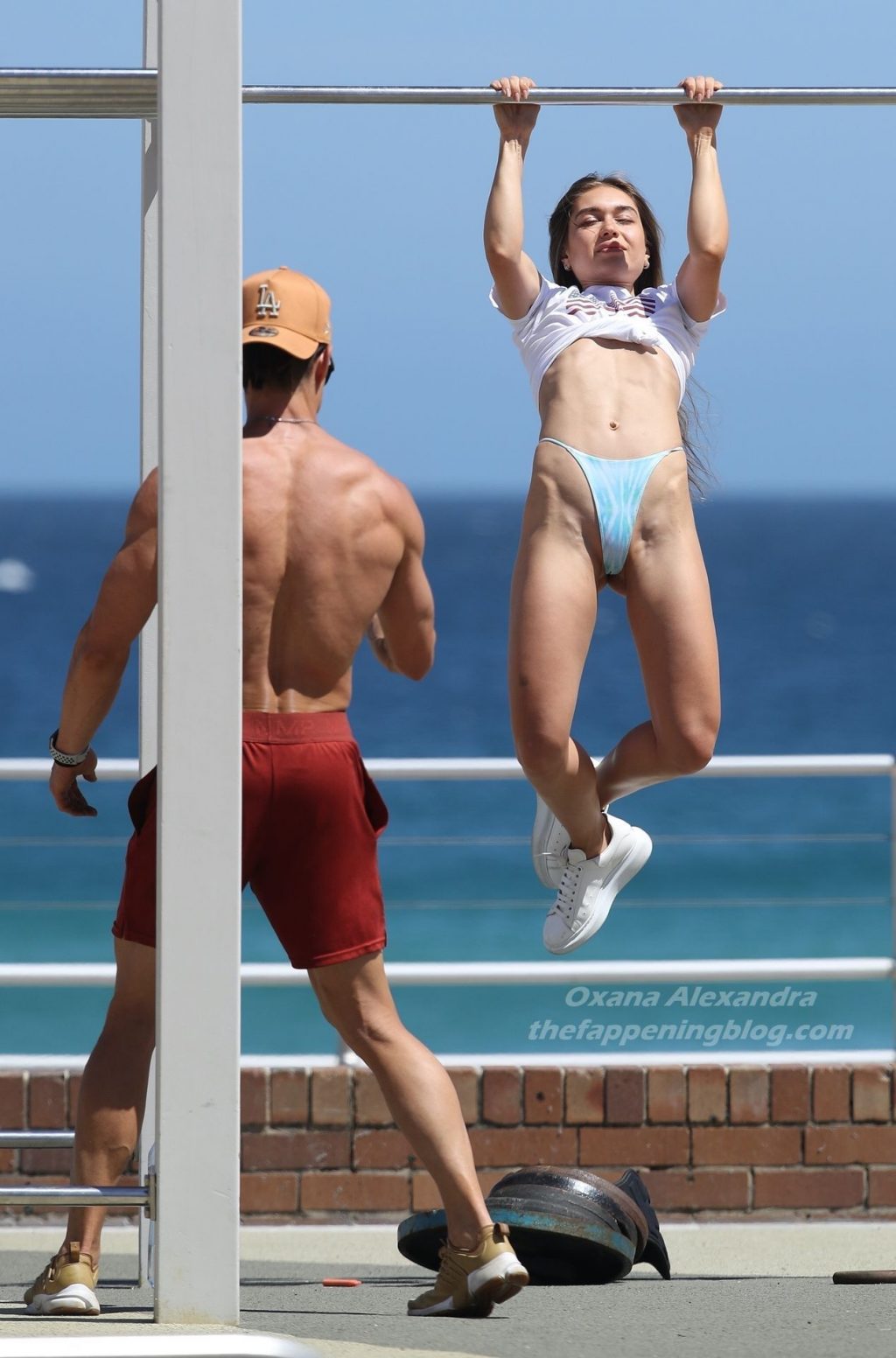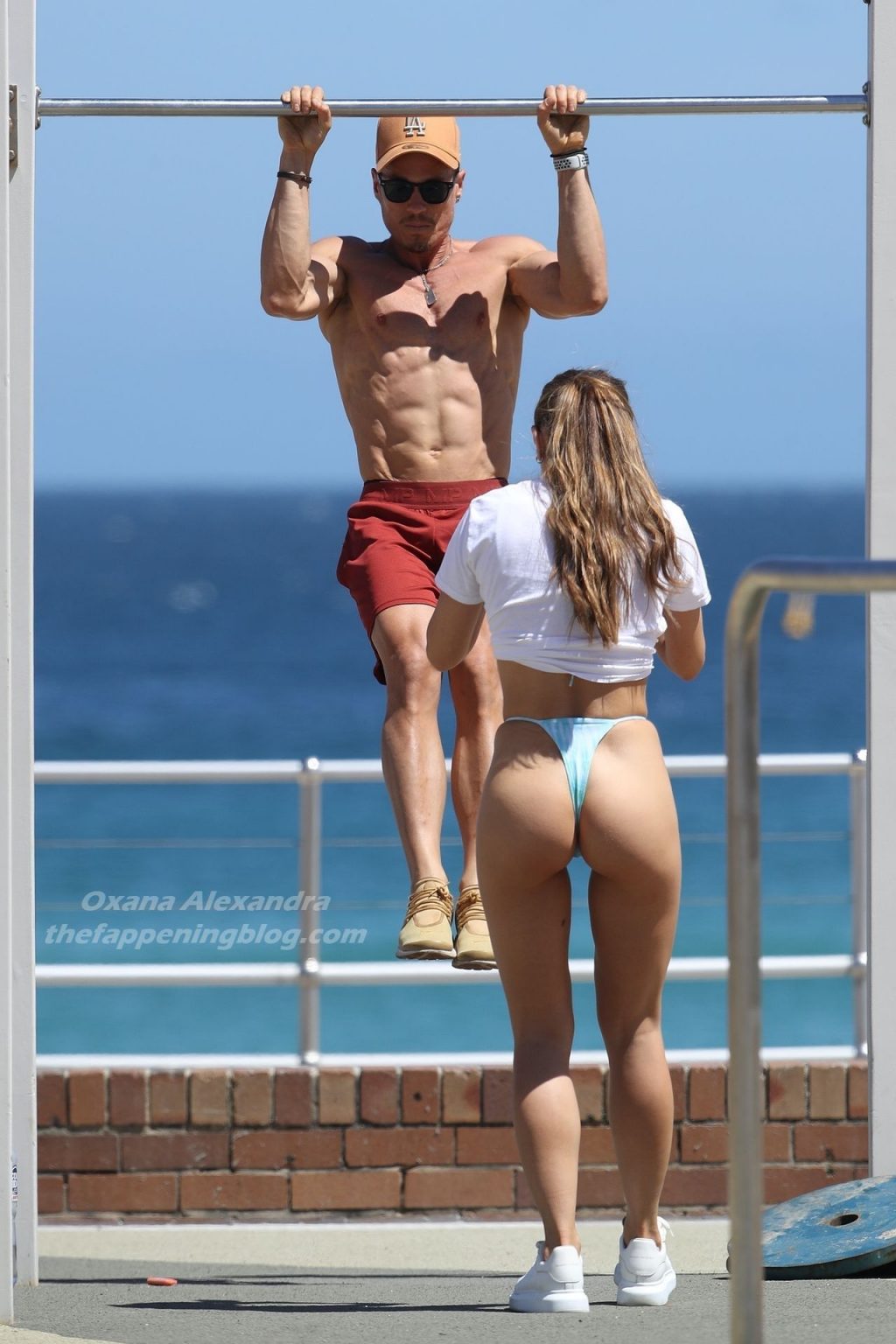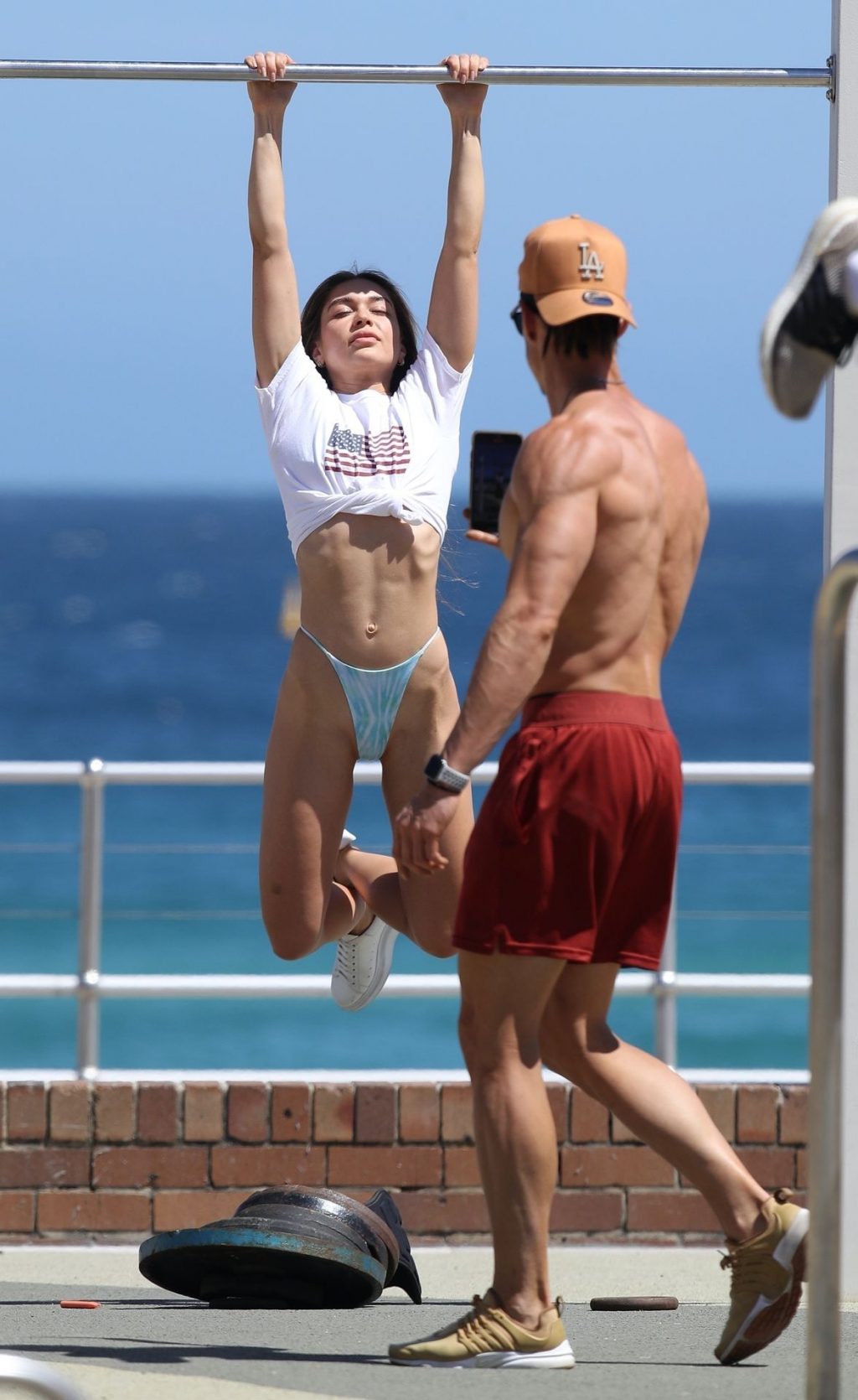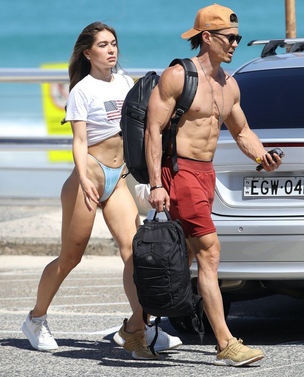 Accros au fitness ! Oxana Alexandra et son partenaire Mark Edward Greenham se filment en montrant leurs compétences en fitness à Sydney, le 11/11/2020.