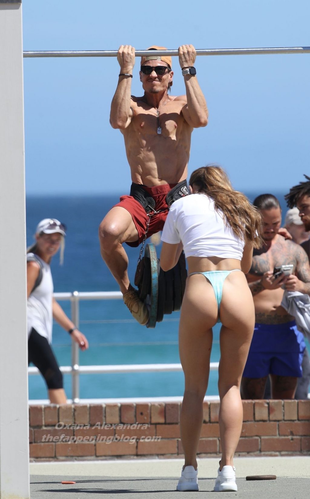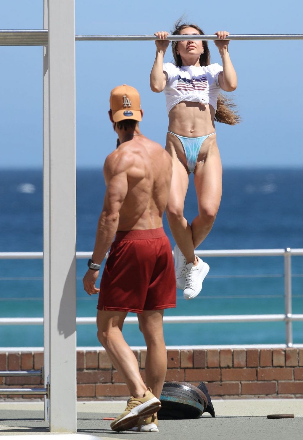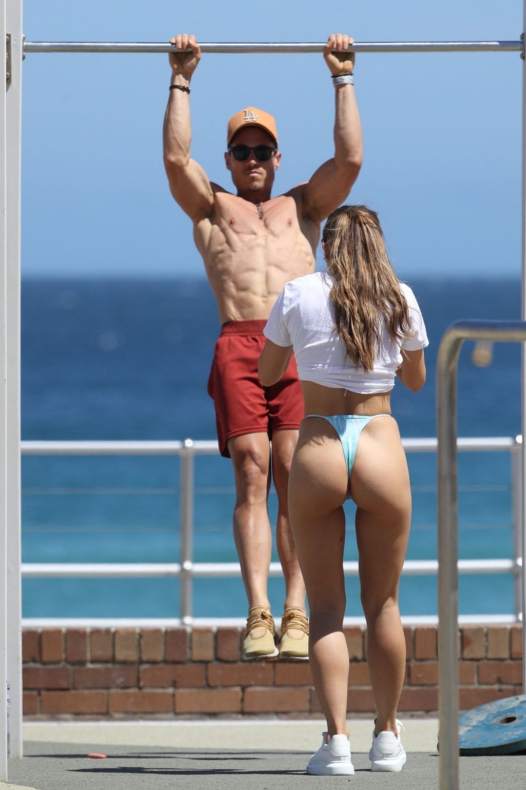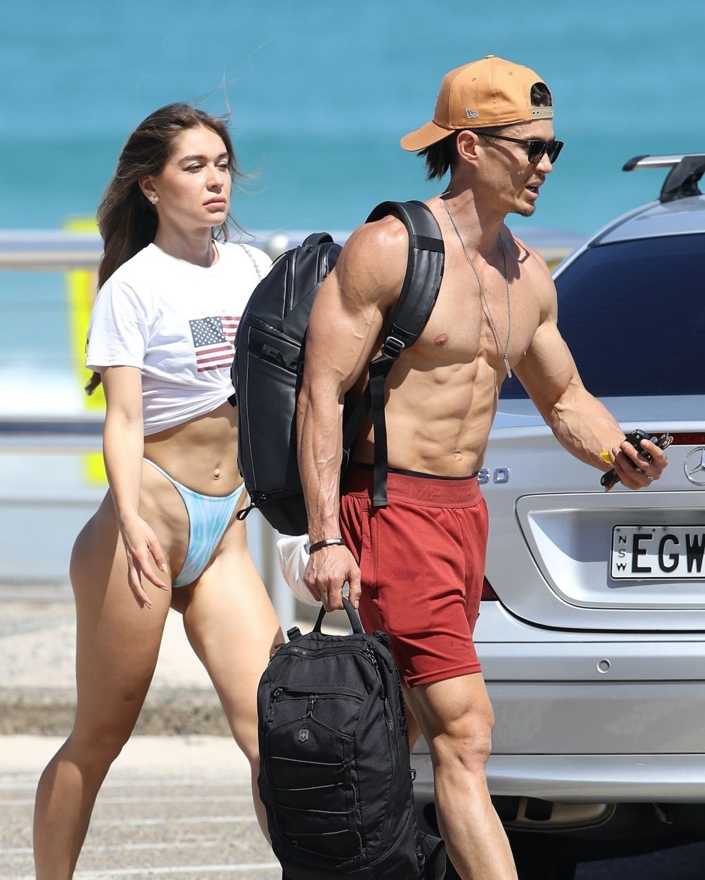 Accros au fitness ! Oxana Alexandra et son partenaire Mark Edward Greenham se filment en montrant leurs compétences en fitness à Sydney, le 11/11/2020.
