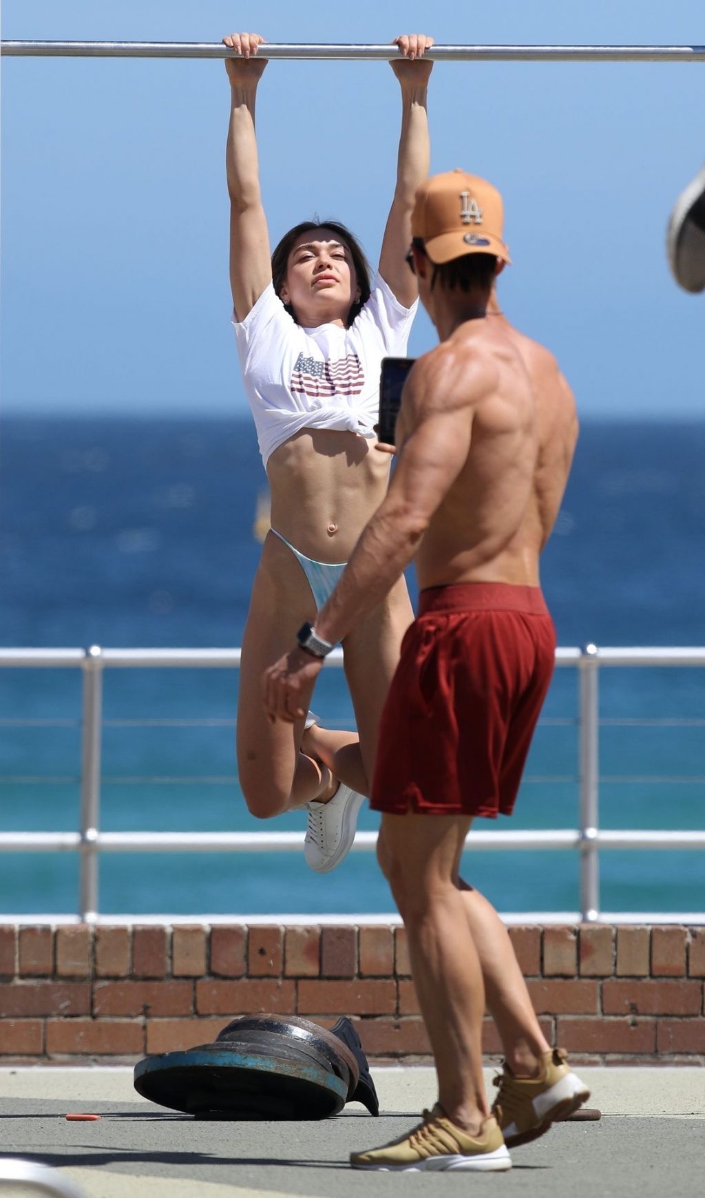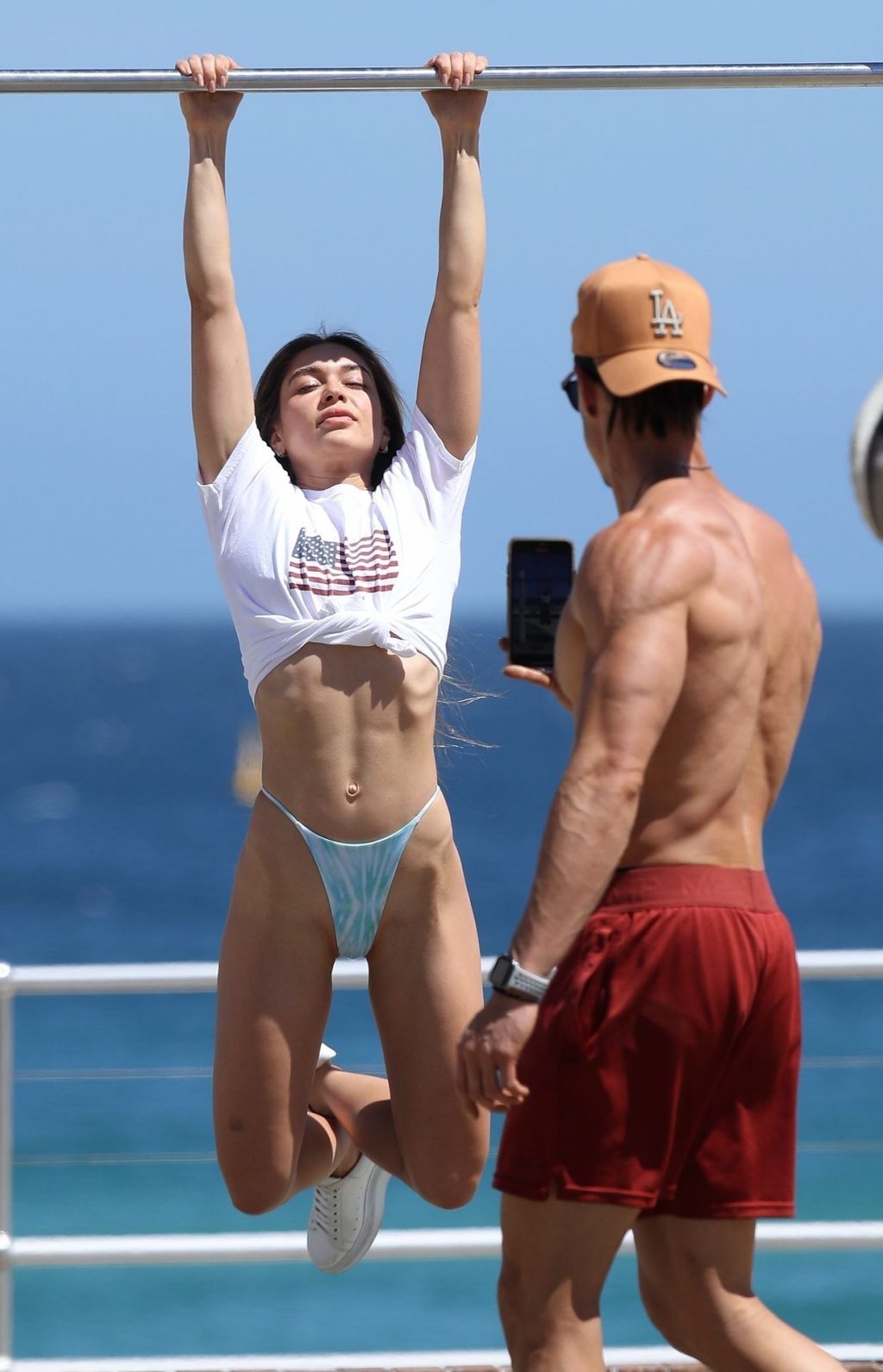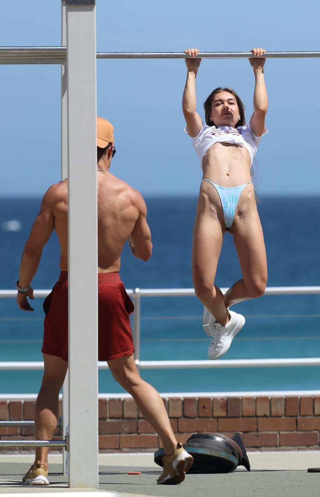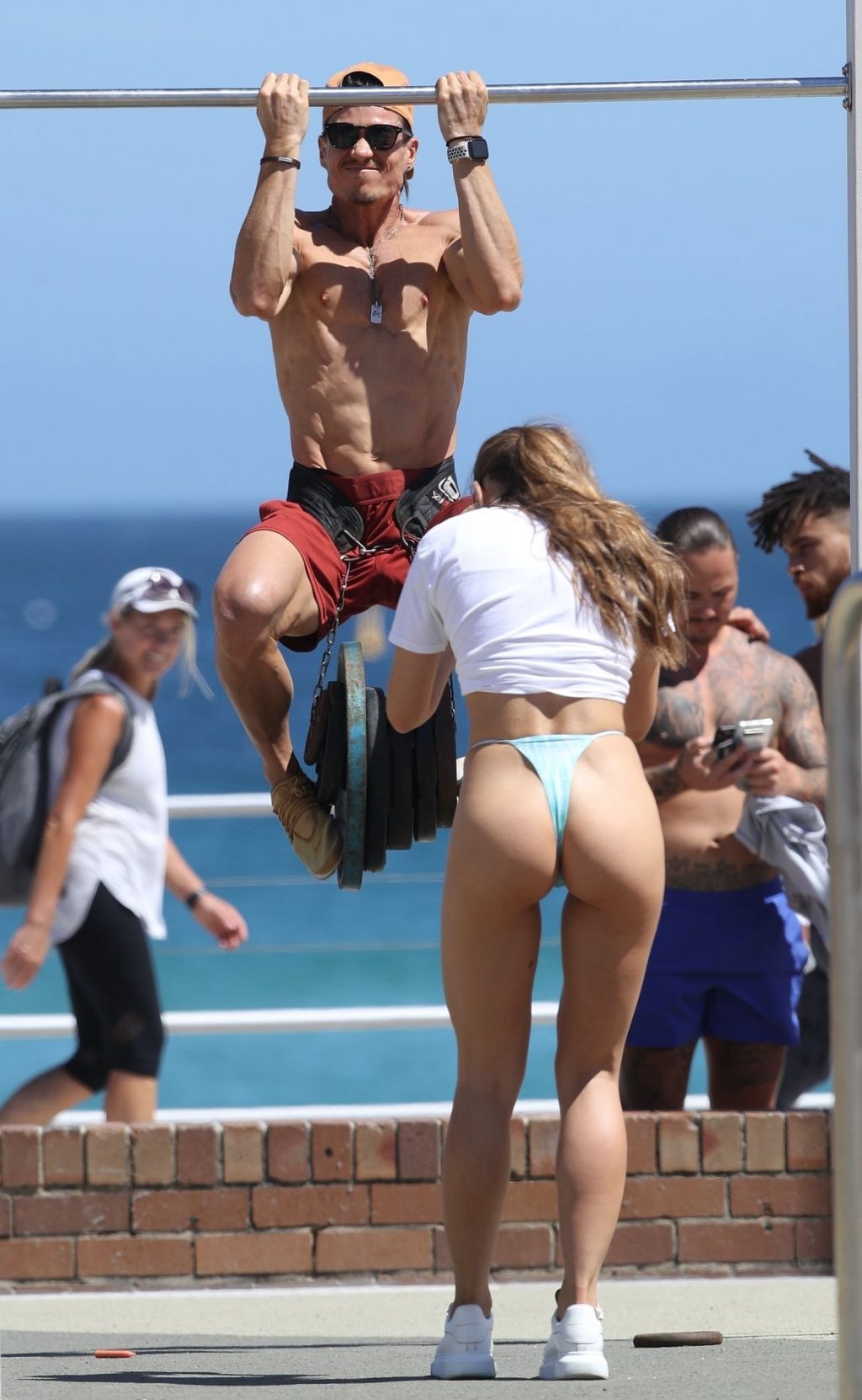 Accros au fitness ! Oxana Alexandra et son partenaire Mark Edward Greenham se filment en montrant leurs compétences en fitness à Sydney, le 11/11/2020.