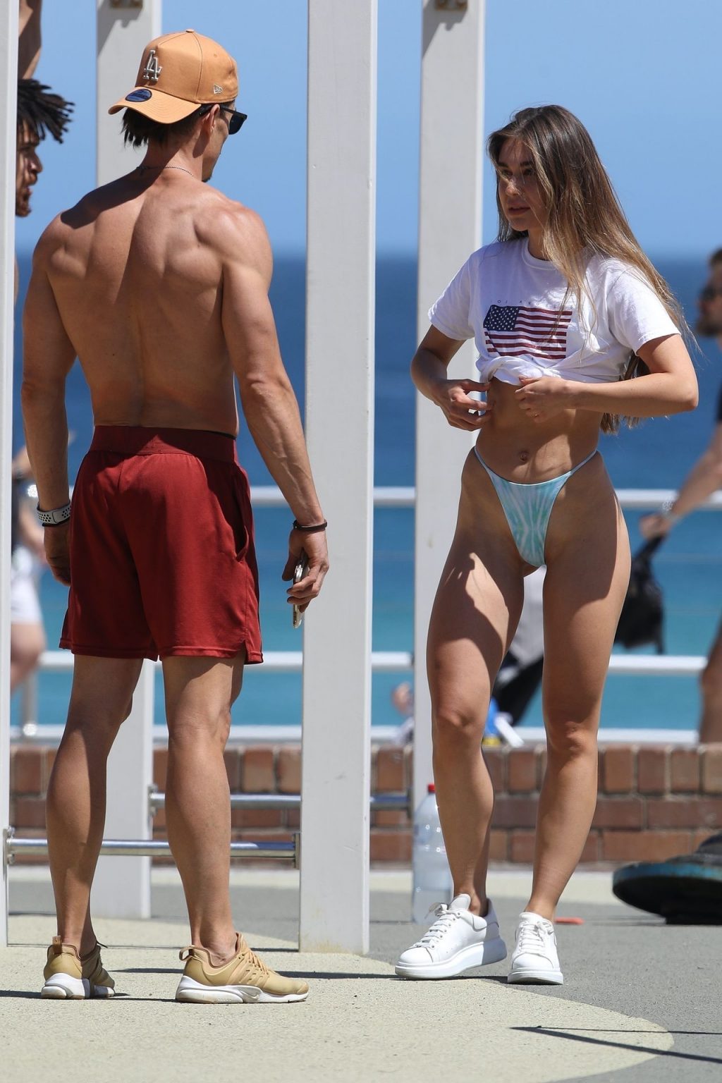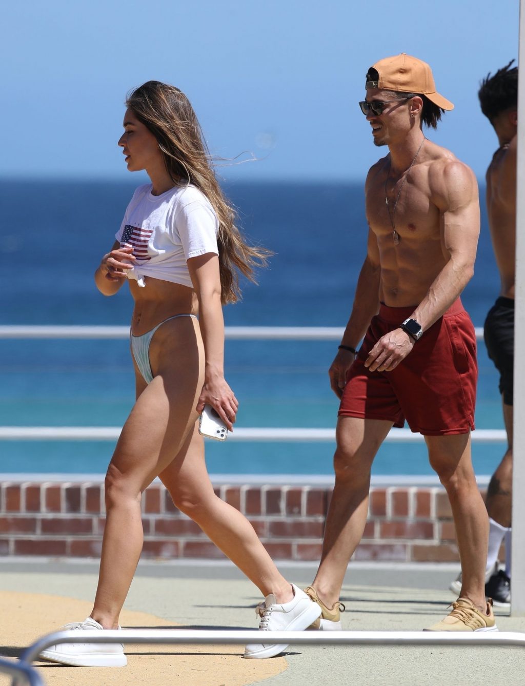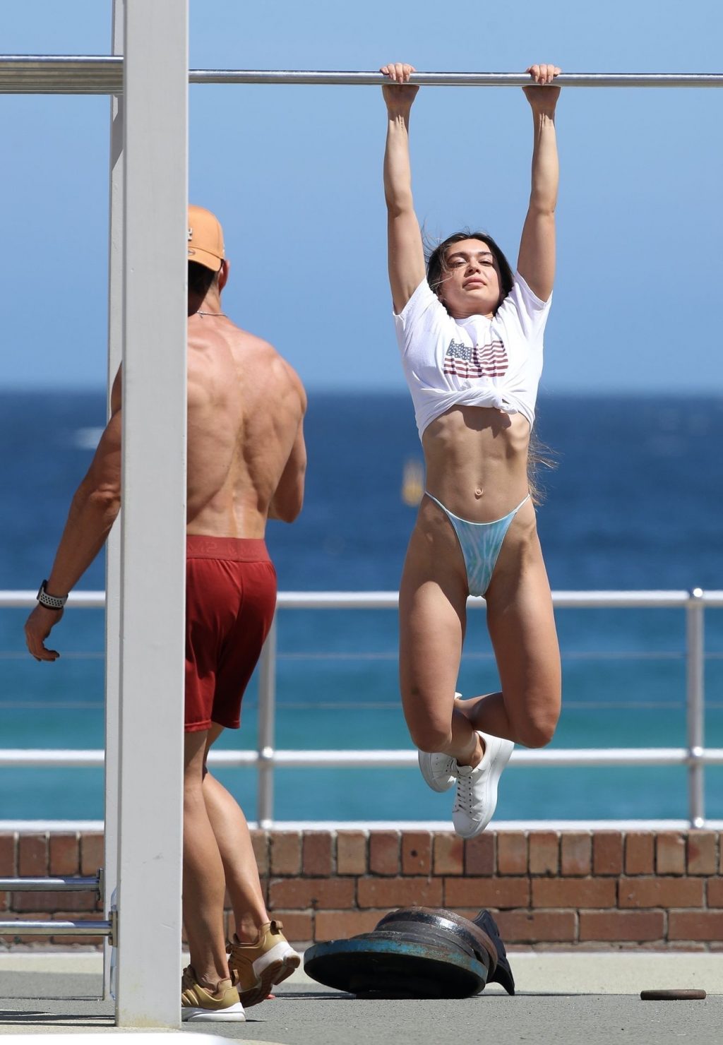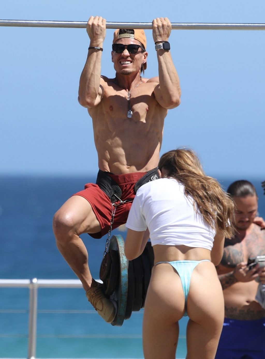 Accros au fitness ! Oxana Alexandra et son partenaire Mark Edward Greenham se filment en montrant leurs compétences en fitness à Sydney, le 11/11/2020.