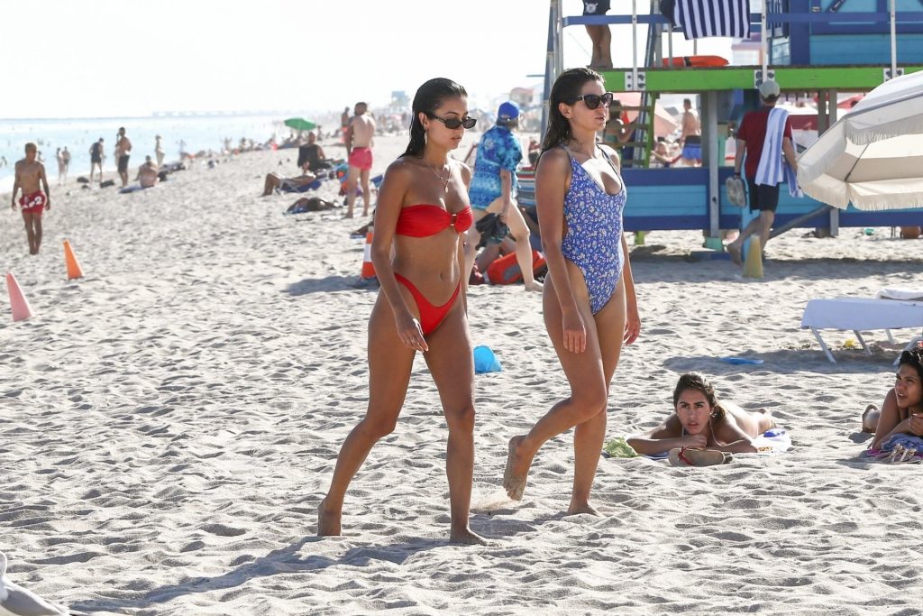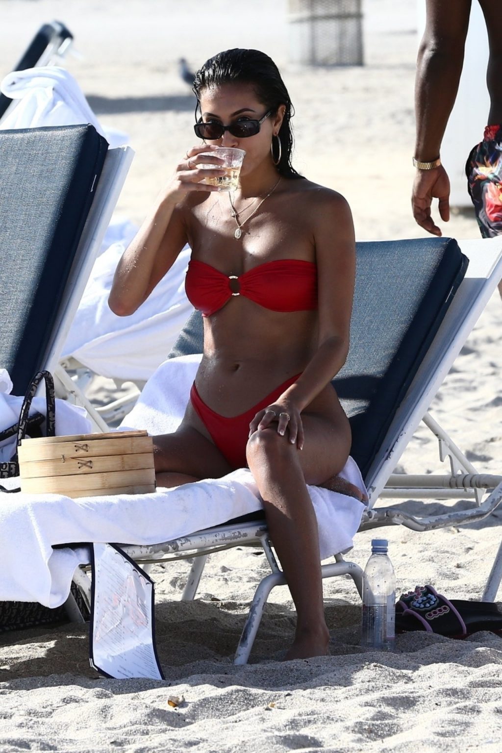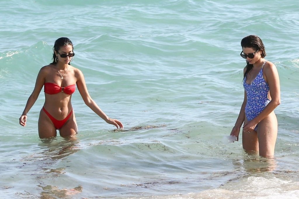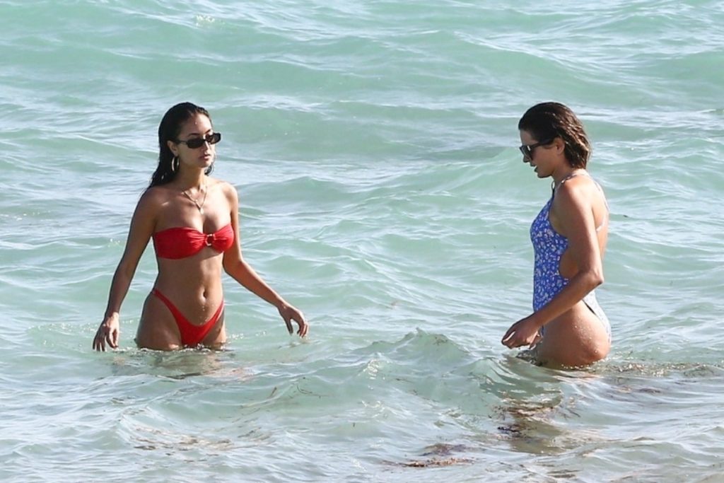 Le mannequin guyanien-canadien Racquel Natasha profite d’un repos au bord de la plage dans un bikini rouge sexy – Miami, 12/11/2019. Natasha était accompagnée d’une amie en bikini pour cette sortie.