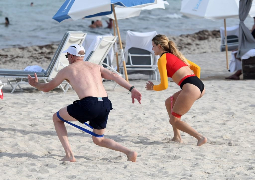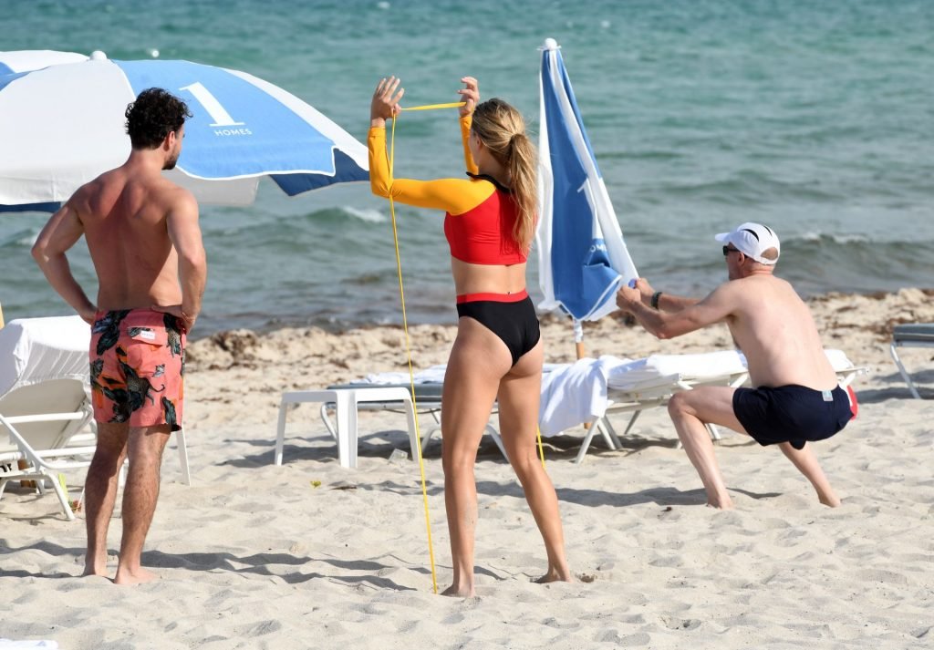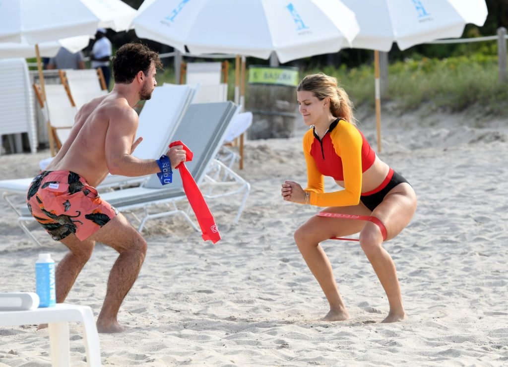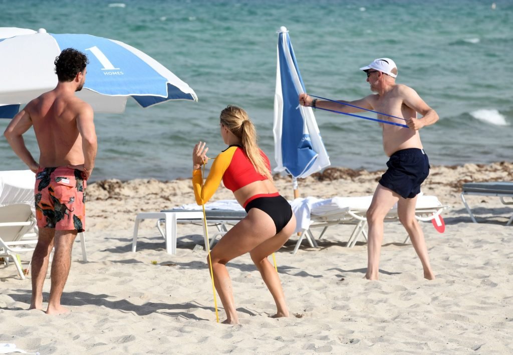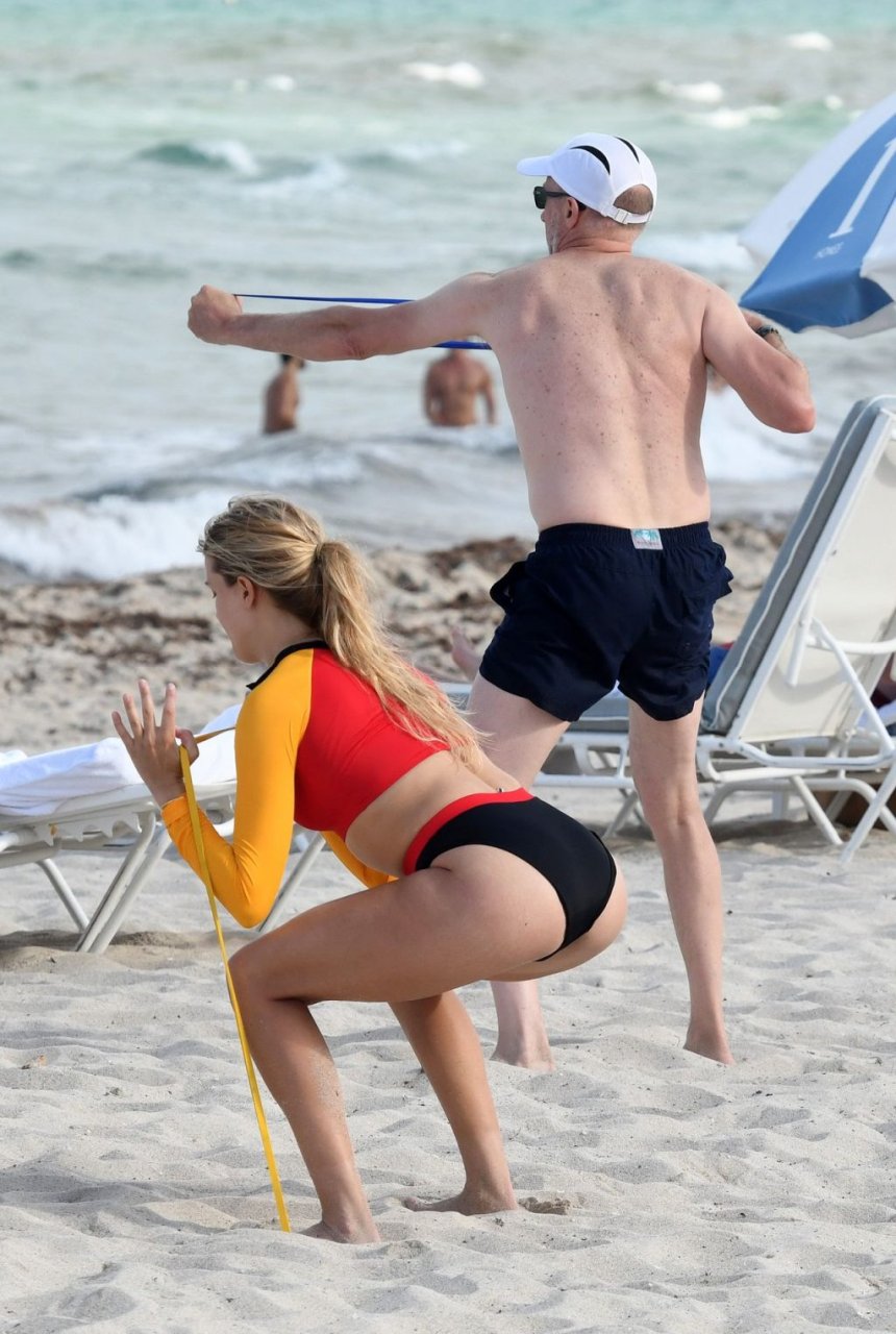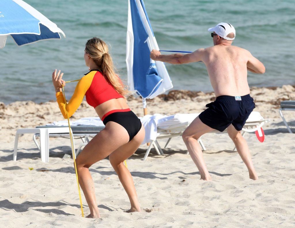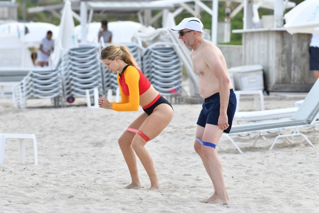 Eugenie Bouchard est mise à l’épreuve par son entraîneur personnel musclé alors qu’elle effectue un entraînement intense sur la plage avec son père Mike – Miami, 18/05/2019. La joueuse de tennis canadienne portait un haut de bikini à manches longues et un bas de bikini assorti, mettant en valeur sa silhouette incroyable alors qu’elle réalisait un entraînement varié avec des bandes de résistance et un ballon, son père Mike participant à l’action.