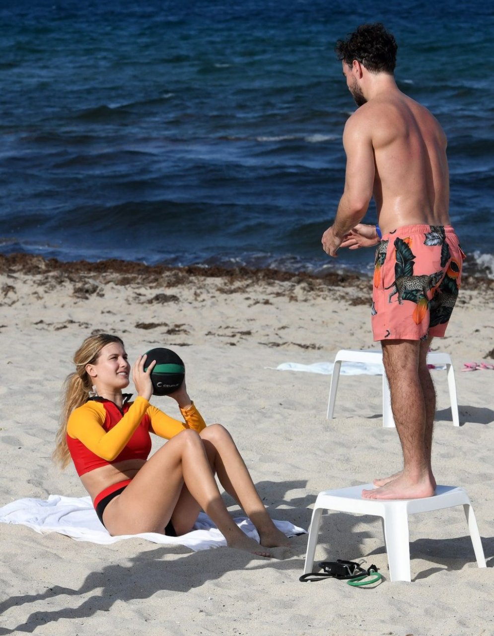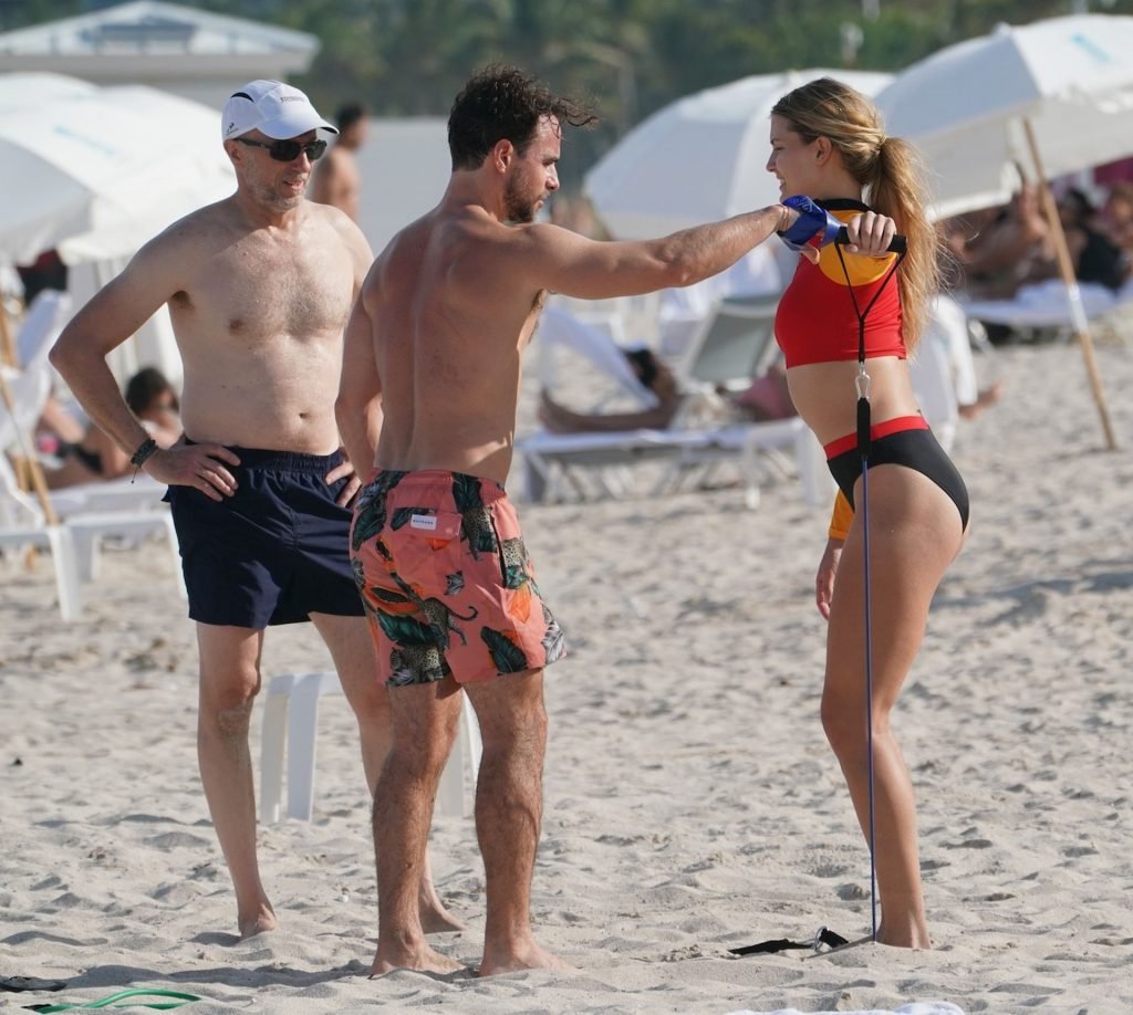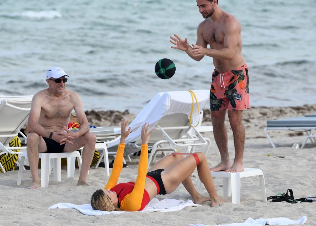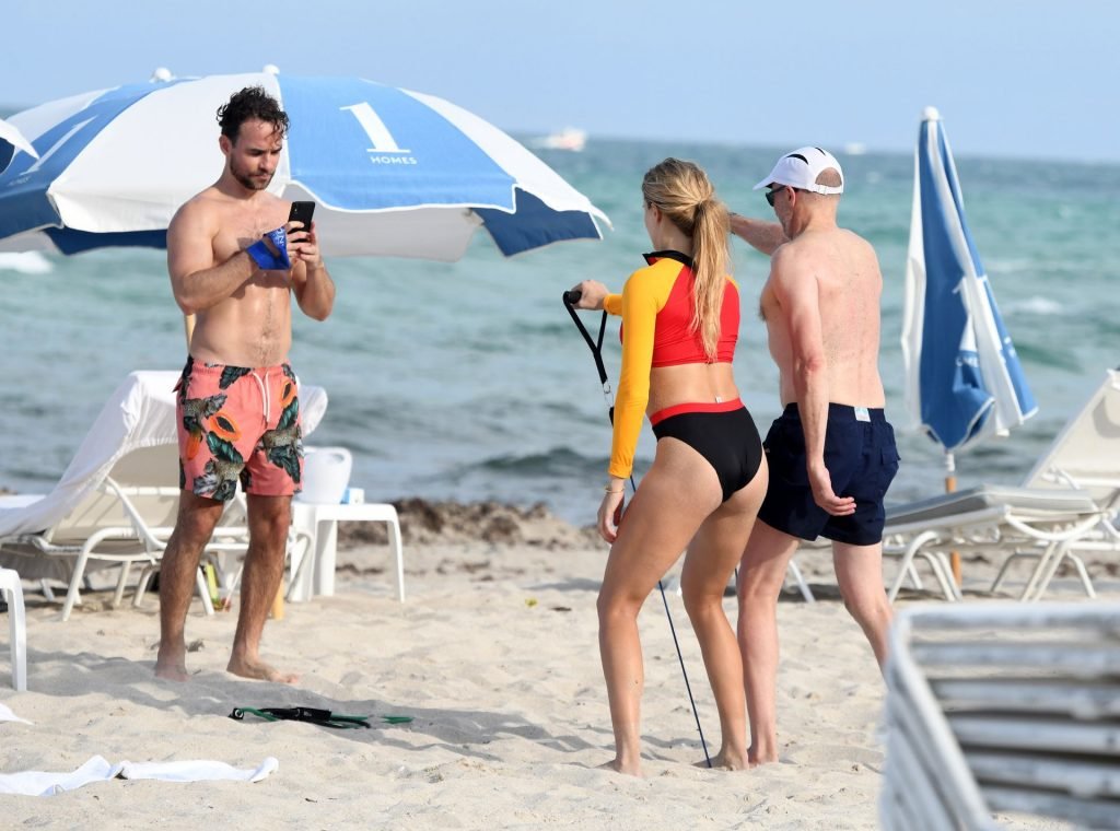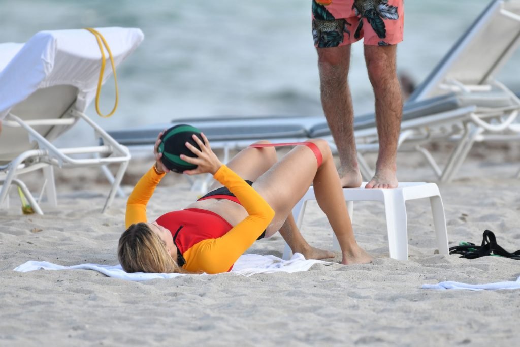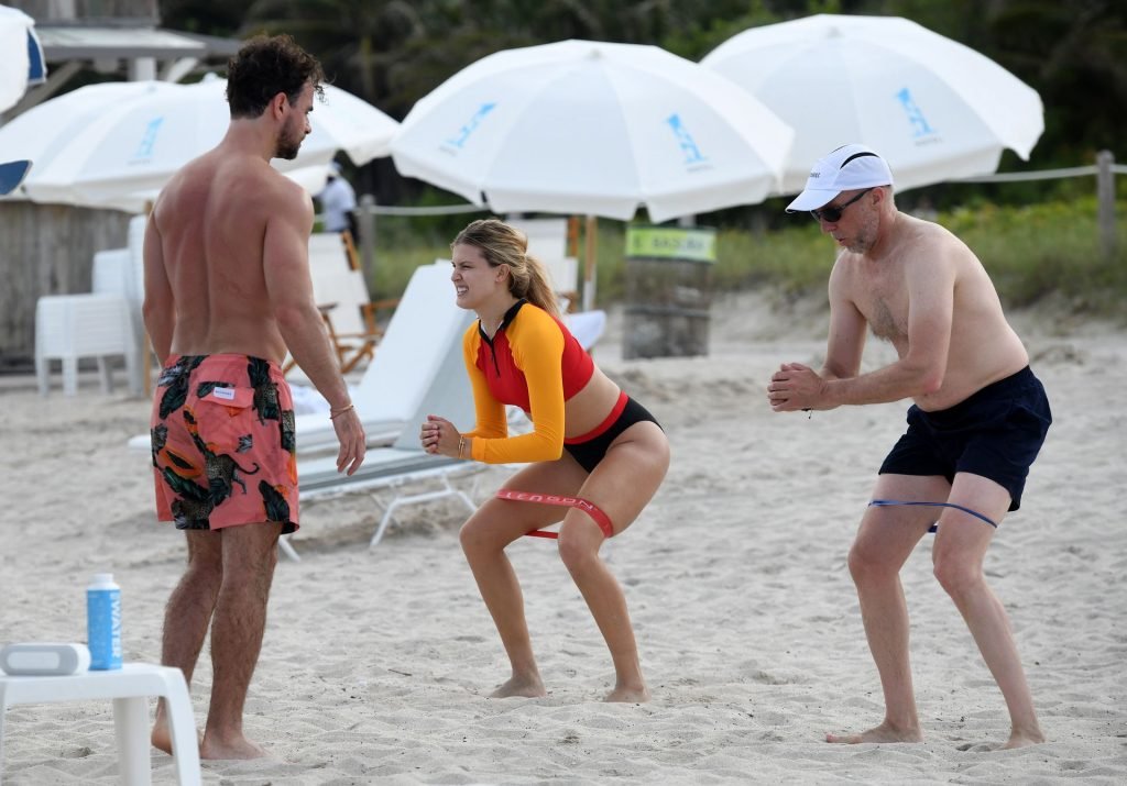Eugenie Bouchard est mise à l’épreuve par son entraîneur personnel musclé alors qu’elle effectue un entraînement intense sur la plage avec son père Mike – Miami, 18/05/2019. La joueuse de tennis canadienne portait un haut de bikini à manches longues et un bas de bikini assorti, mettant en valeur sa silhouette incroyable alors qu’elle réalisait un entraînement varié avec des bandes de résistance et un ballon, son père Mike participant à l’action.