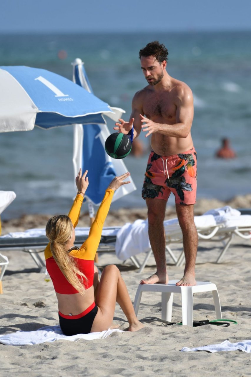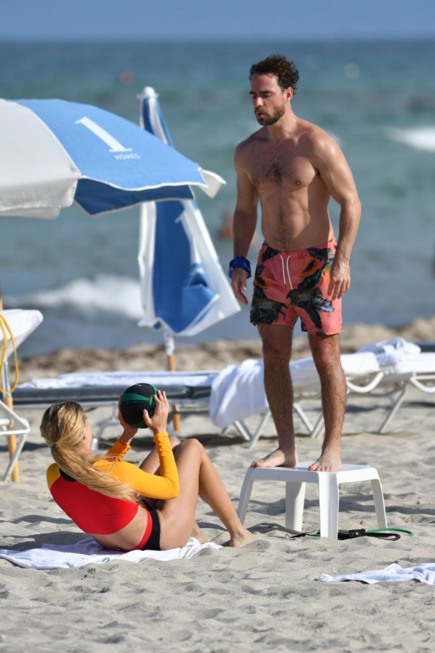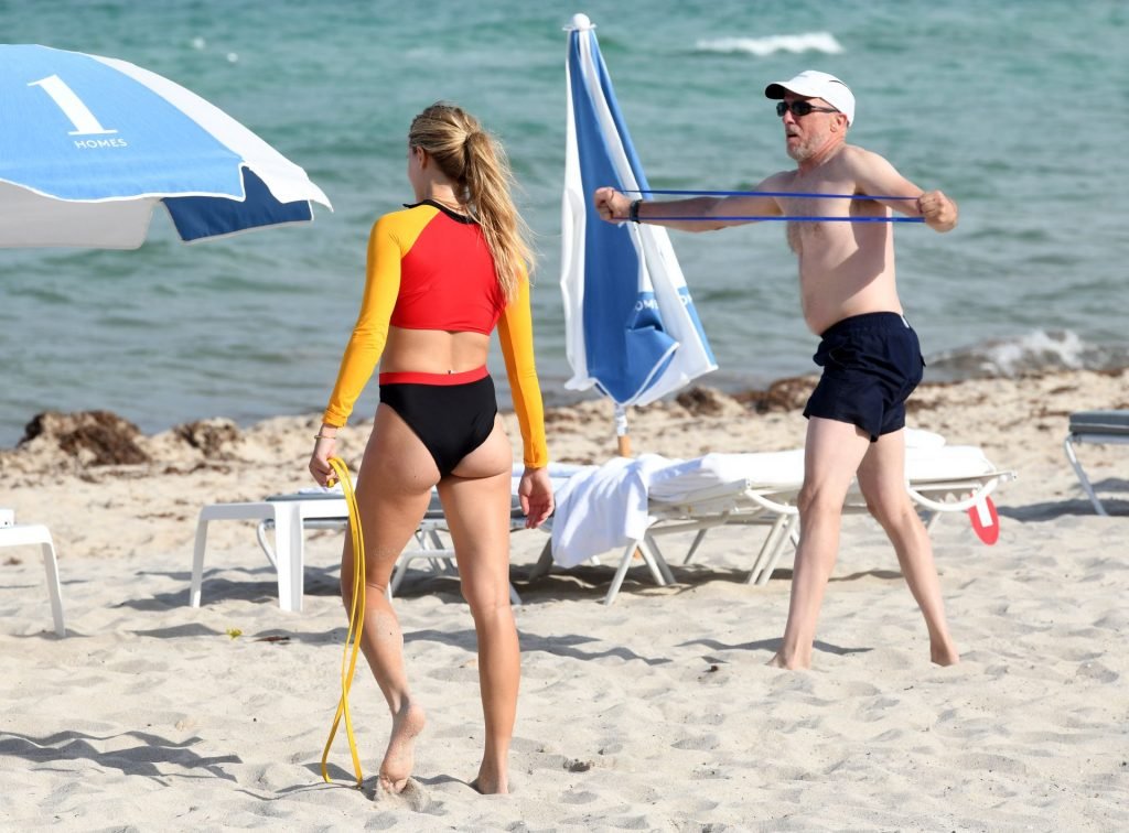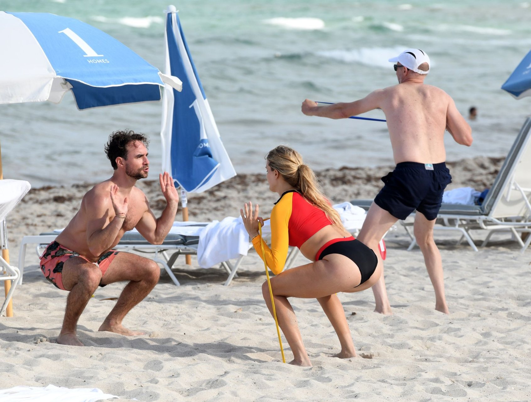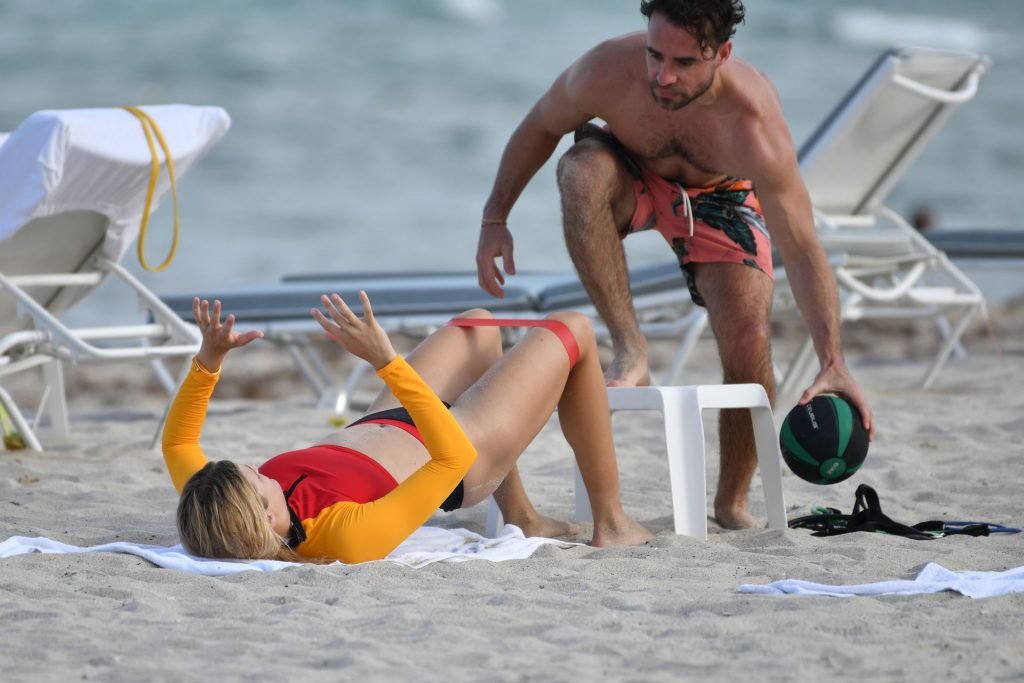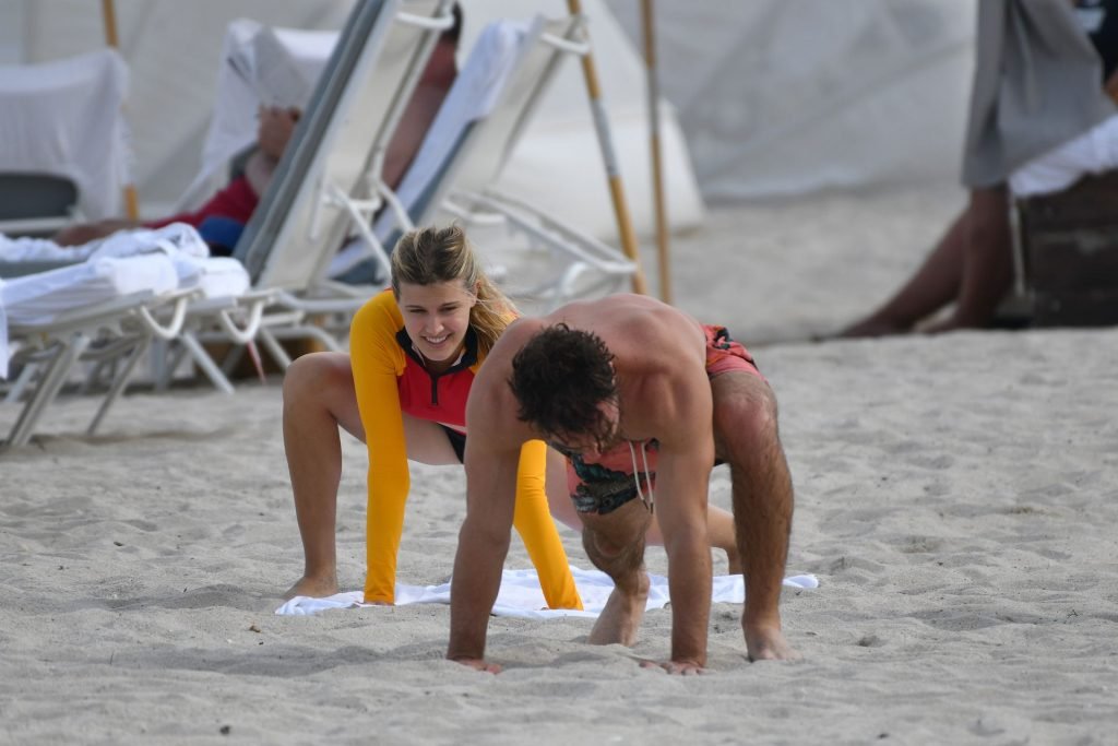 Eugenie Bouchard est mise à l’épreuve par son entraîneur personnel musclé alors qu’elle effectue un entraînement intense sur la plage avec son père Mike – Miami, 18/05/2019. La joueuse de tennis canadienne portait un haut de bikini à manches longues et un bas de bikini assorti, mettant en valeur sa silhouette incroyable alors qu’elle réalisait un entraînement varié avec des bandes de résistance et un ballon, son père Mike participant à l’action.