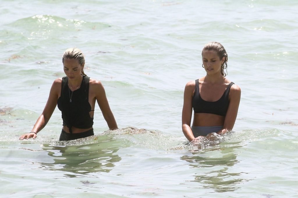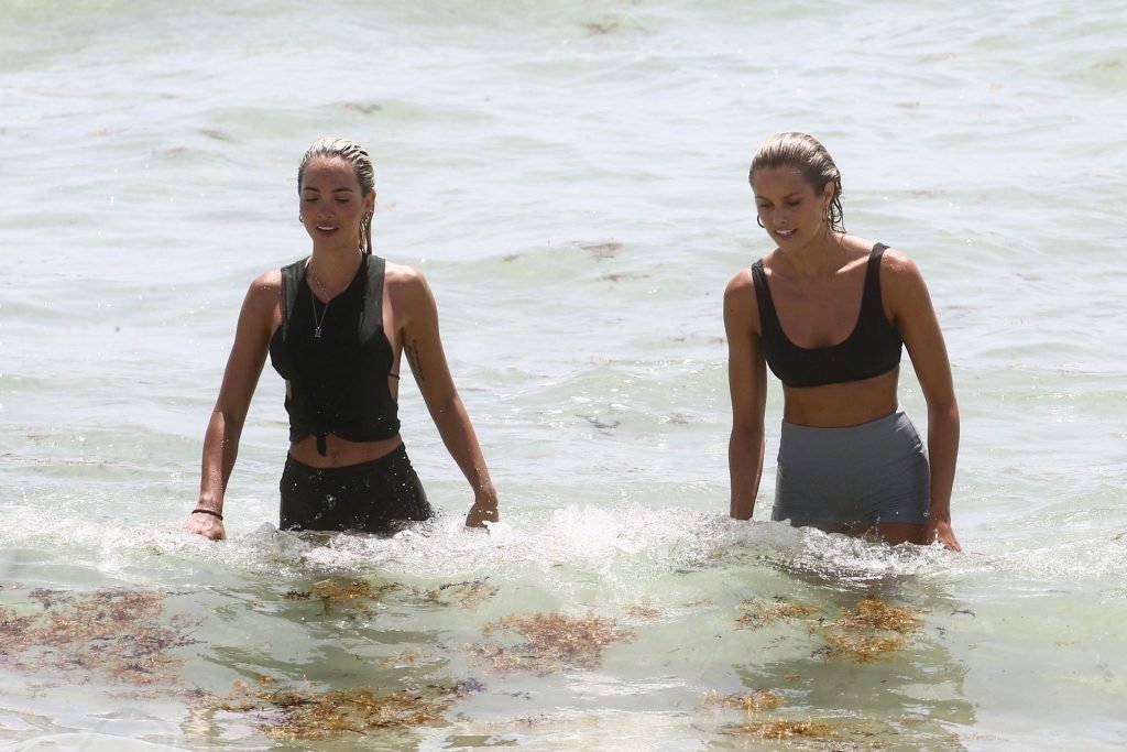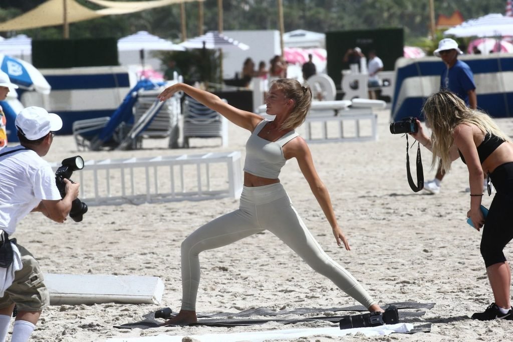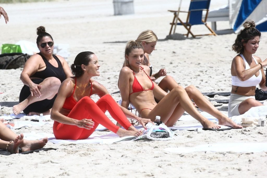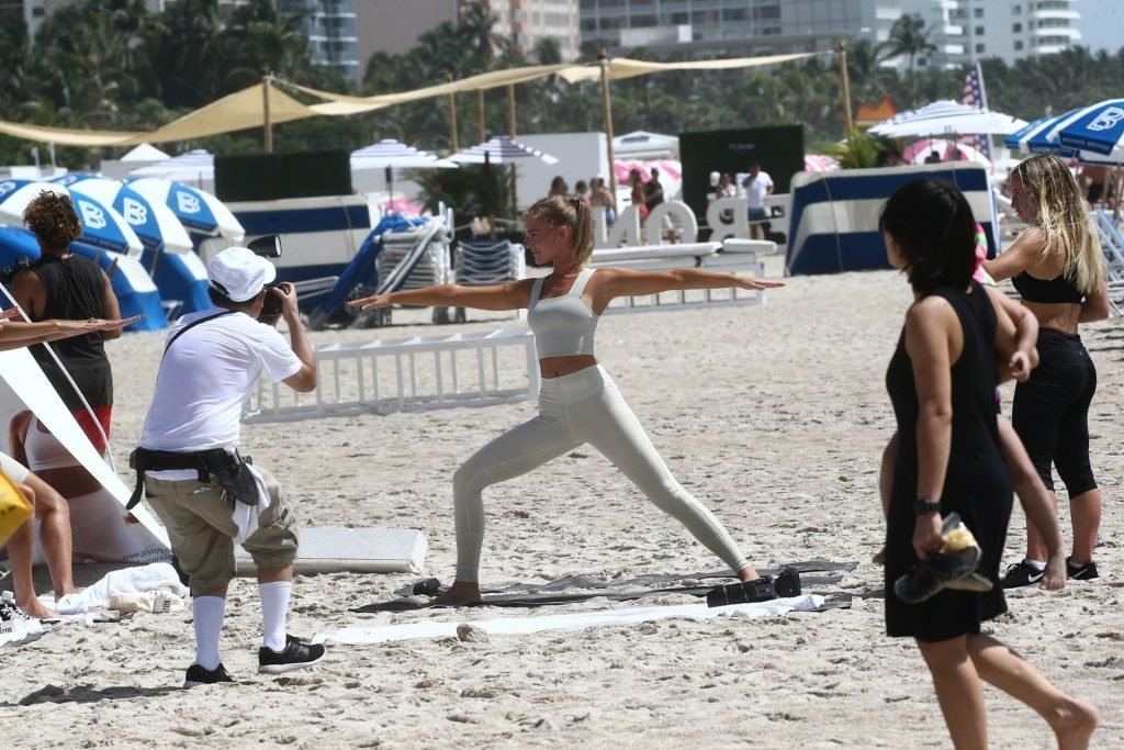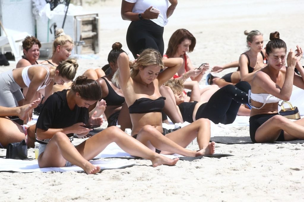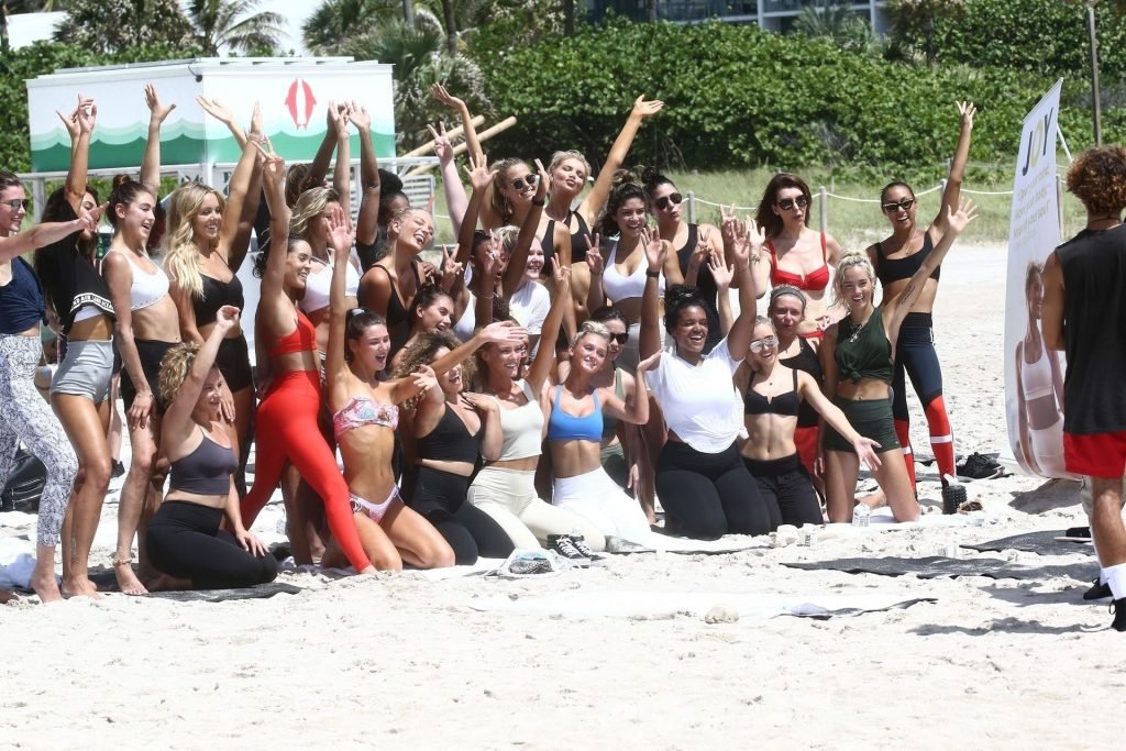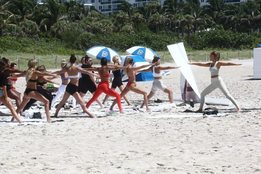 Les sensations des réseaux sociaux Georgia Gibbs, Lindsey Heppner, Natalie Rose et Bree Kleintop réchauffent la plage en participant à un cours de yoga lors de la Peroni Swim Week : Fashion Show & Pop-Up à Miami, le 14/07/2019. Après leur séance, les filles ont plongé dans l’océan pour se rafraîchir.