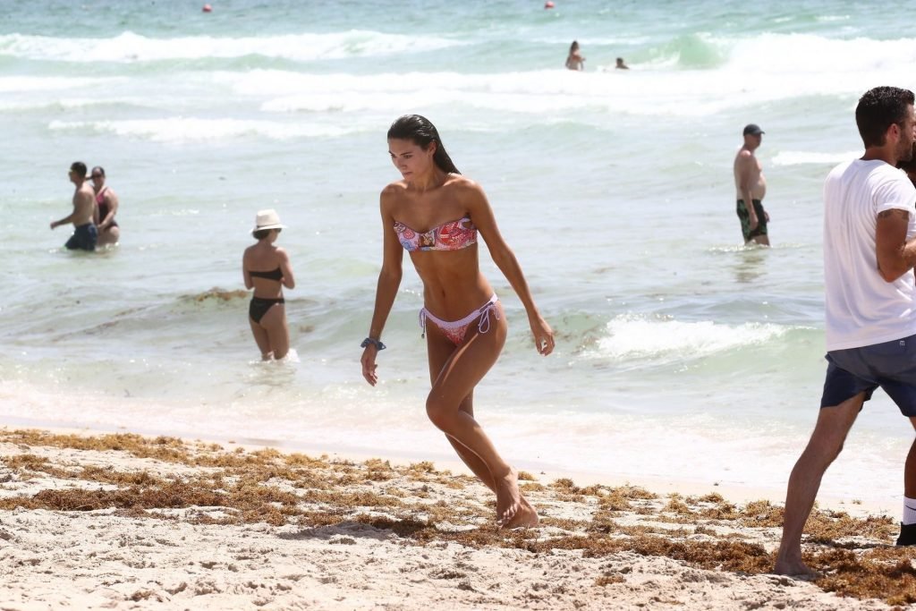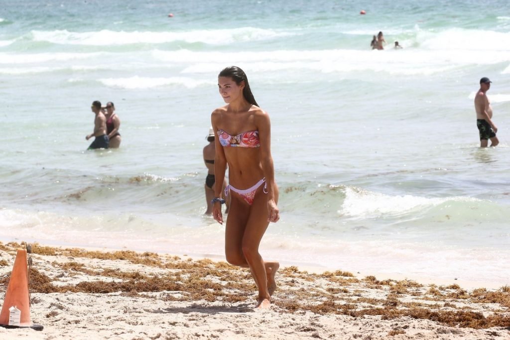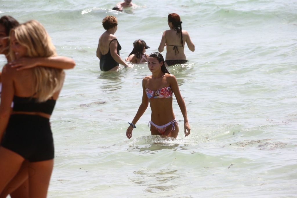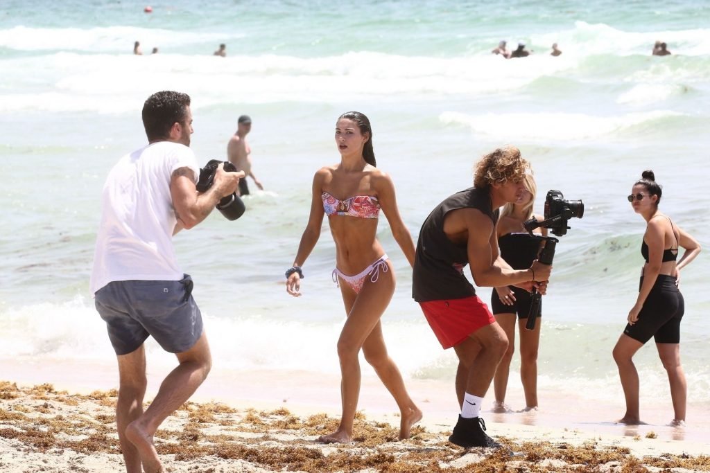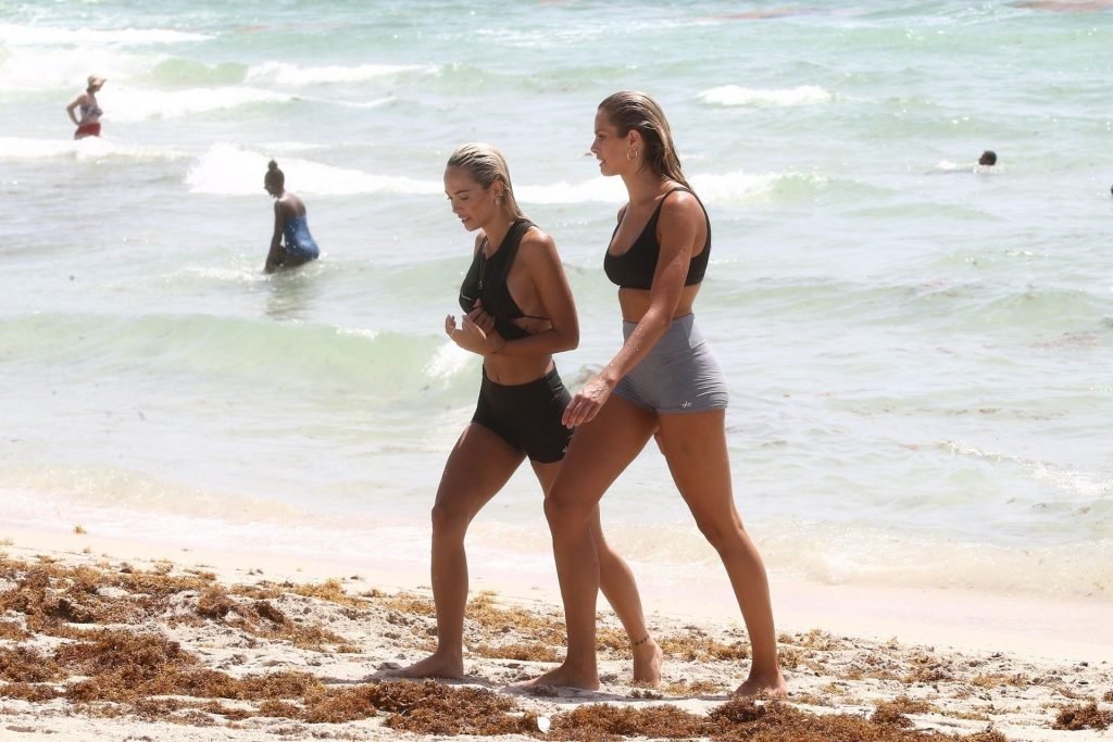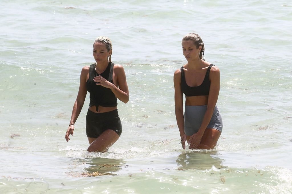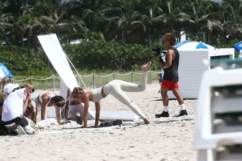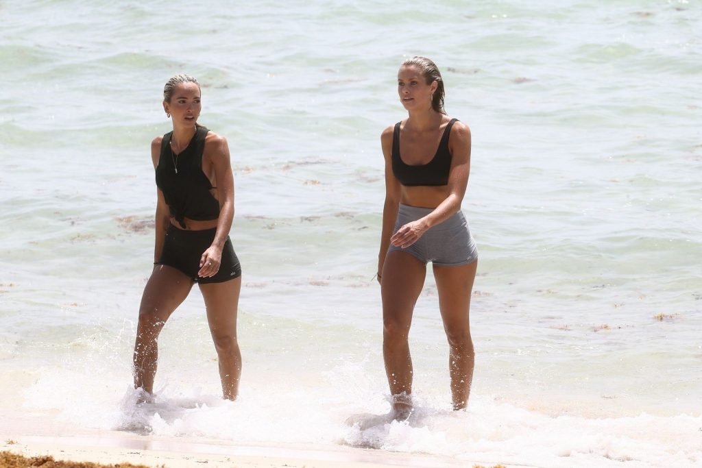 Les sensations des réseaux sociaux Georgia Gibbs, Lindsey Heppner, Natalie Rose et Bree Kleintop réchauffent la plage en participant à un cours de yoga lors de la Peroni Swim Week : Fashion Show & Pop-Up à Miami, le 14/07/2019. Après leur séance, les filles ont plongé dans l’océan pour se rafraîchir.