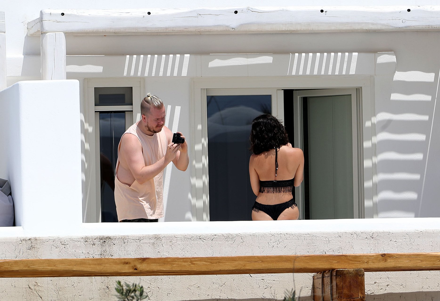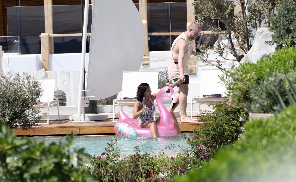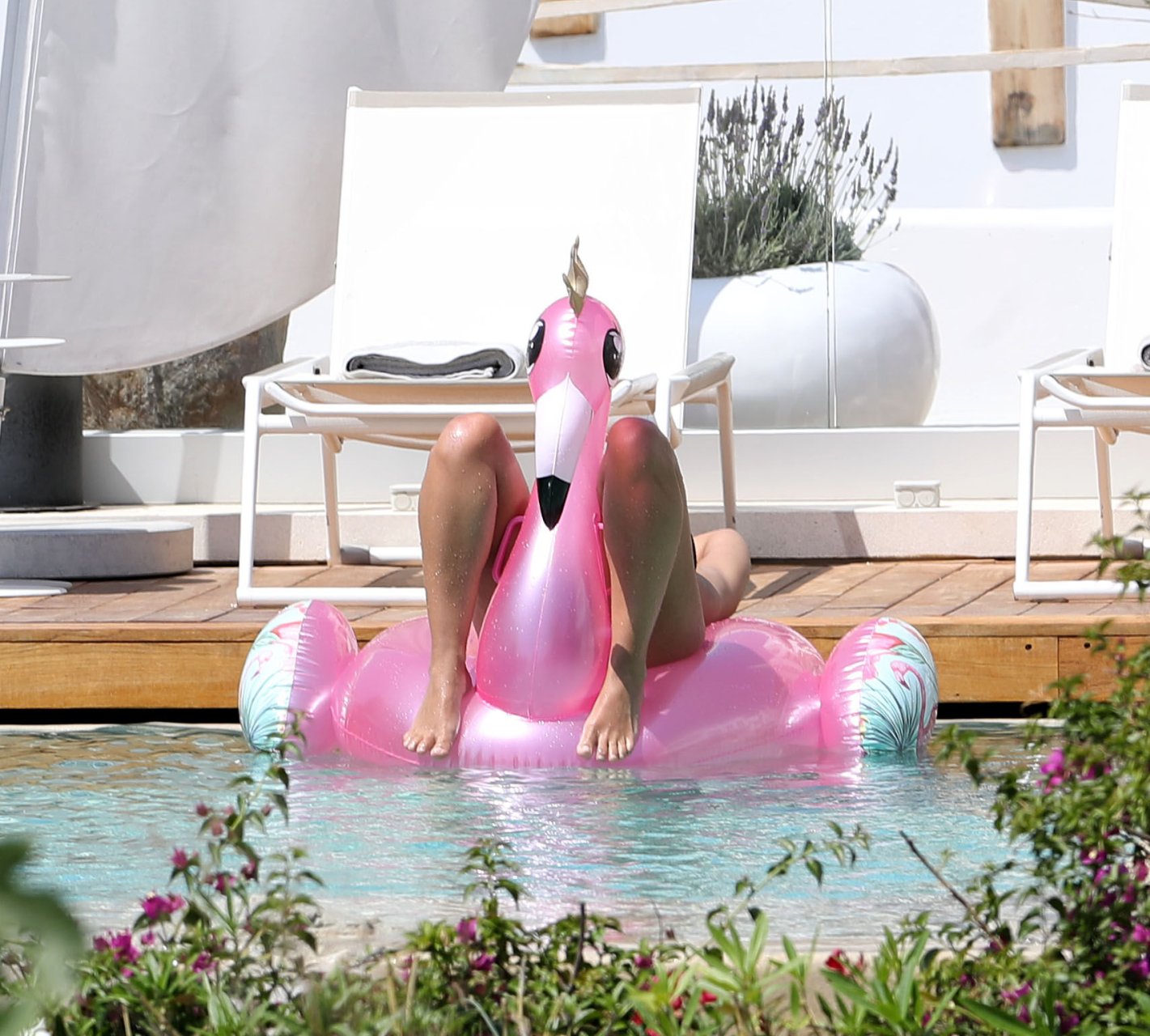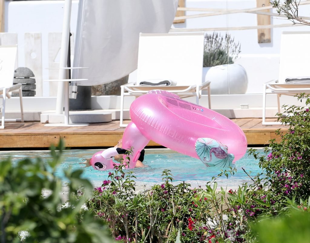 L’actrice Georgia May Foote (27 ans) est photographiée en train de s’amuser avec un flamant rose gonflable près d’une piscine alors qu’elle se détendait lors de vacances à Mykonos, le 07/05/2018.