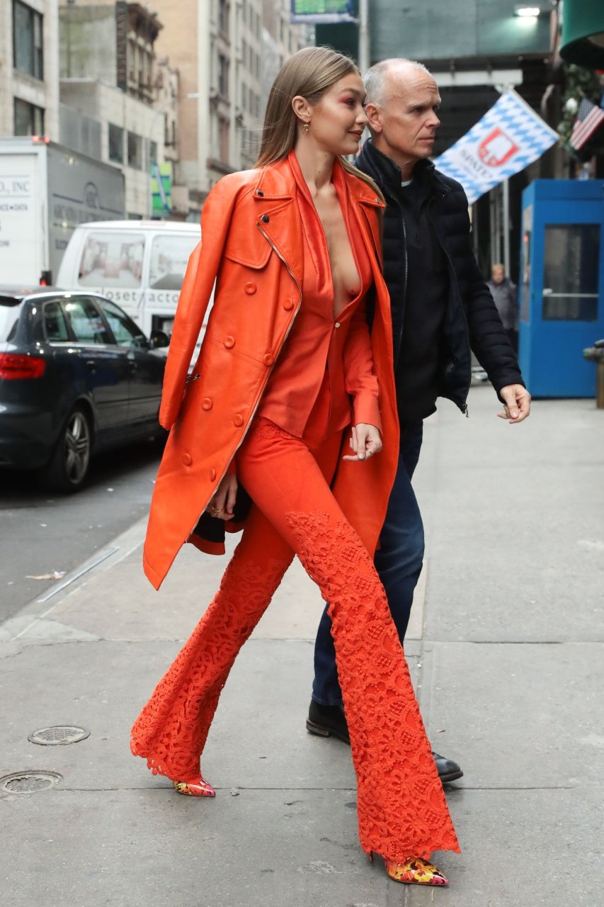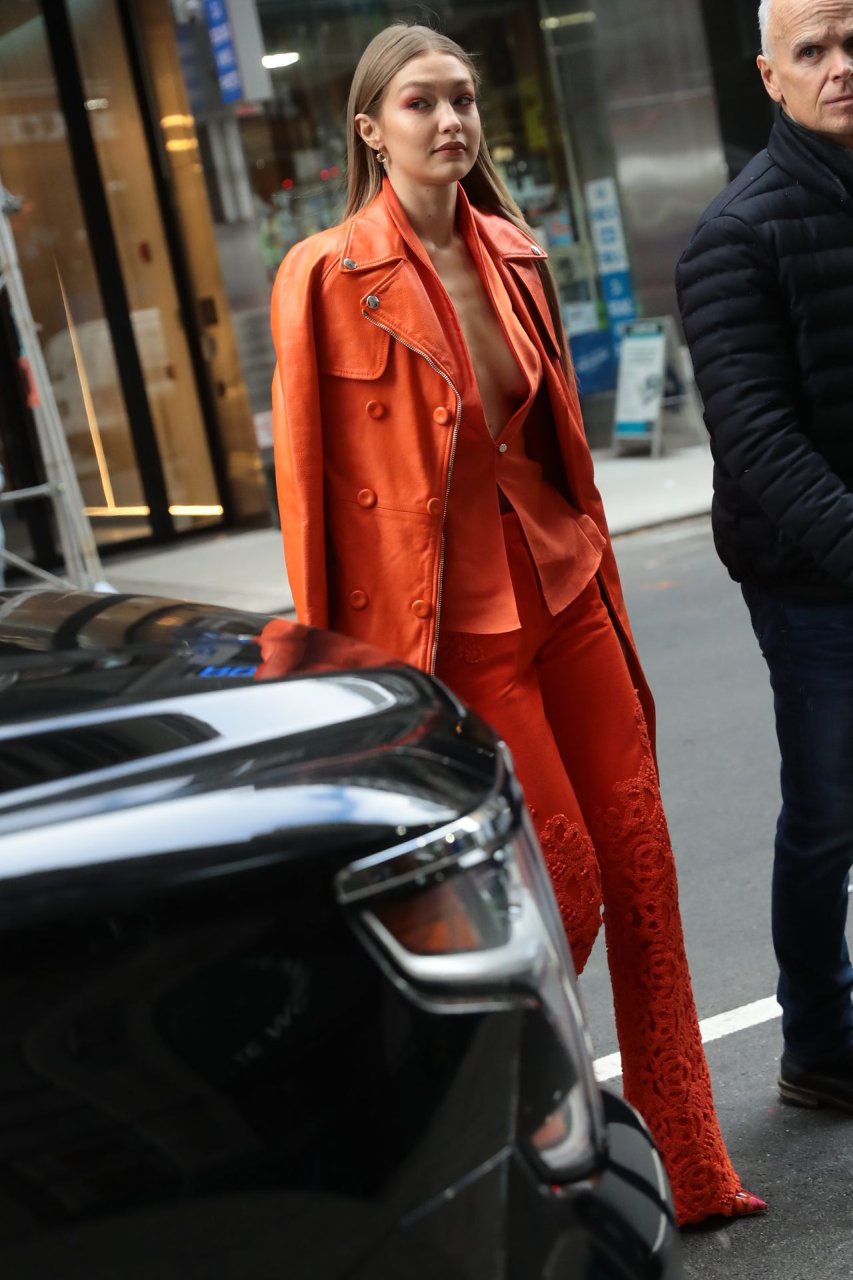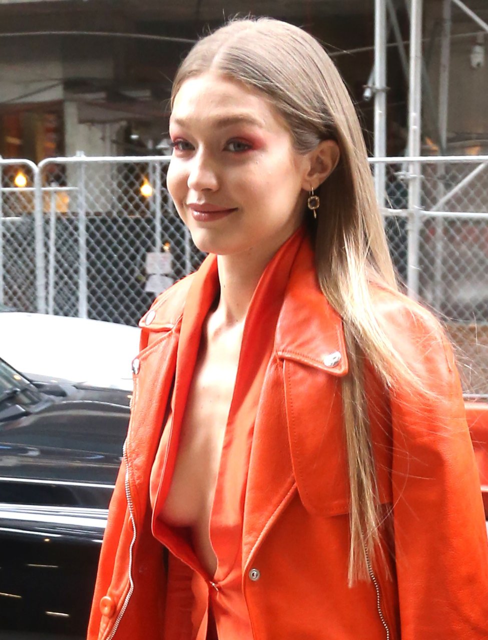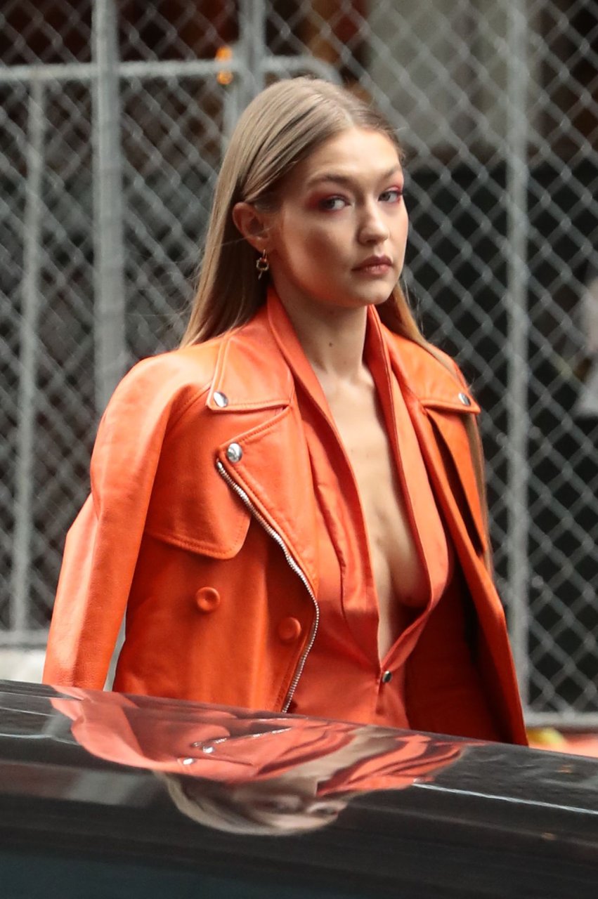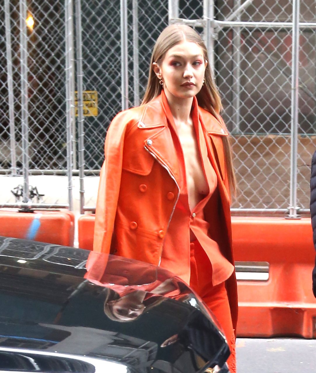 Le mannequin Gigi Hadid a été aperçue montrant son décolleté et son côté de poitrine en arrivant chez Vogue pour Gigi à New York, le 11/12/2018.