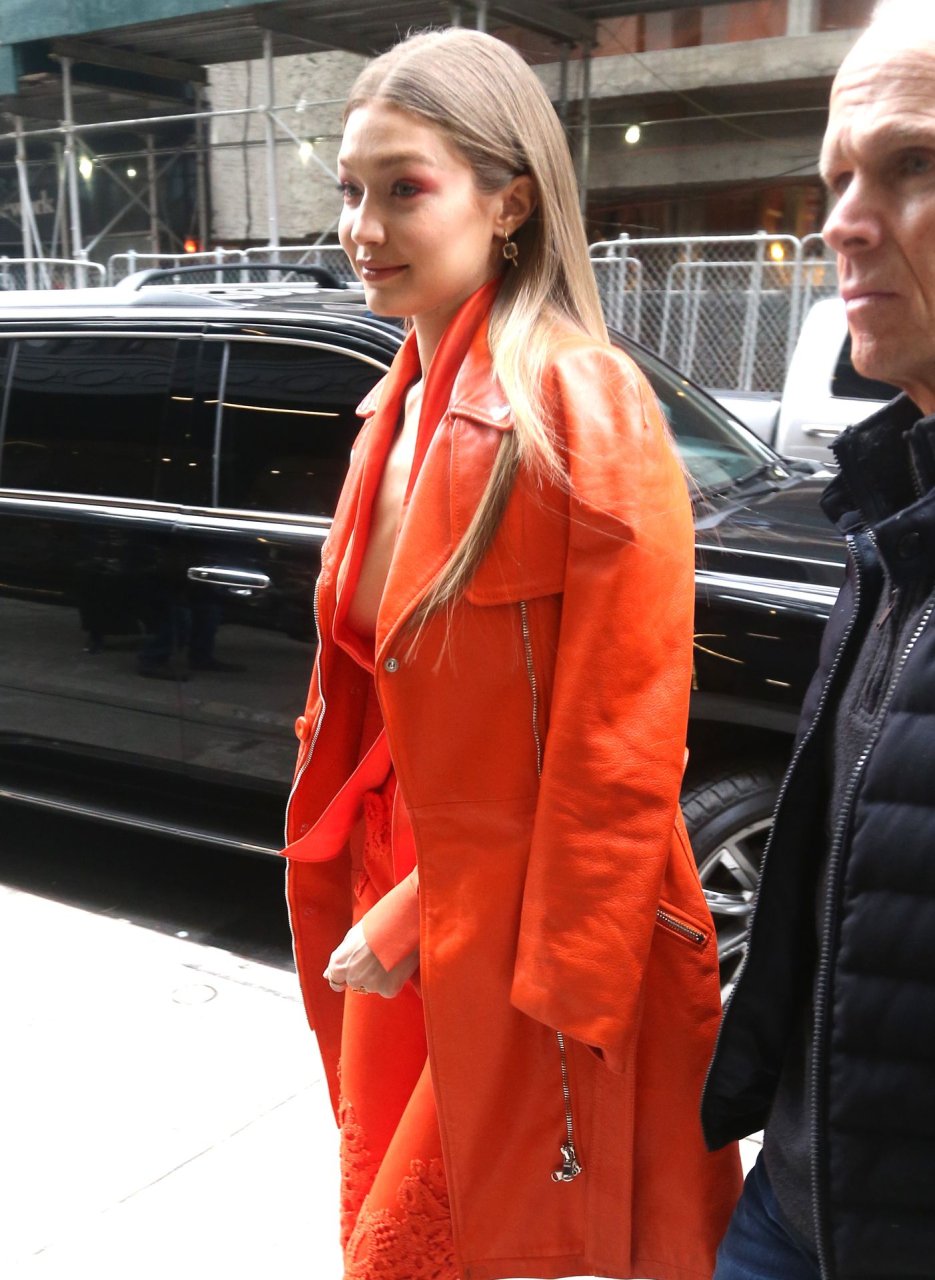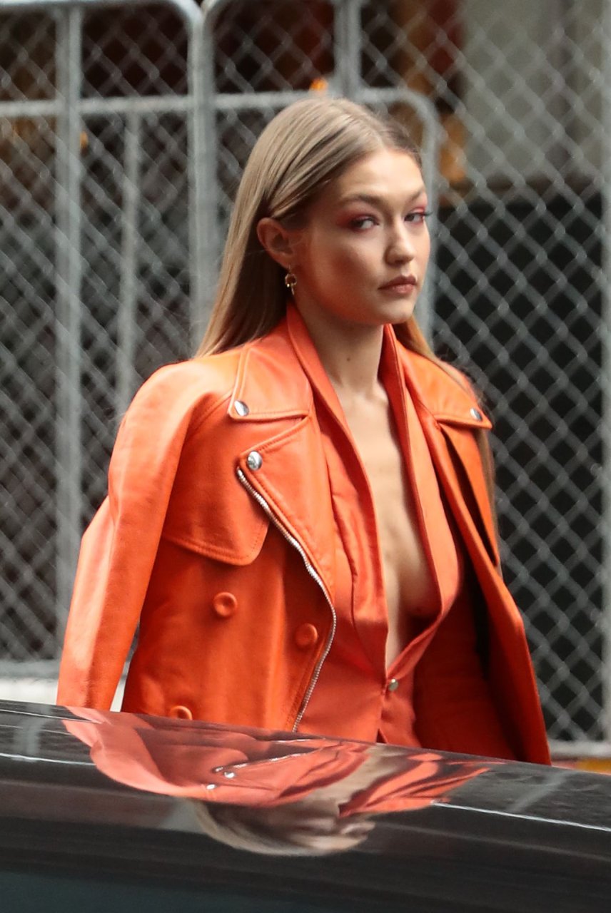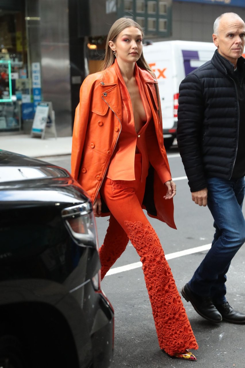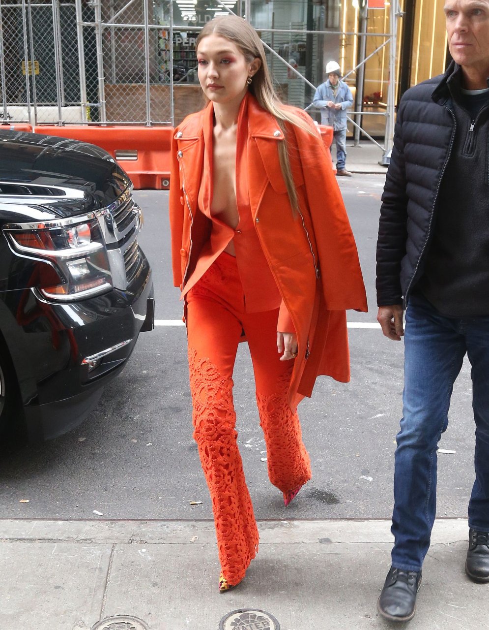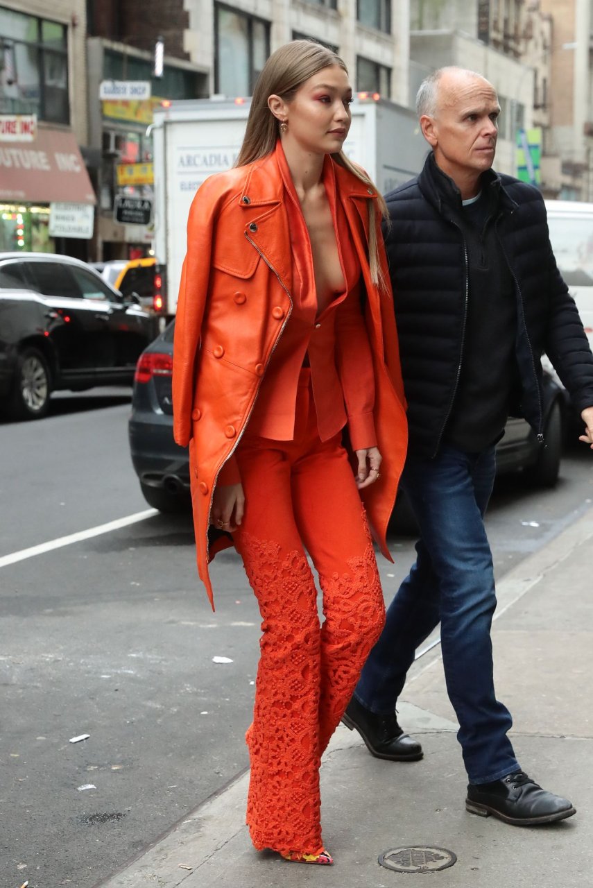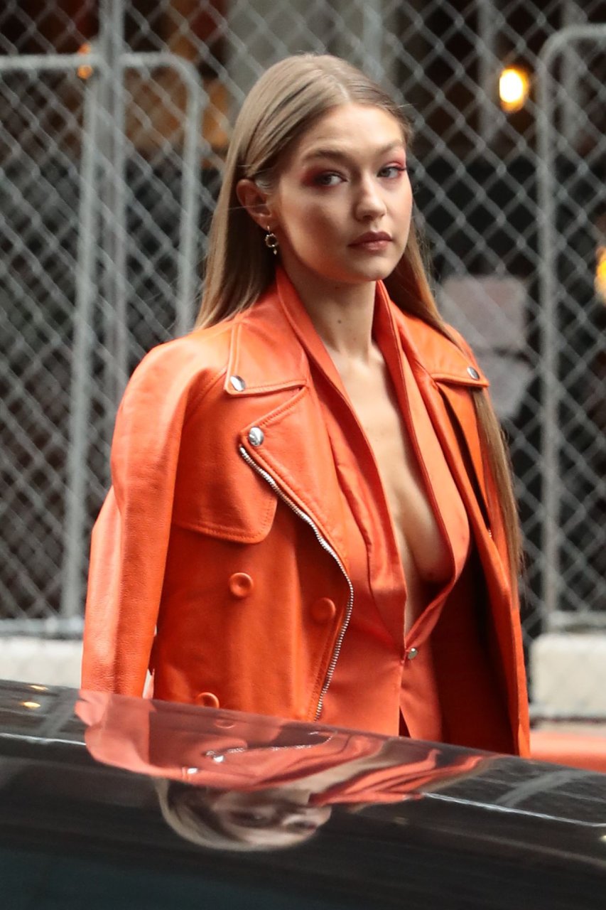 Le mannequin Gigi Hadid a été aperçue montrant son décolleté et son côté de poitrine en arrivant chez Vogue pour Gigi à New York, le 11/12/2018.