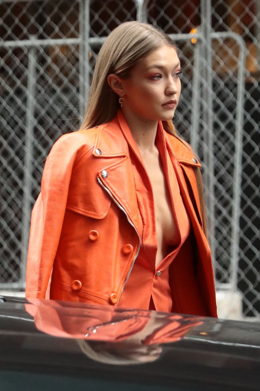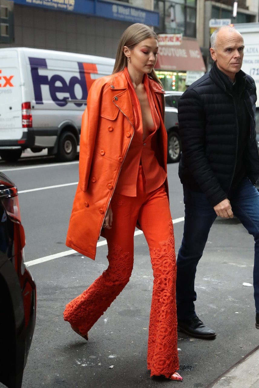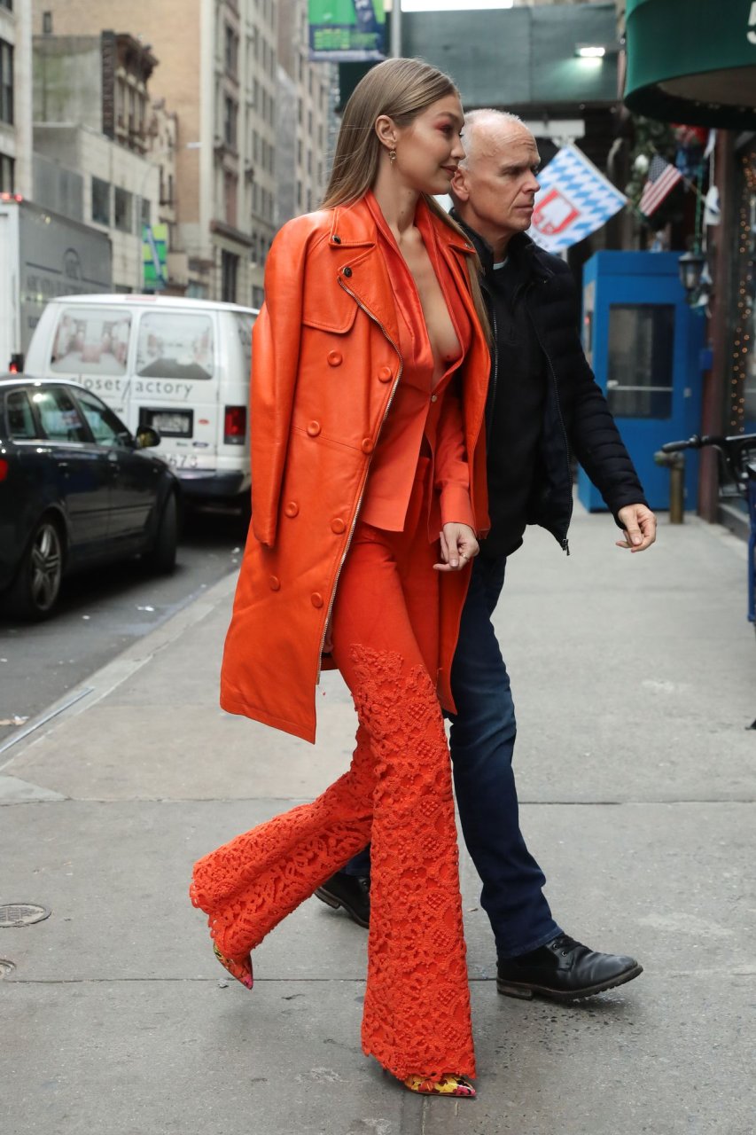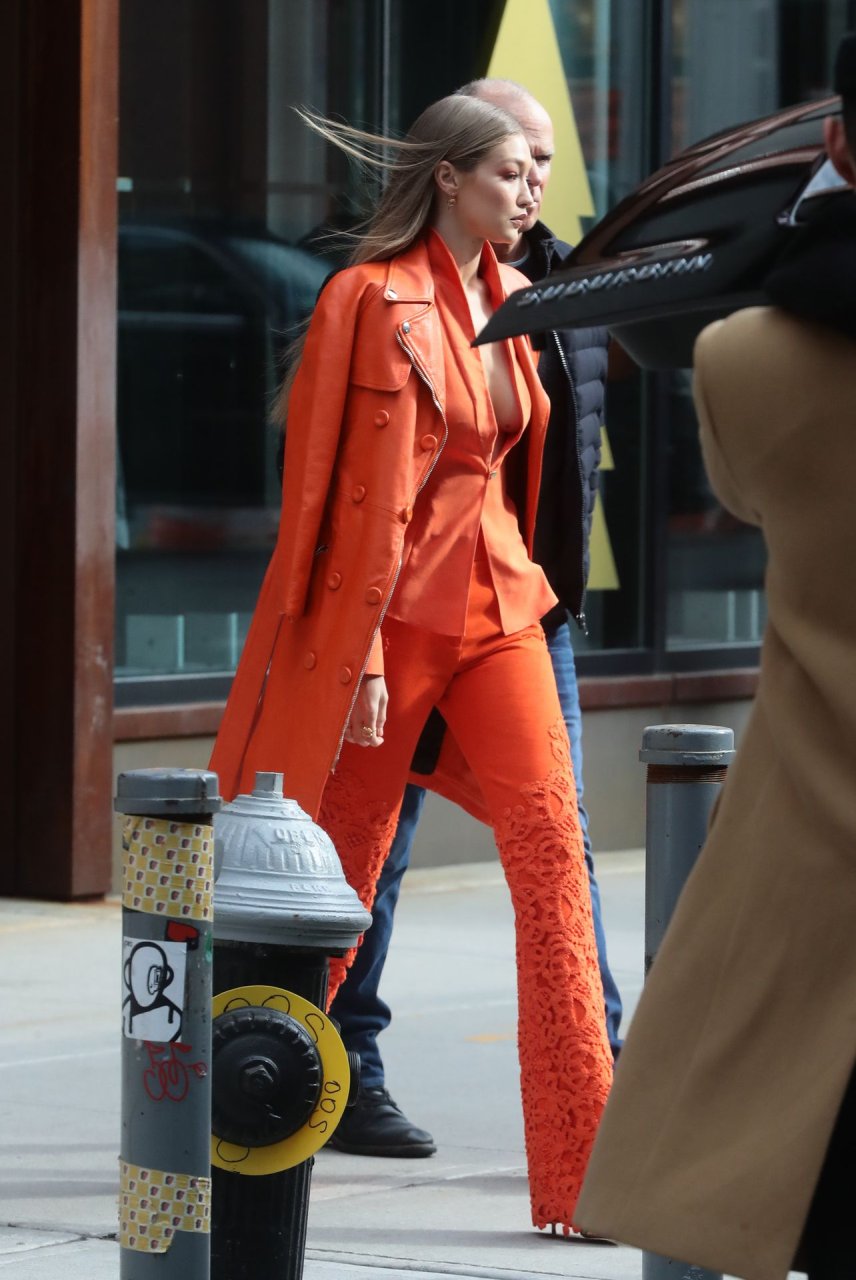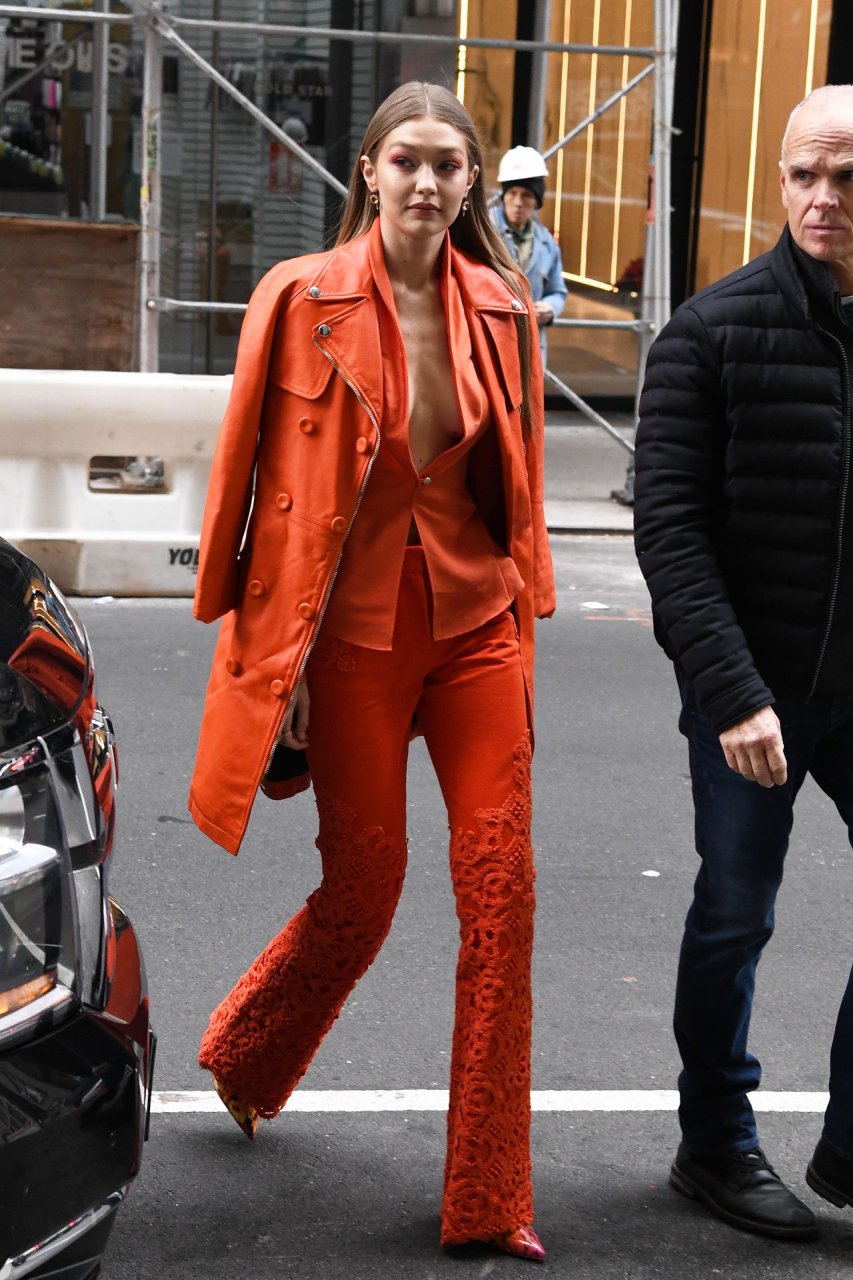 Le mannequin Gigi Hadid a été aperçue montrant son décolleté et son côté de poitrine en arrivant chez Vogue pour Gigi à New York, le 11/12/2018.
