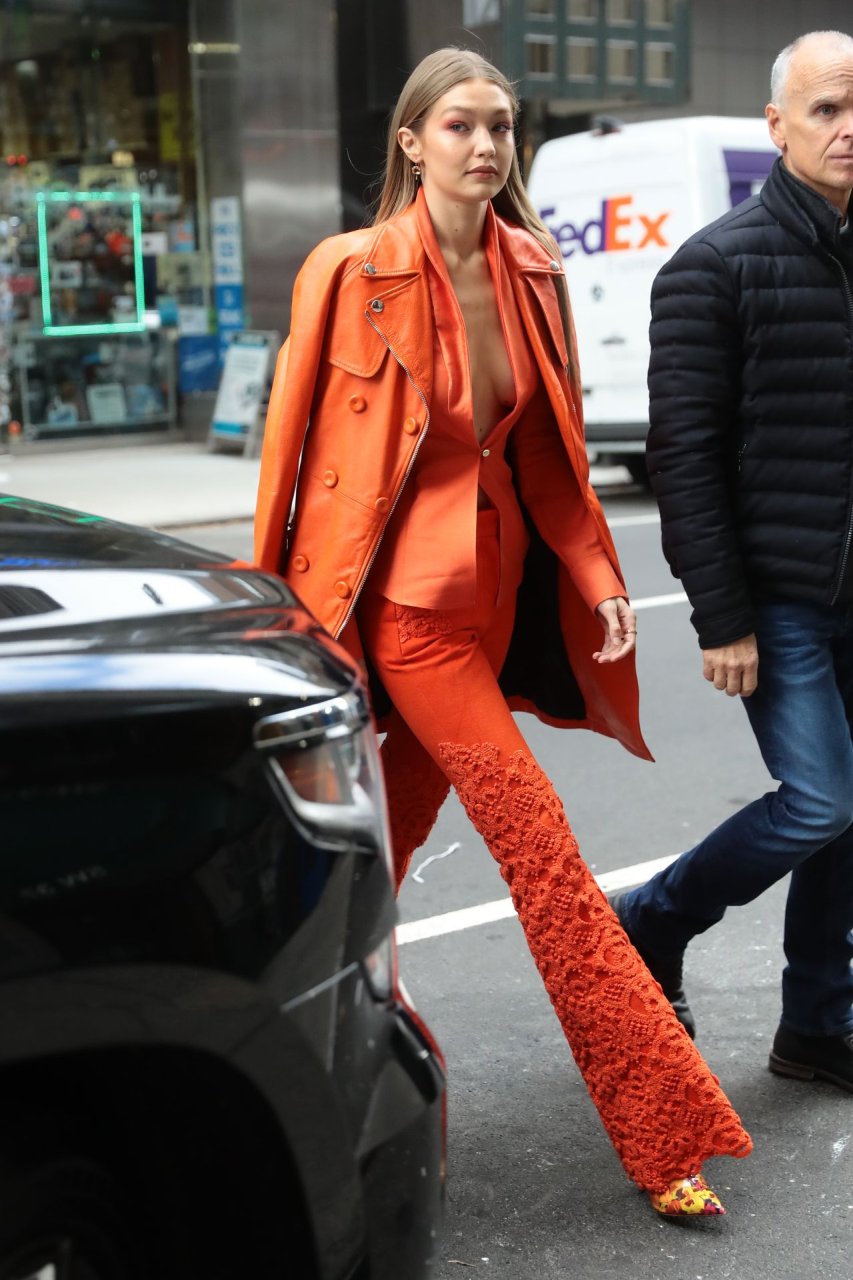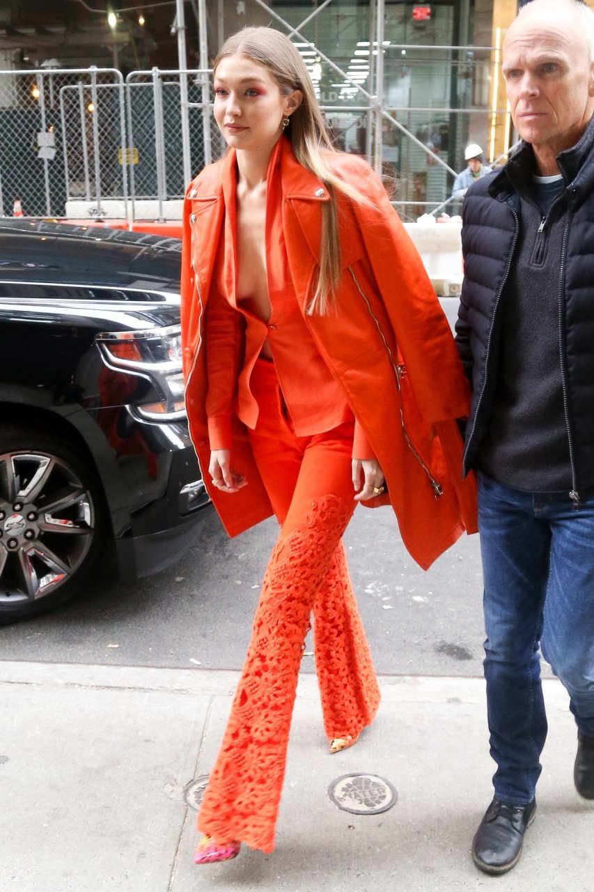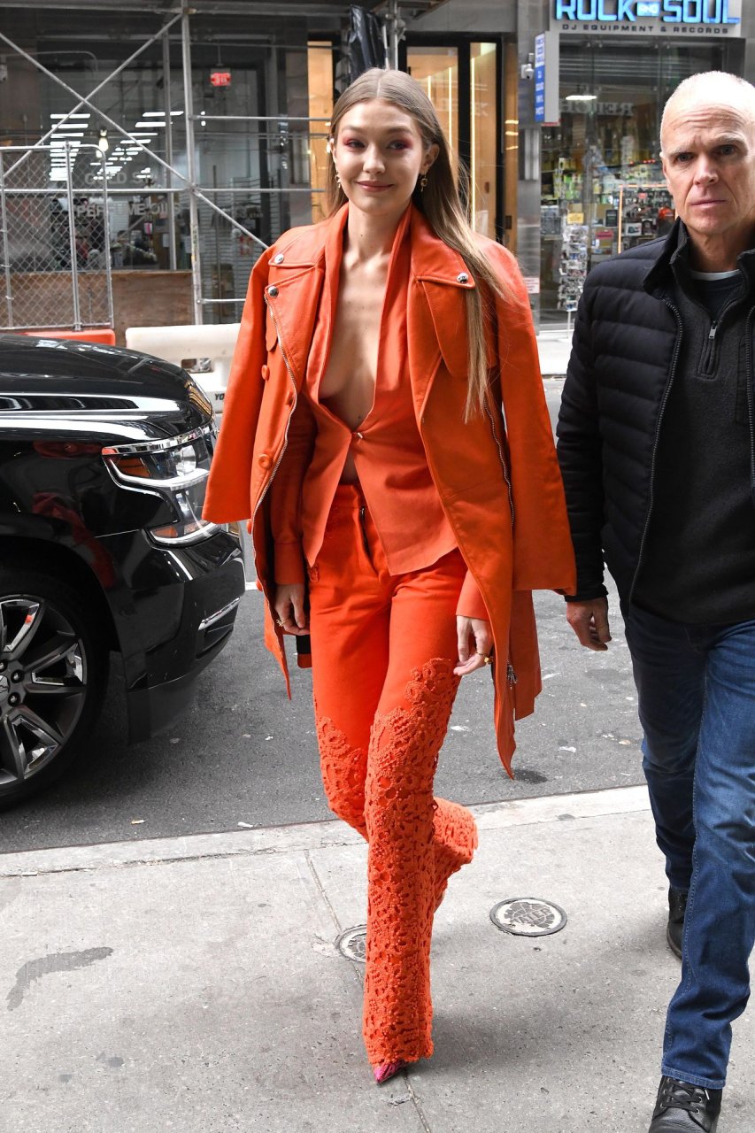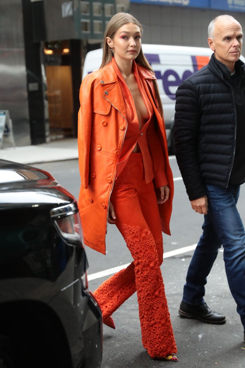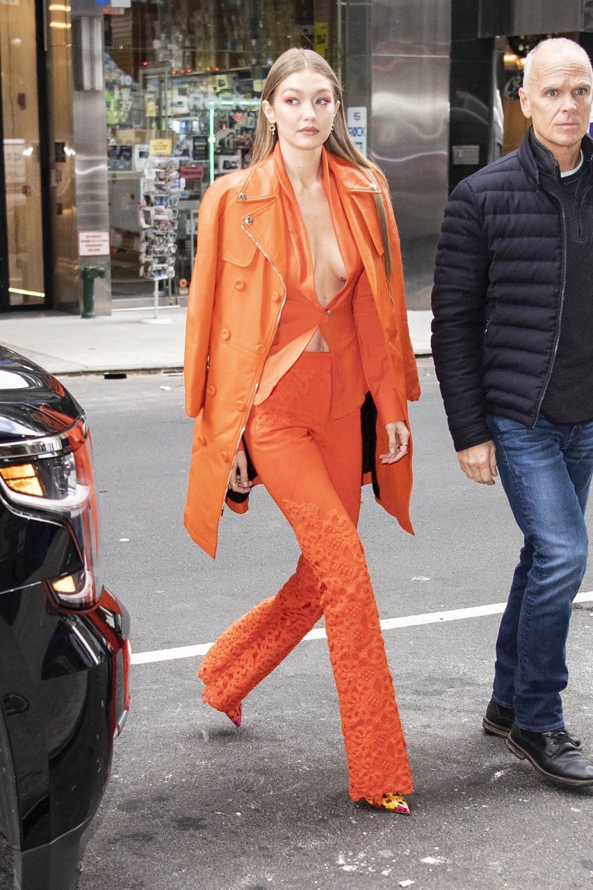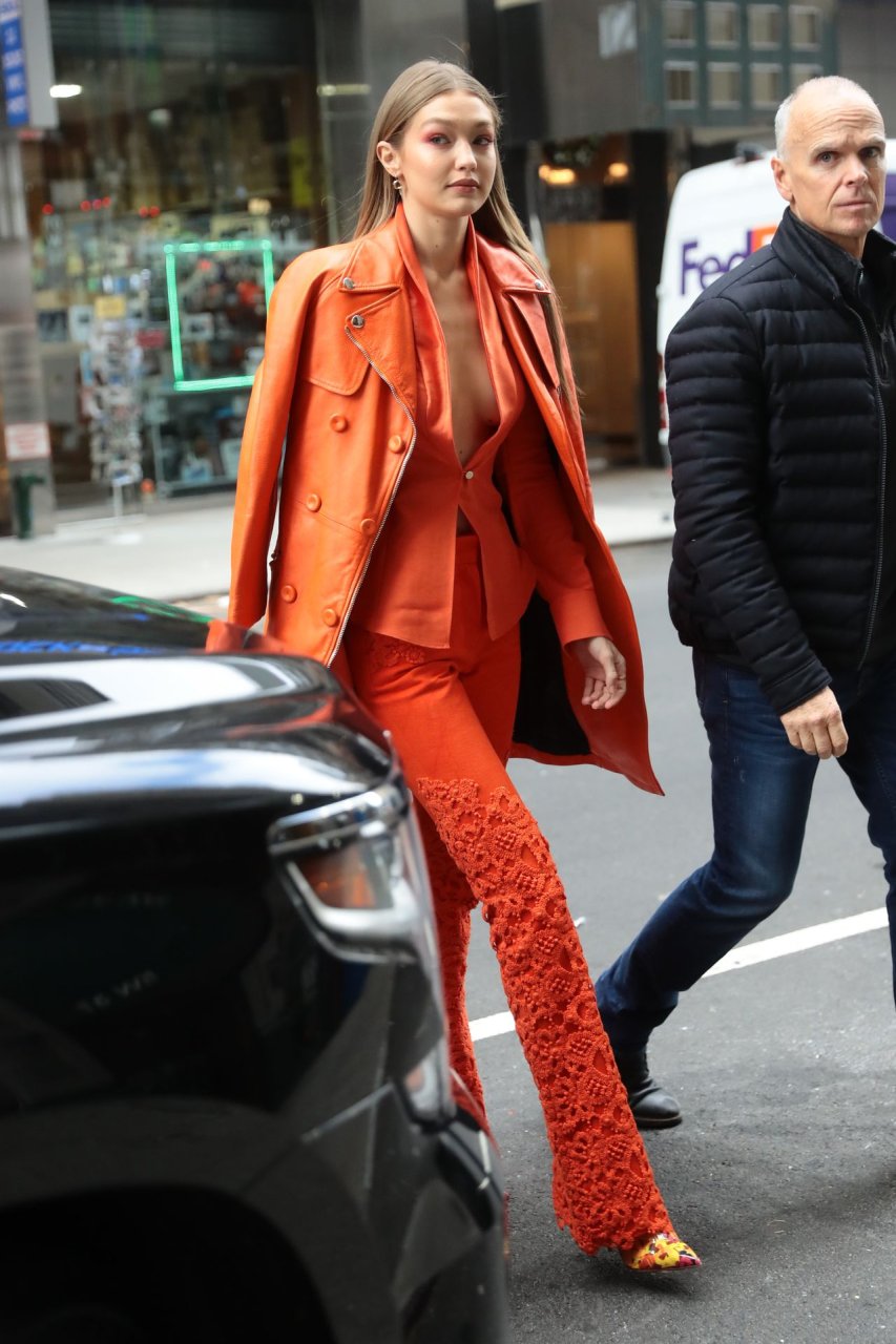 Le mannequin Gigi Hadid a été aperçue montrant son décolleté et son côté de poitrine en arrivant chez Vogue pour Gigi à New York, le 11/12/2018.