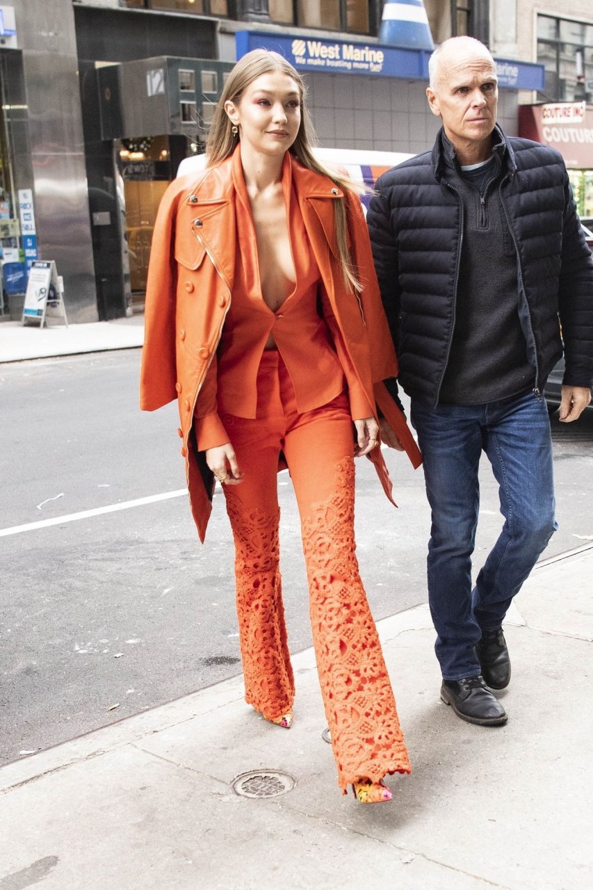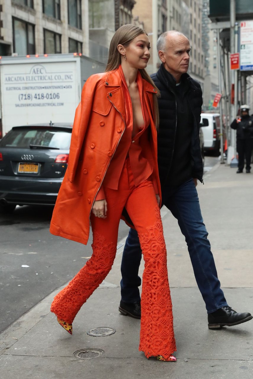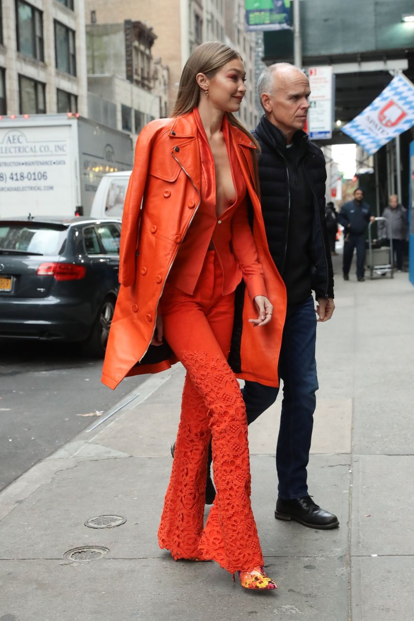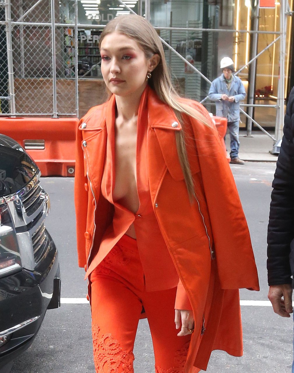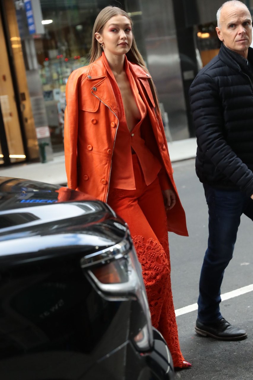 Le mannequin Gigi Hadid a été aperçue montrant son décolleté et son côté de poitrine en arrivant chez Vogue pour Gigi à New York, le 11/12/2018.