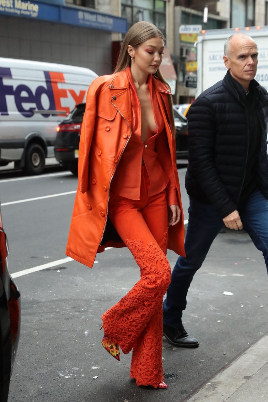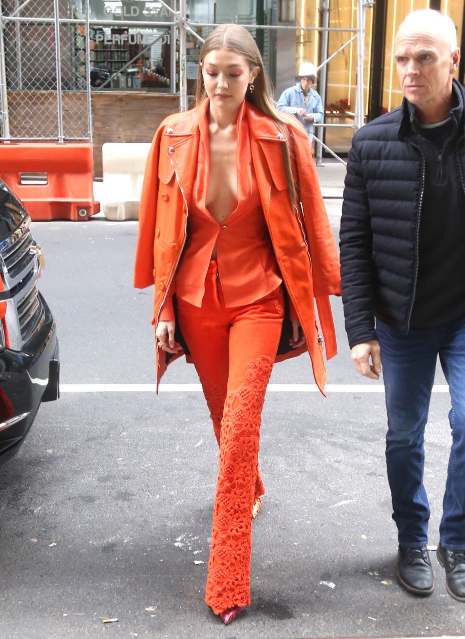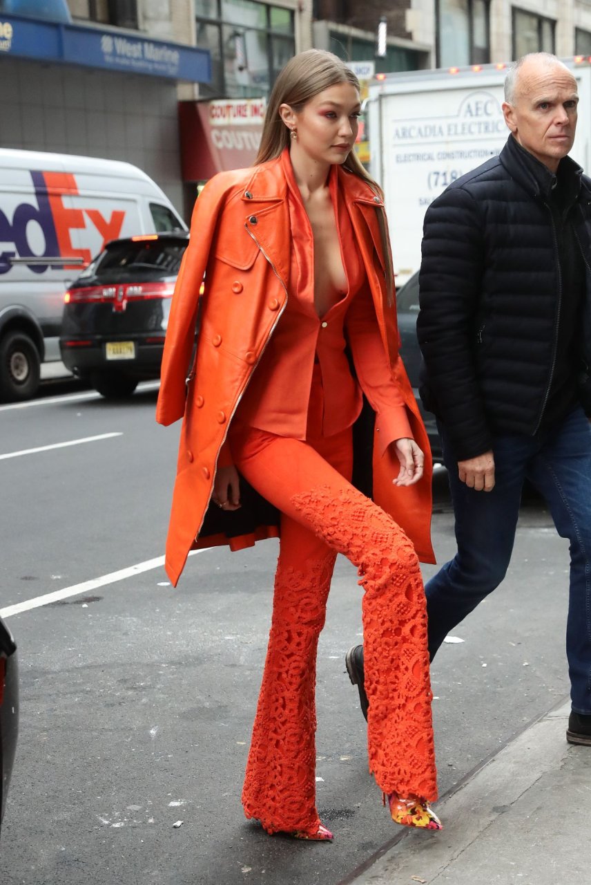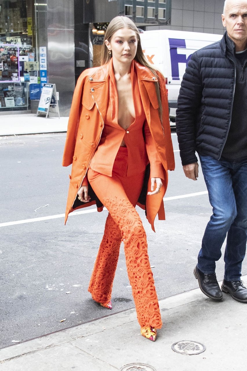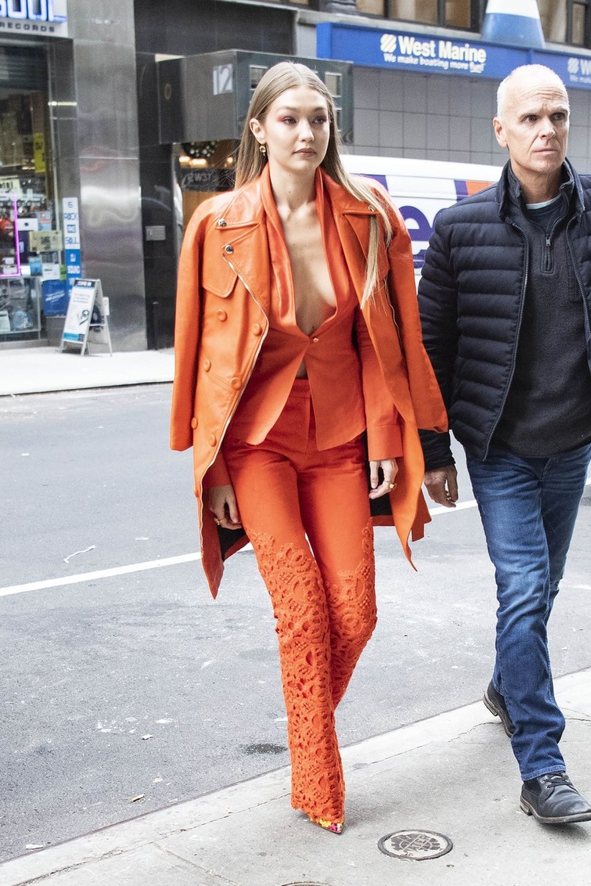 Le mannequin Gigi Hadid a été aperçue montrant son décolleté et son côté de poitrine en arrivant chez Vogue pour Gigi à New York, le 11/12/2018.