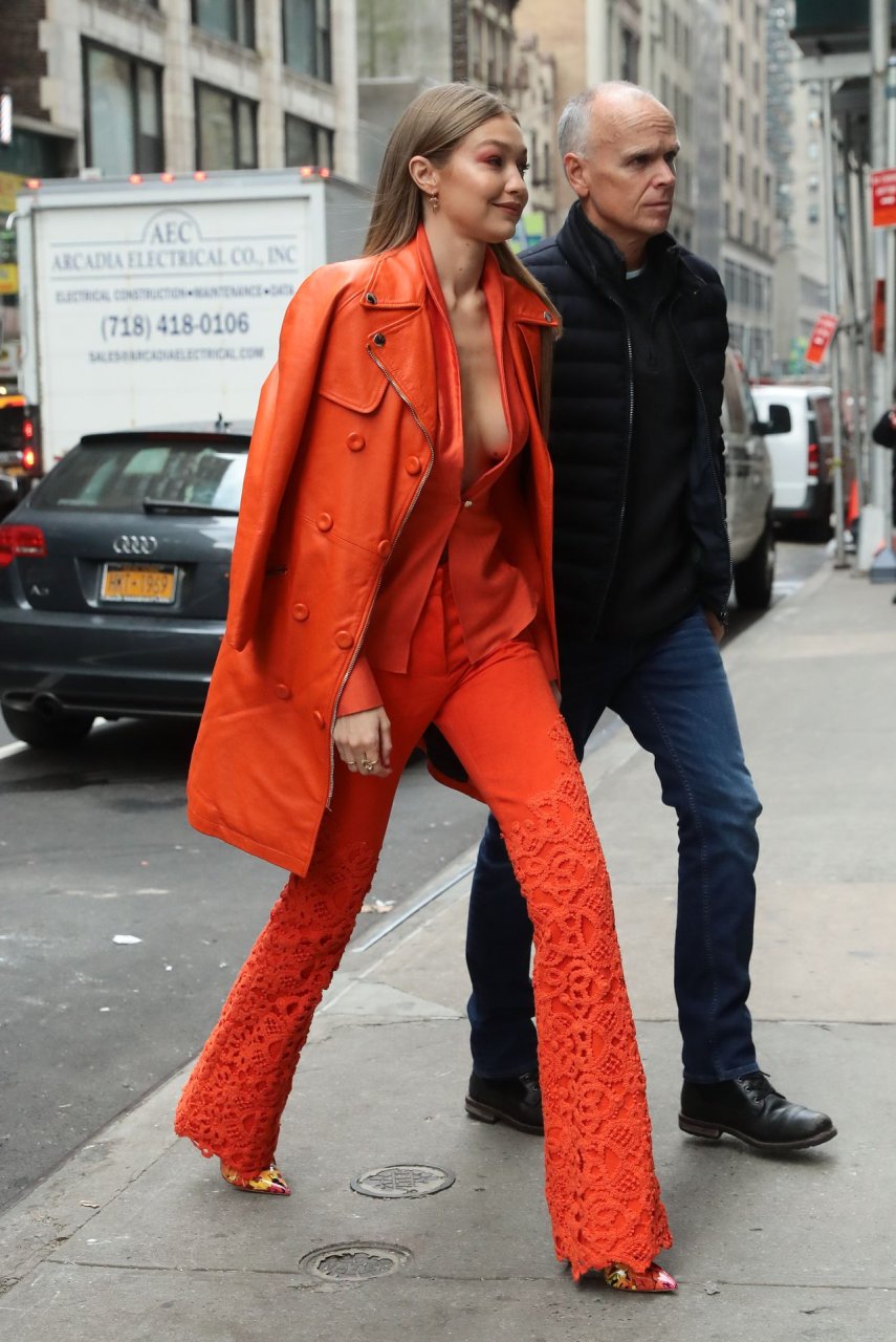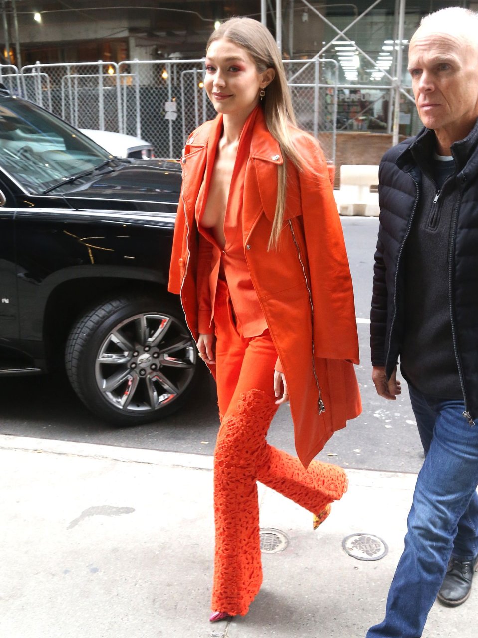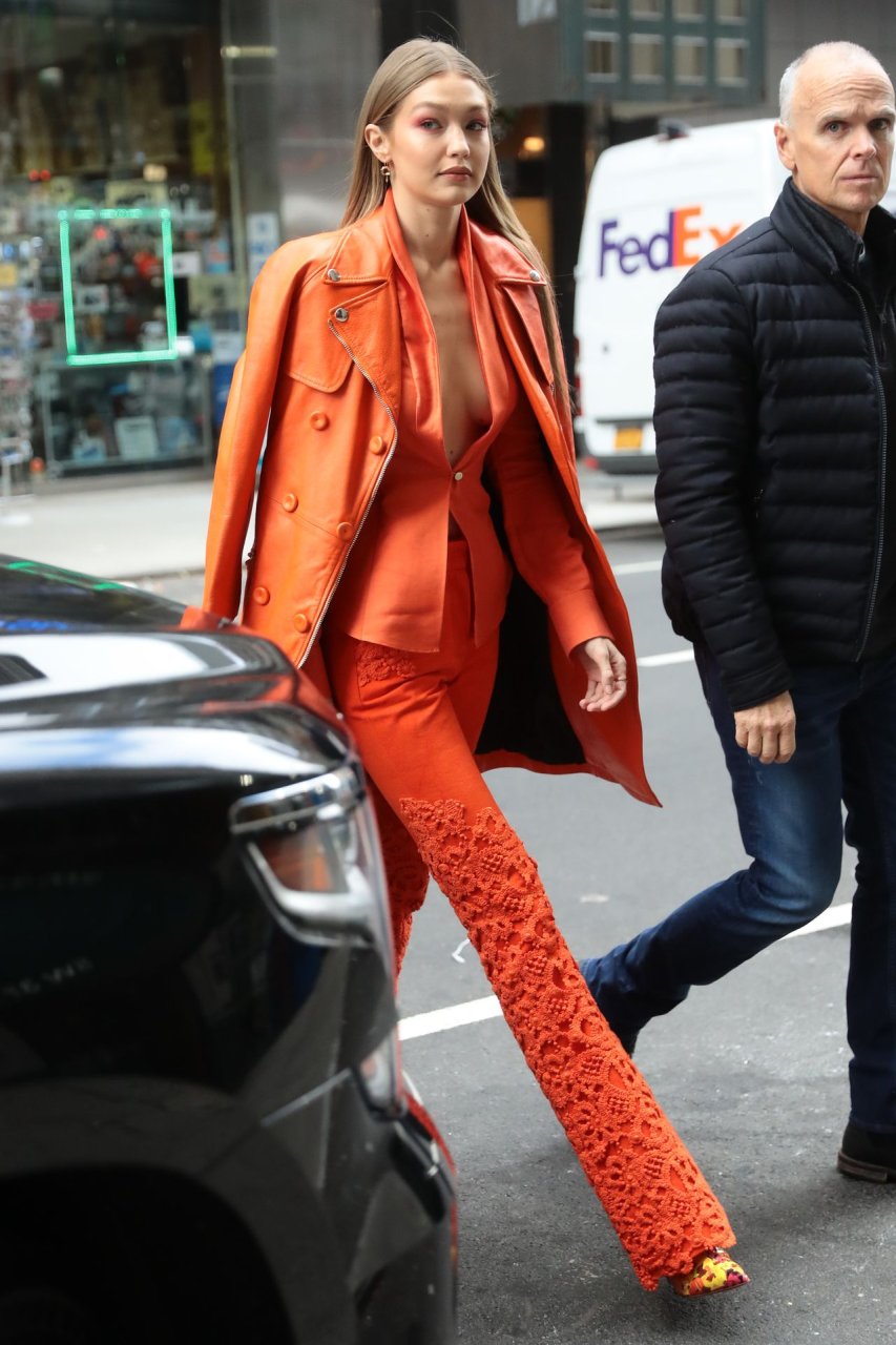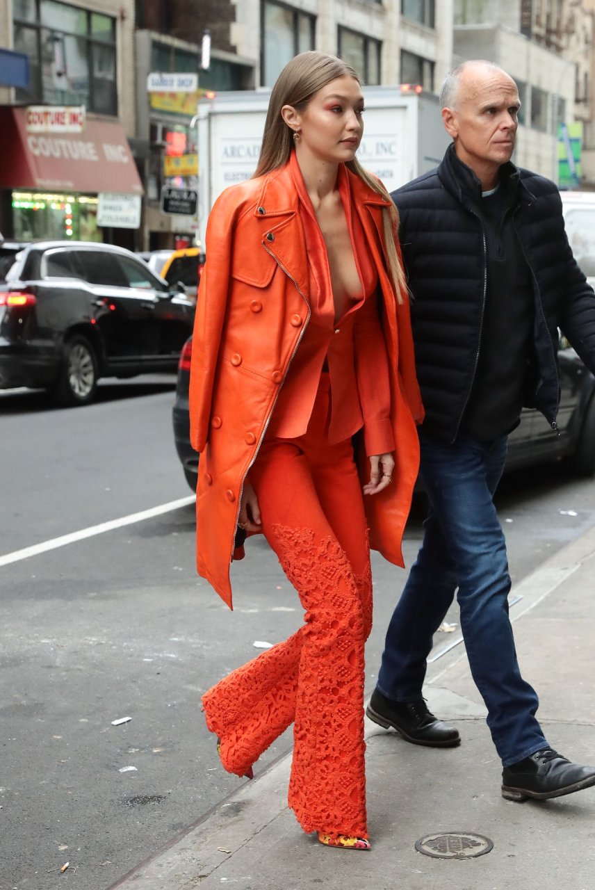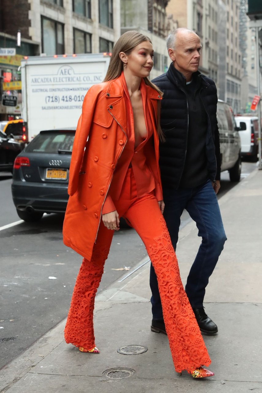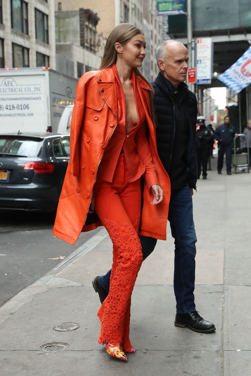 Le mannequin Gigi Hadid a été aperçue montrant son décolleté et son côté de poitrine en arrivant chez Vogue pour Gigi à New York, le 11/12/2018.