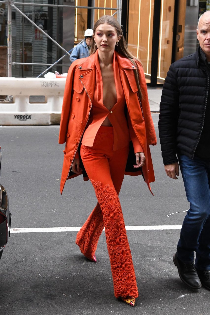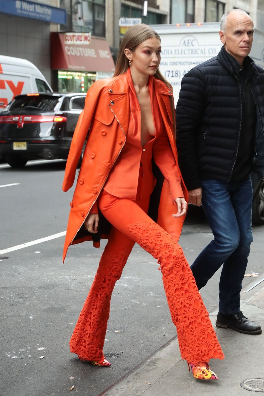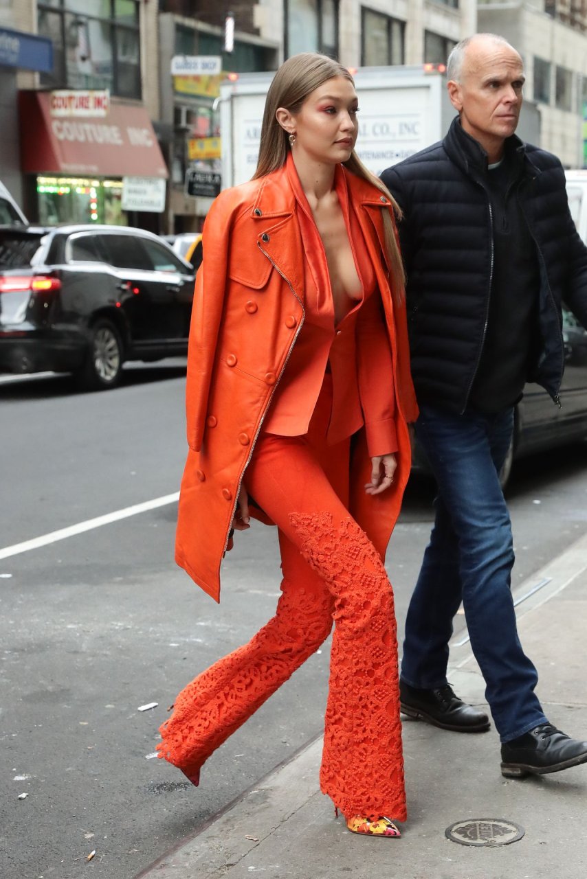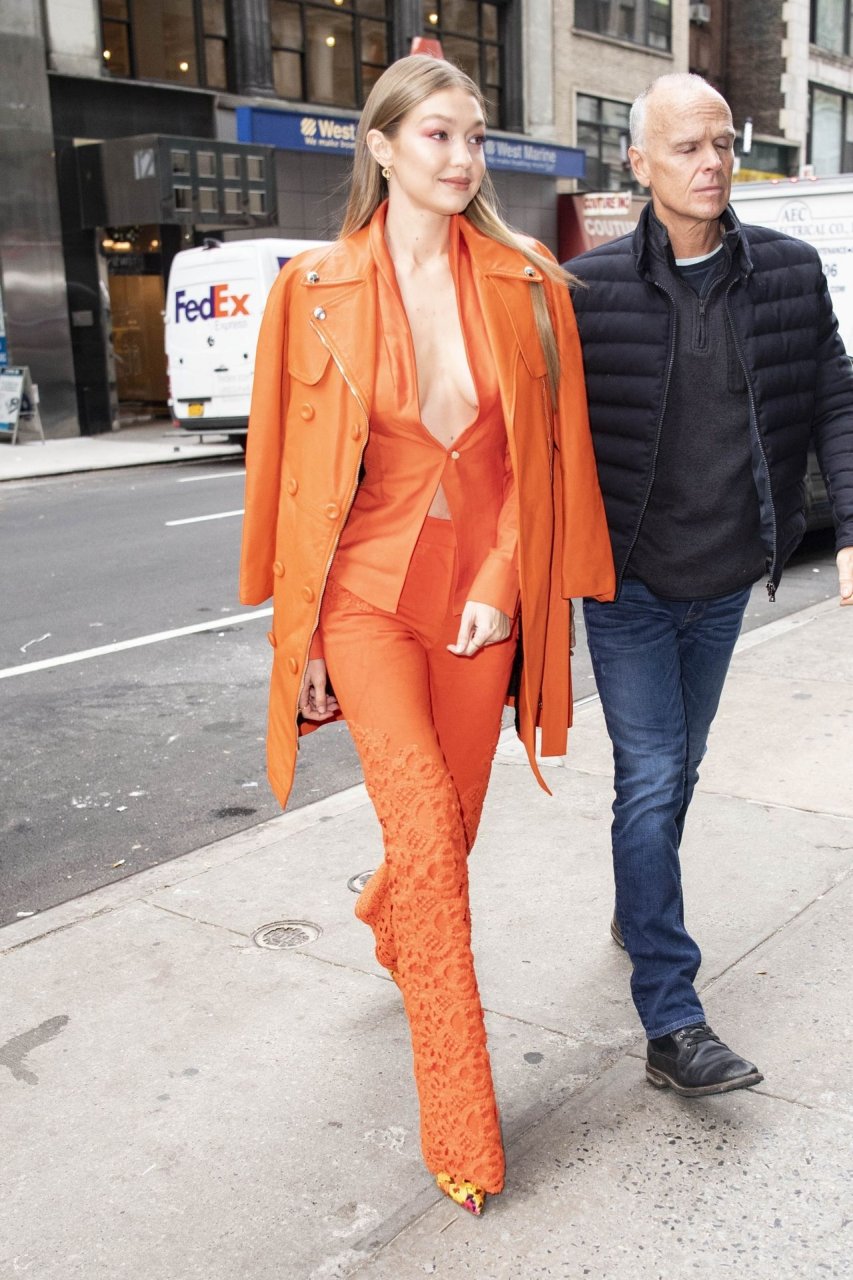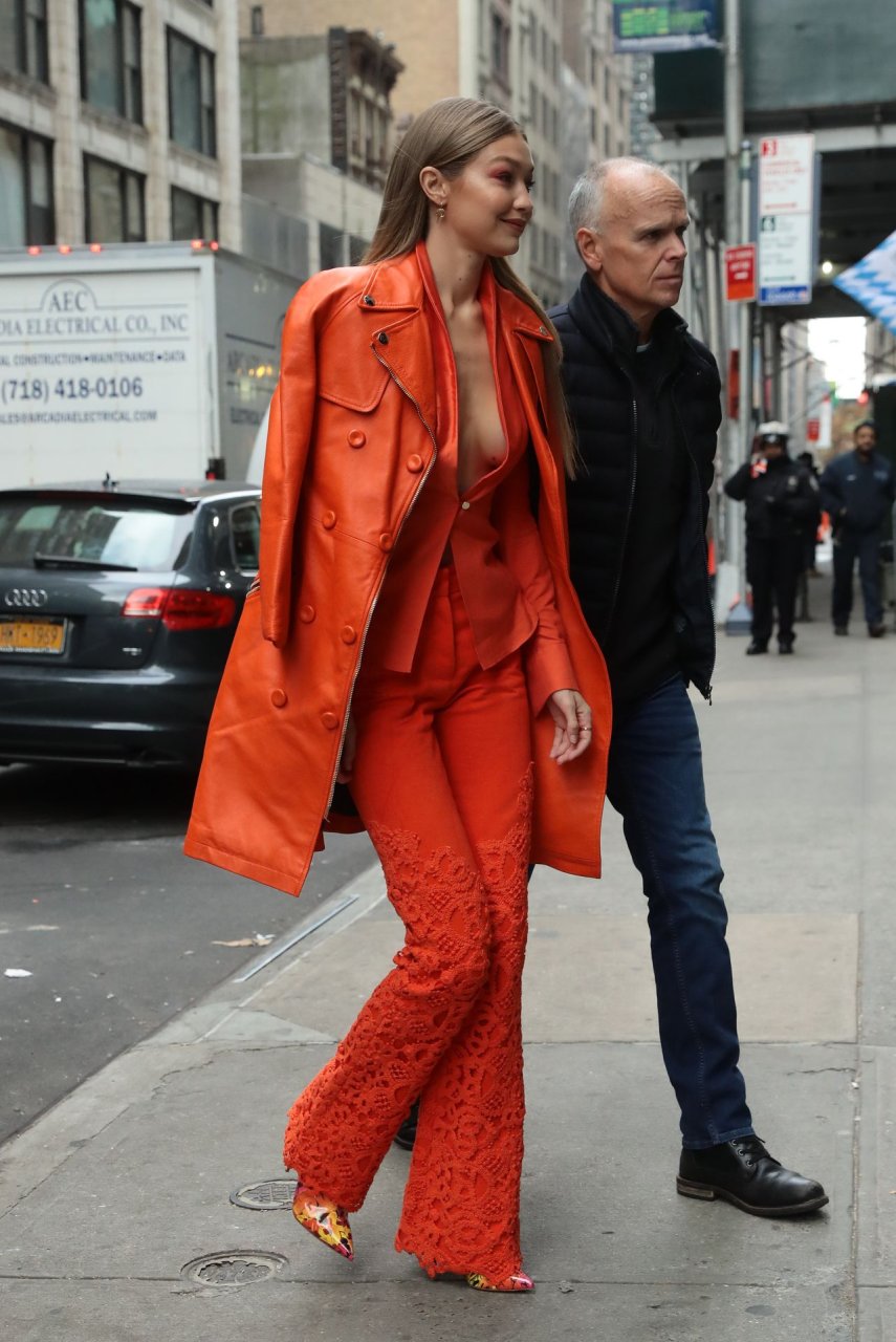 Le mannequin Gigi Hadid a été aperçue montrant son décolleté et son côté de poitrine en arrivant chez Vogue pour Gigi à New York, le 11/12/2018.