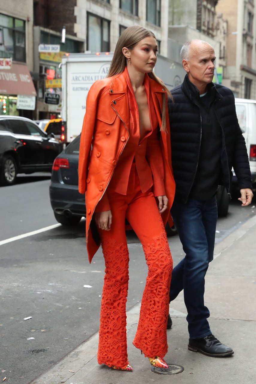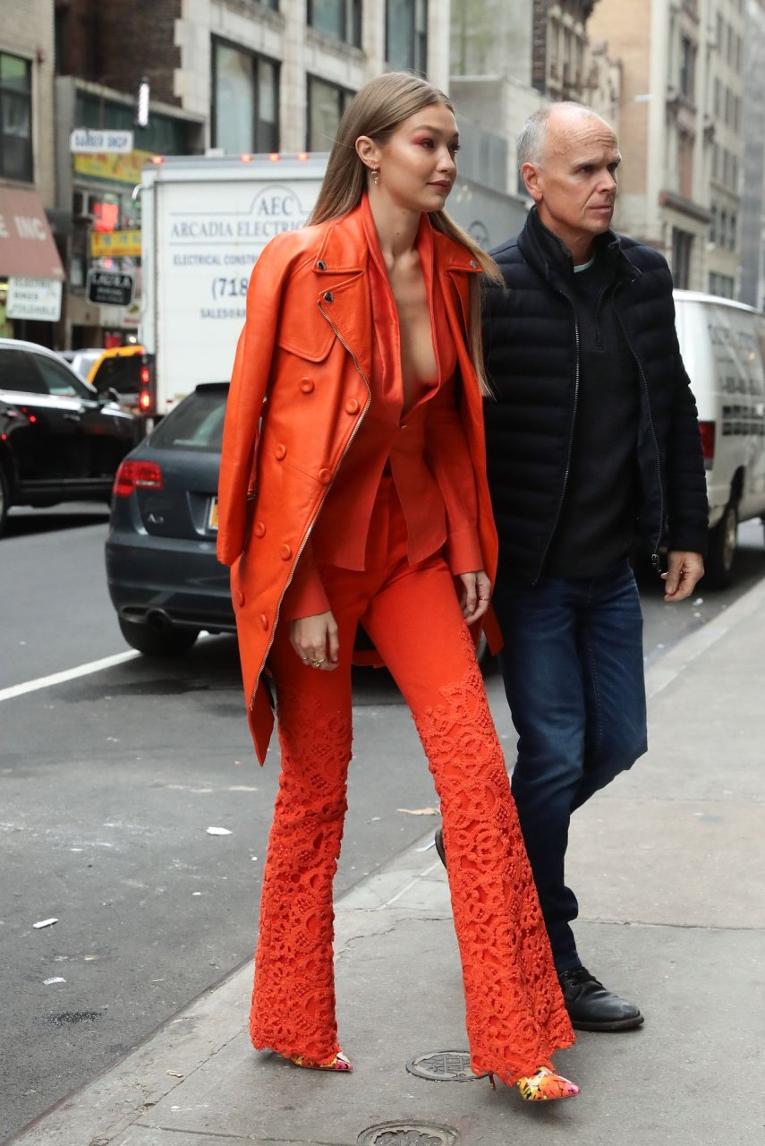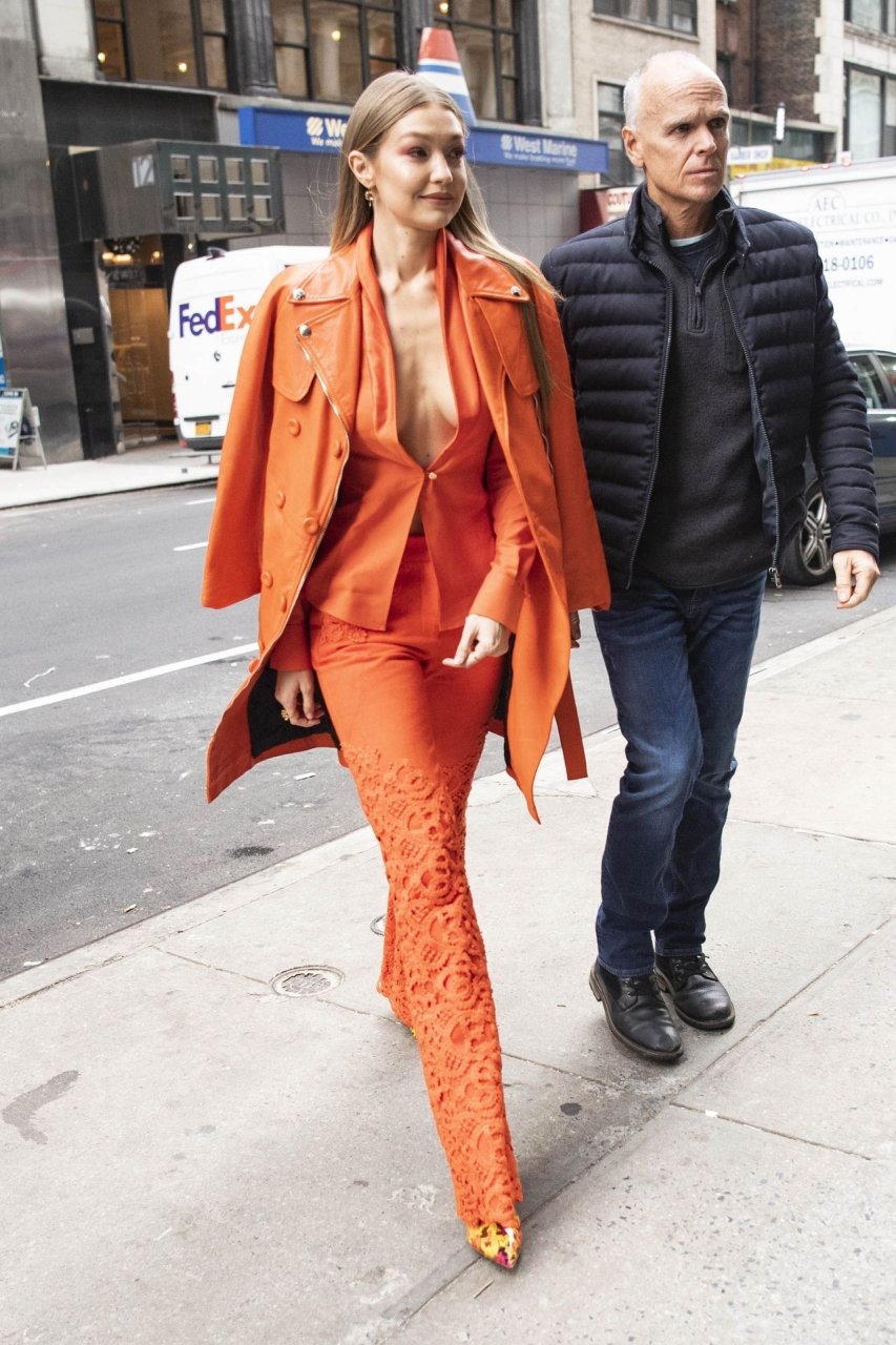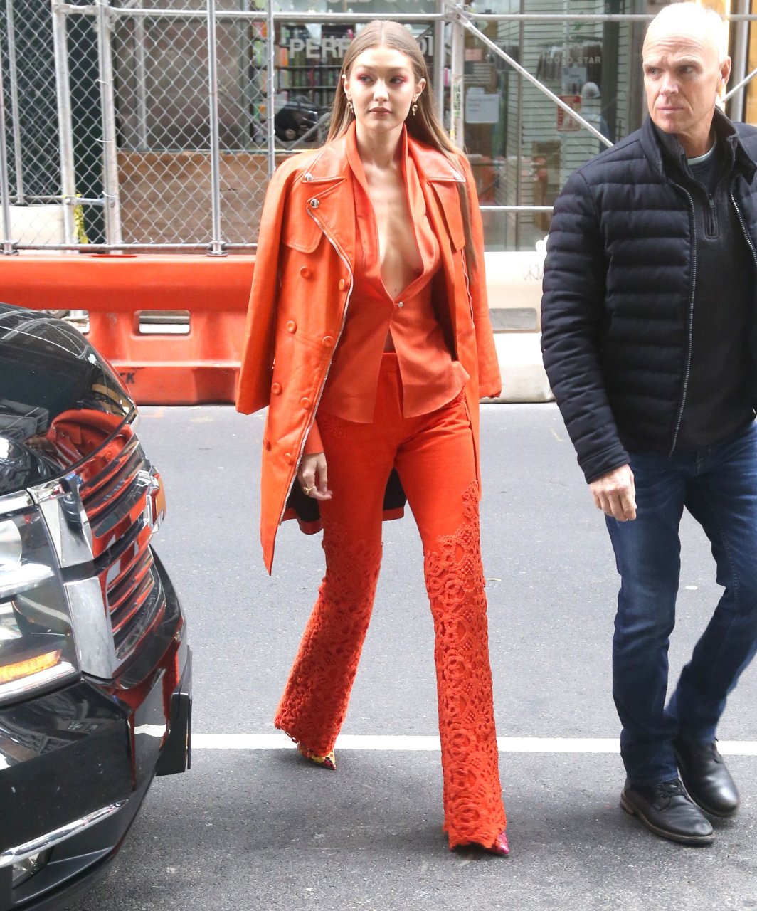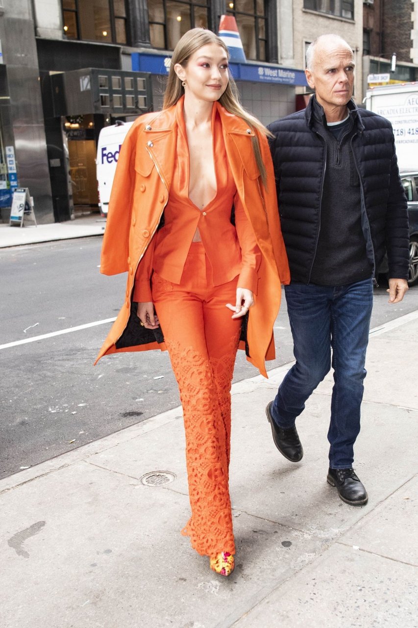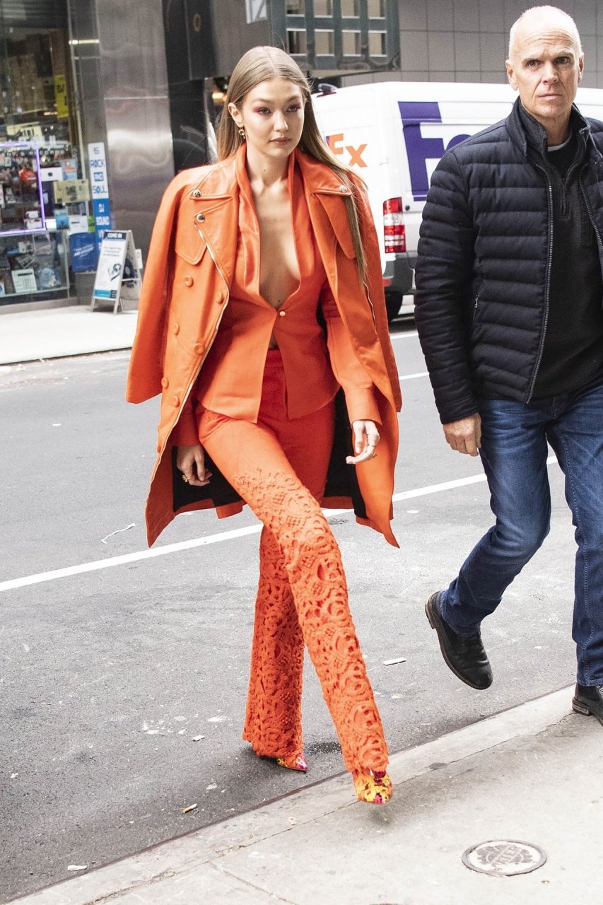 Le mannequin Gigi Hadid a été aperçue montrant son décolleté et son côté de poitrine en arrivant chez Vogue pour Gigi à New York, le 11/12/2018.