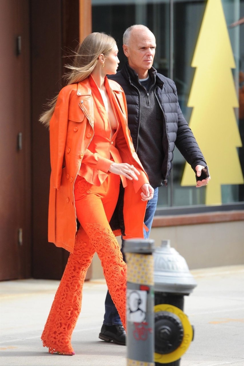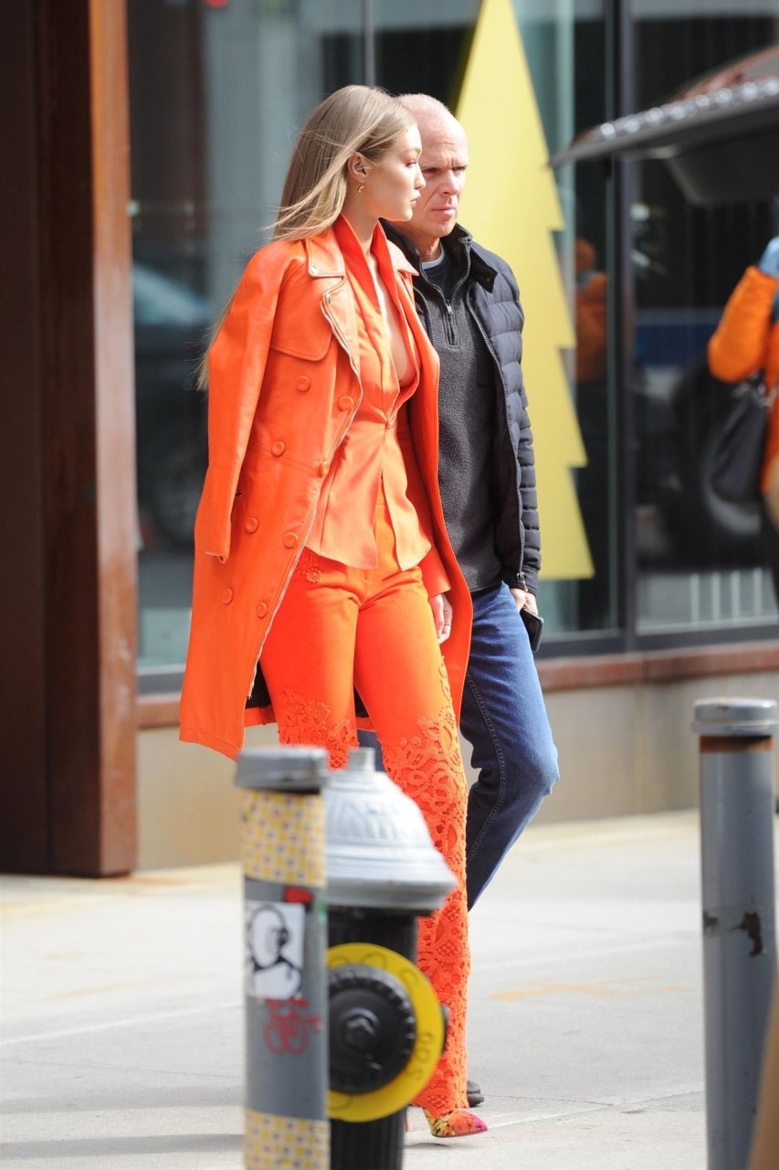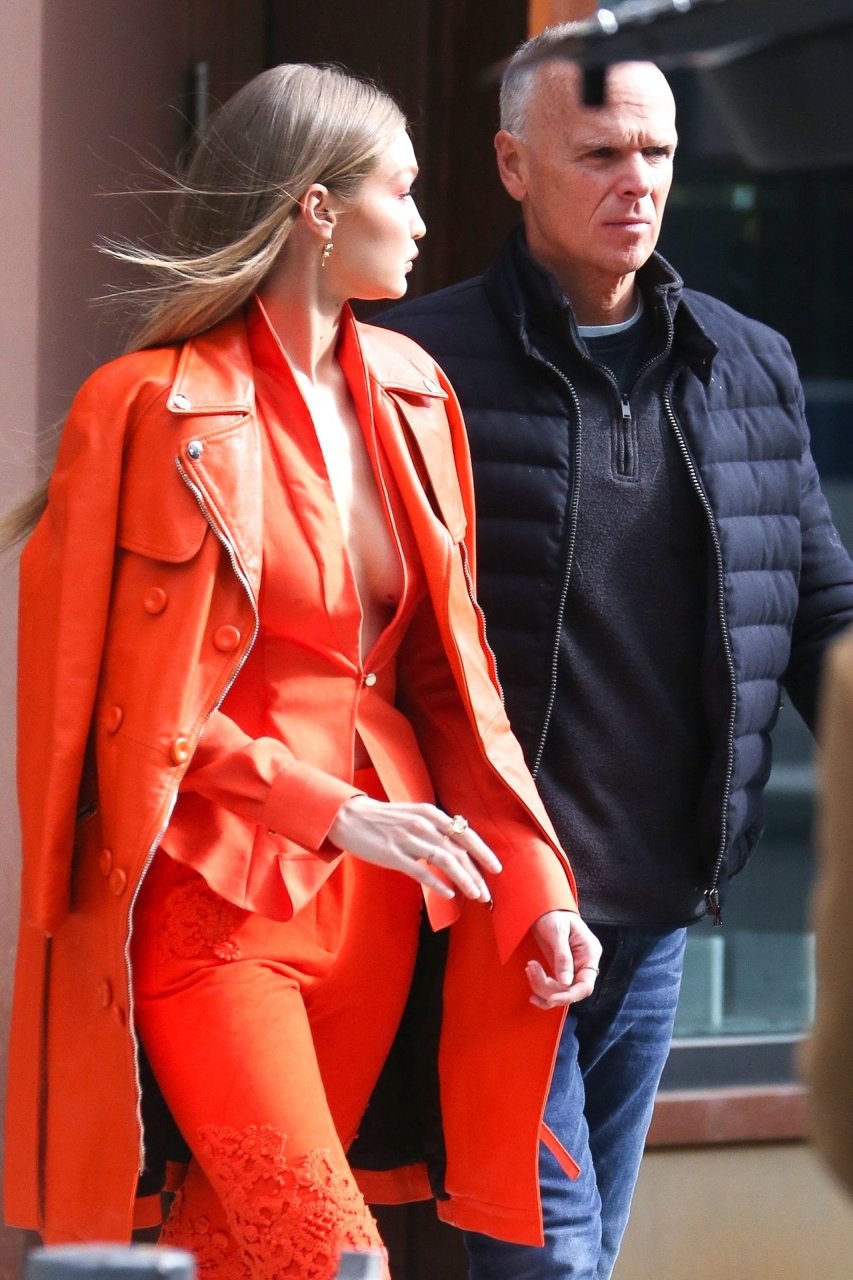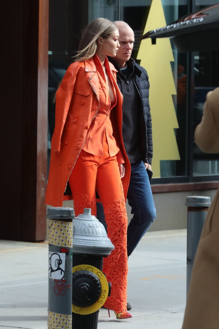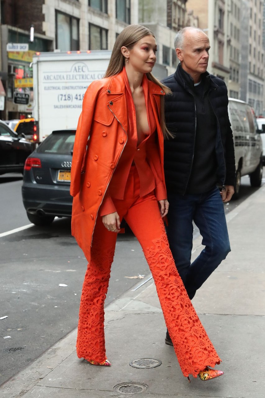 Le mannequin Gigi Hadid a été aperçue montrant son décolleté et son côté de poitrine en arrivant chez Vogue pour Gigi à New York, le 11/12/2018.