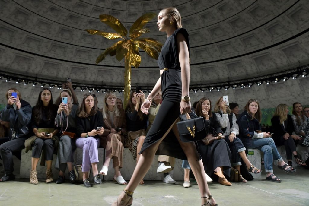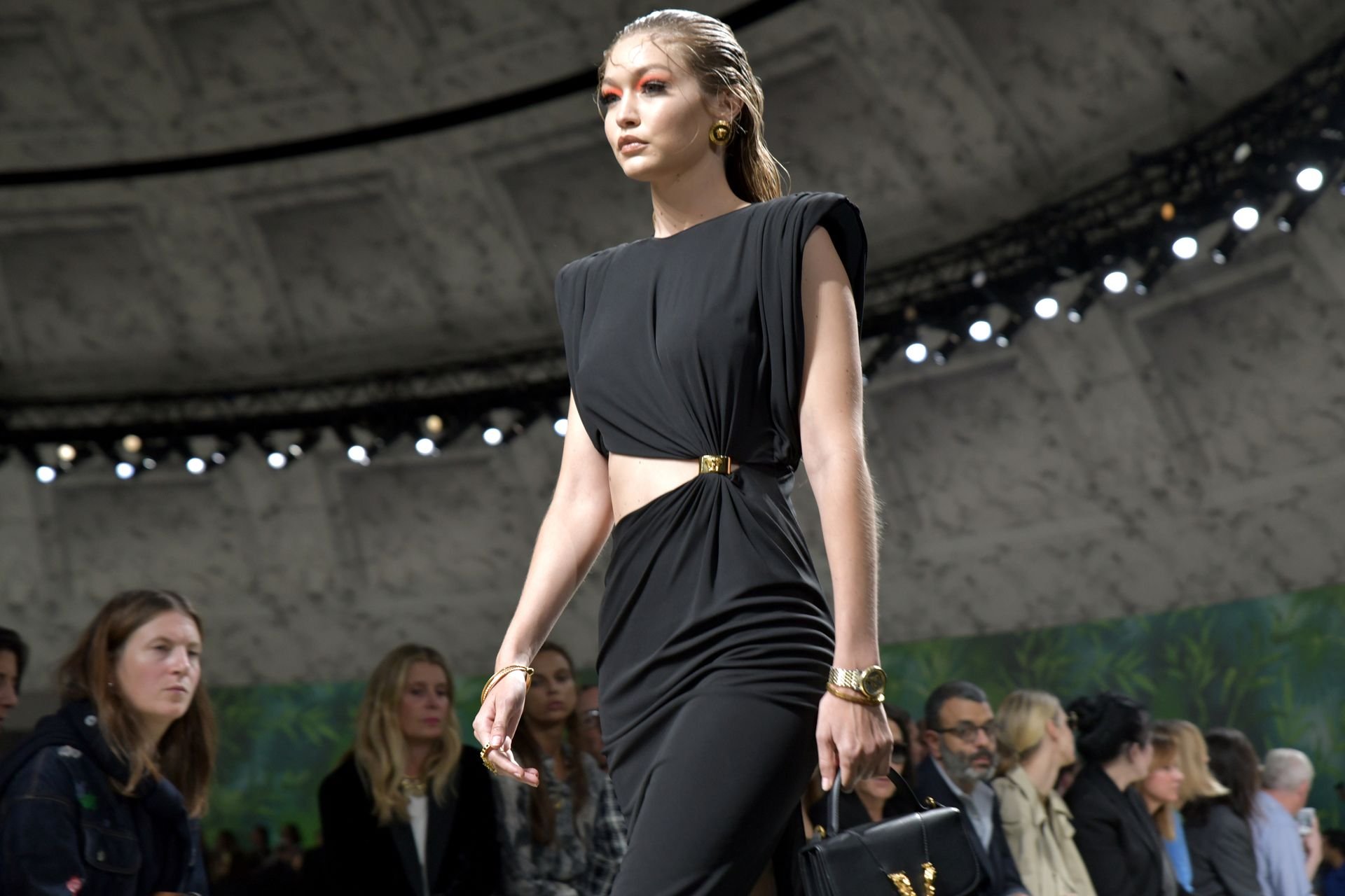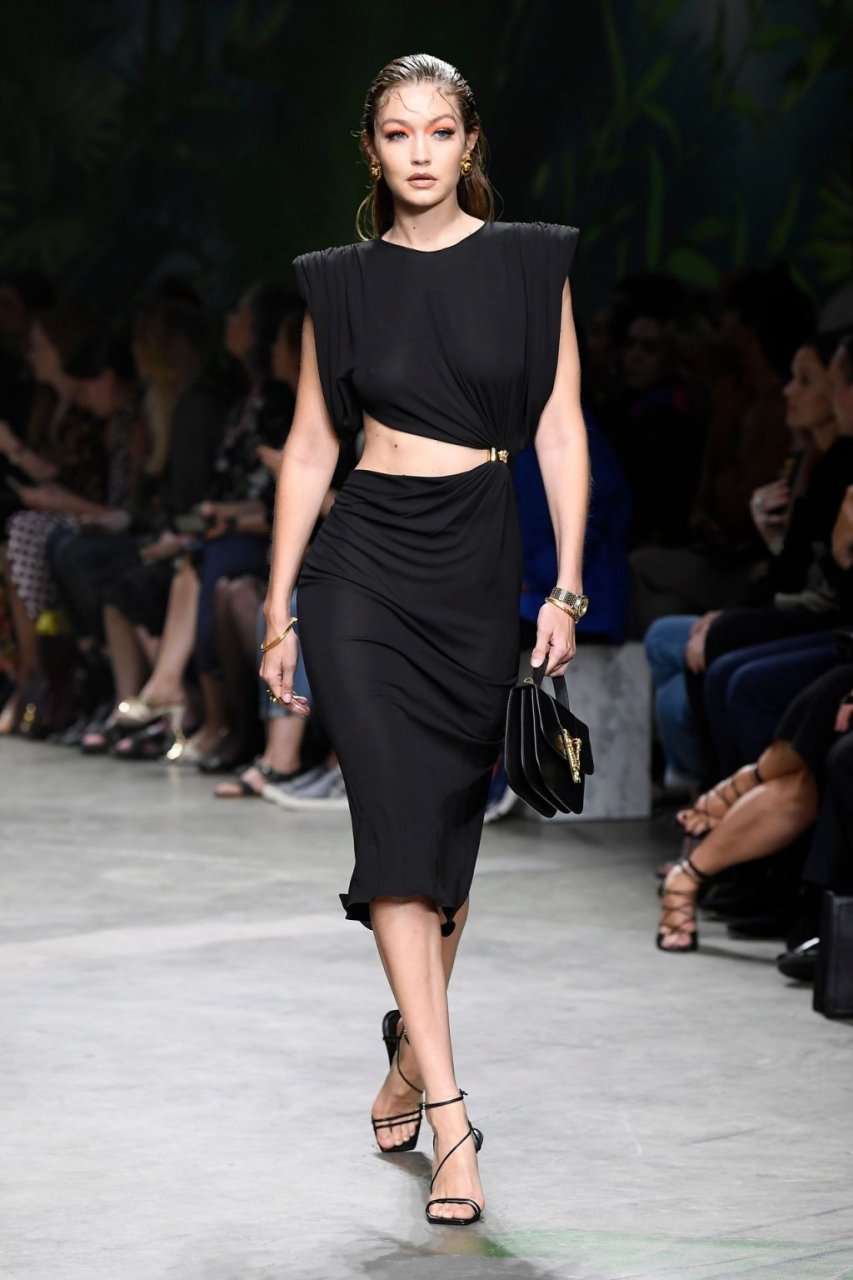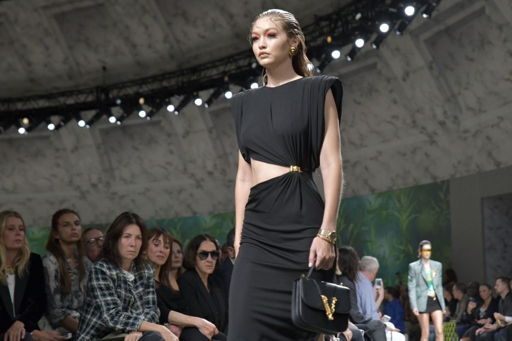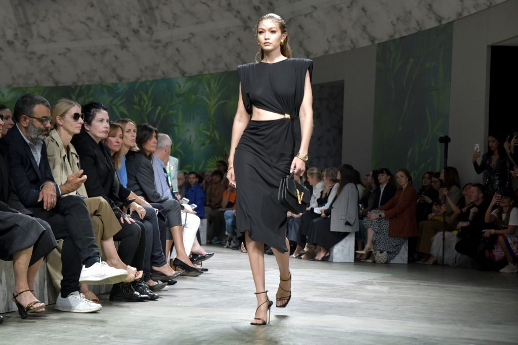 Le mannequin Gigi Hadid défile sans soutien-gorge pour le défilé Versace printemps/été 2020 lors de la Fashion Week de Milan en Italie, 20/09/2019.