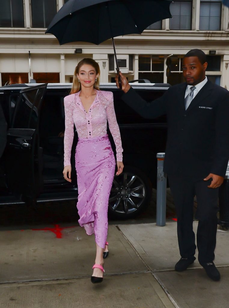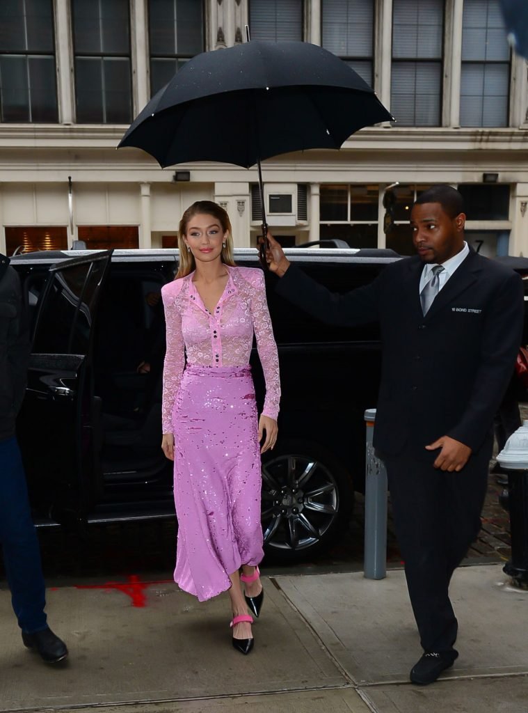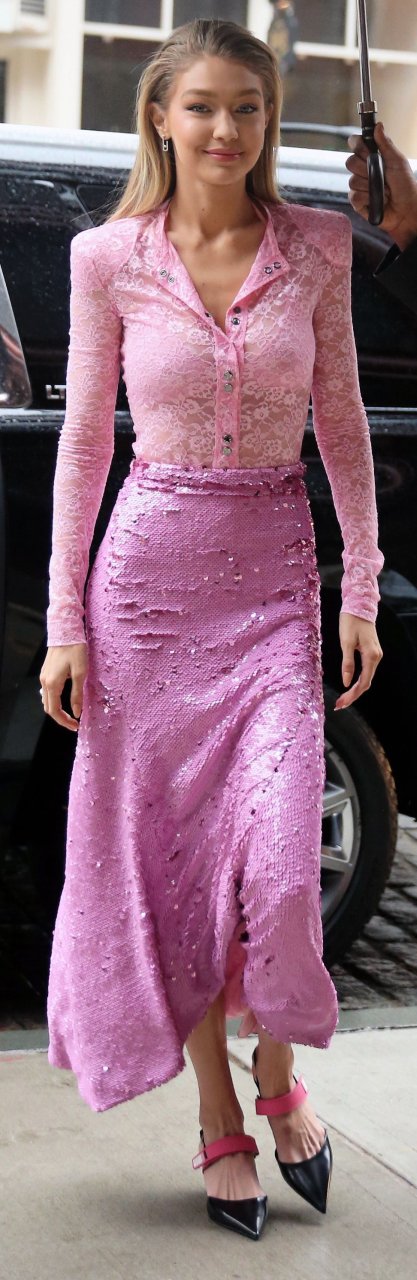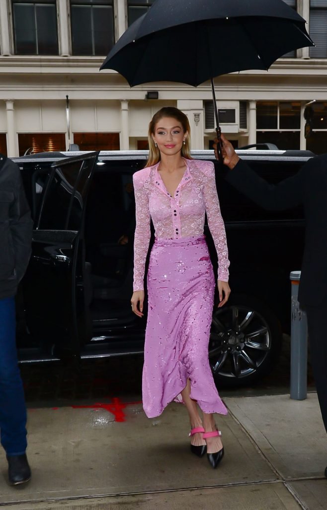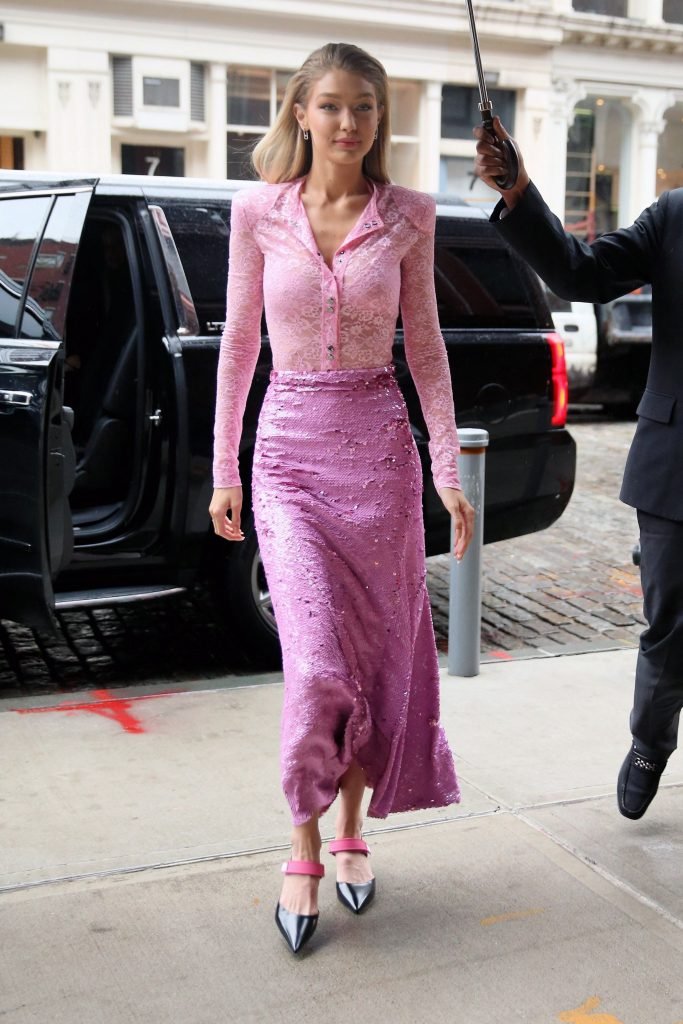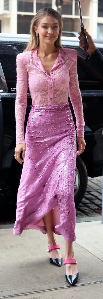 Model Gigi Hadid, 22 ans, porte un chemisier en dentelle rose et une jupe rose à New York, le 12/11/2017.