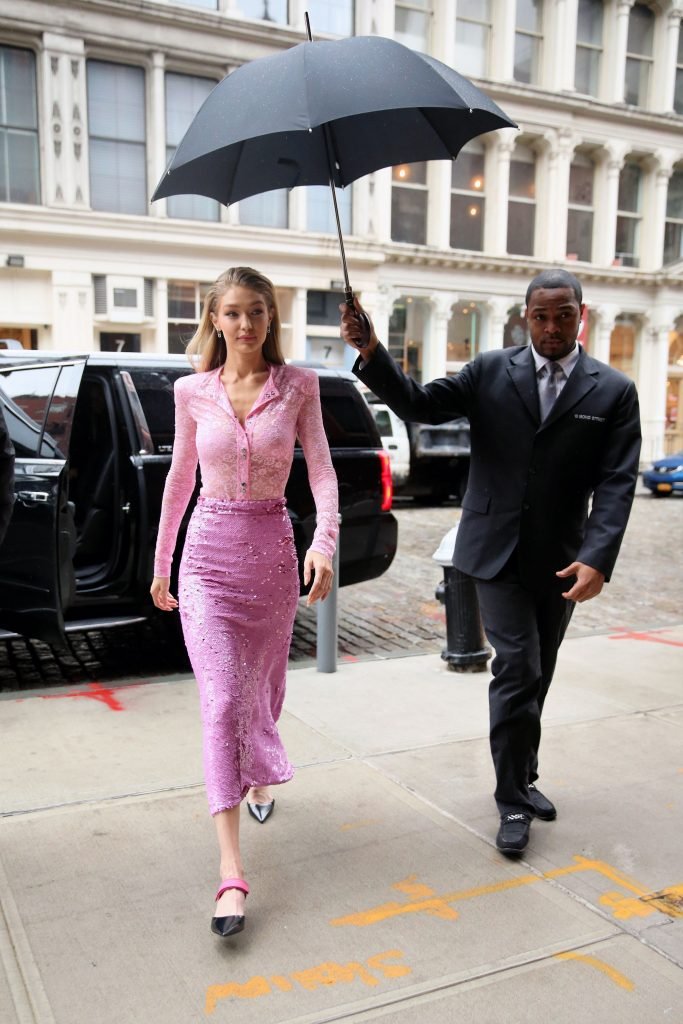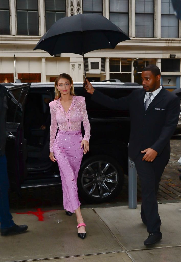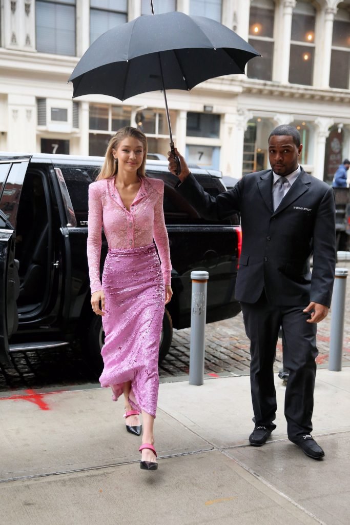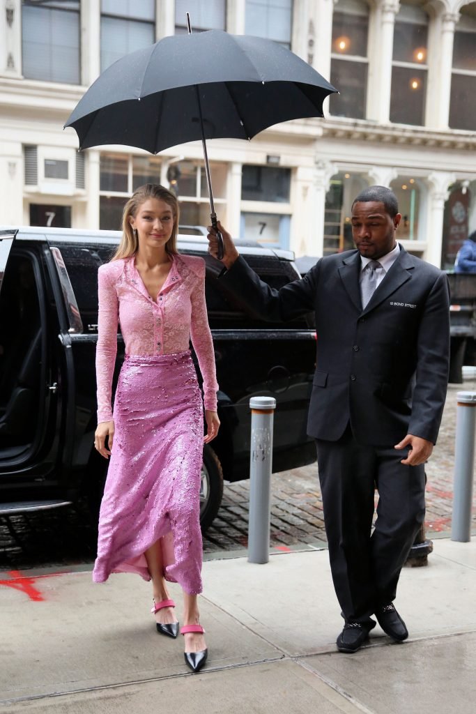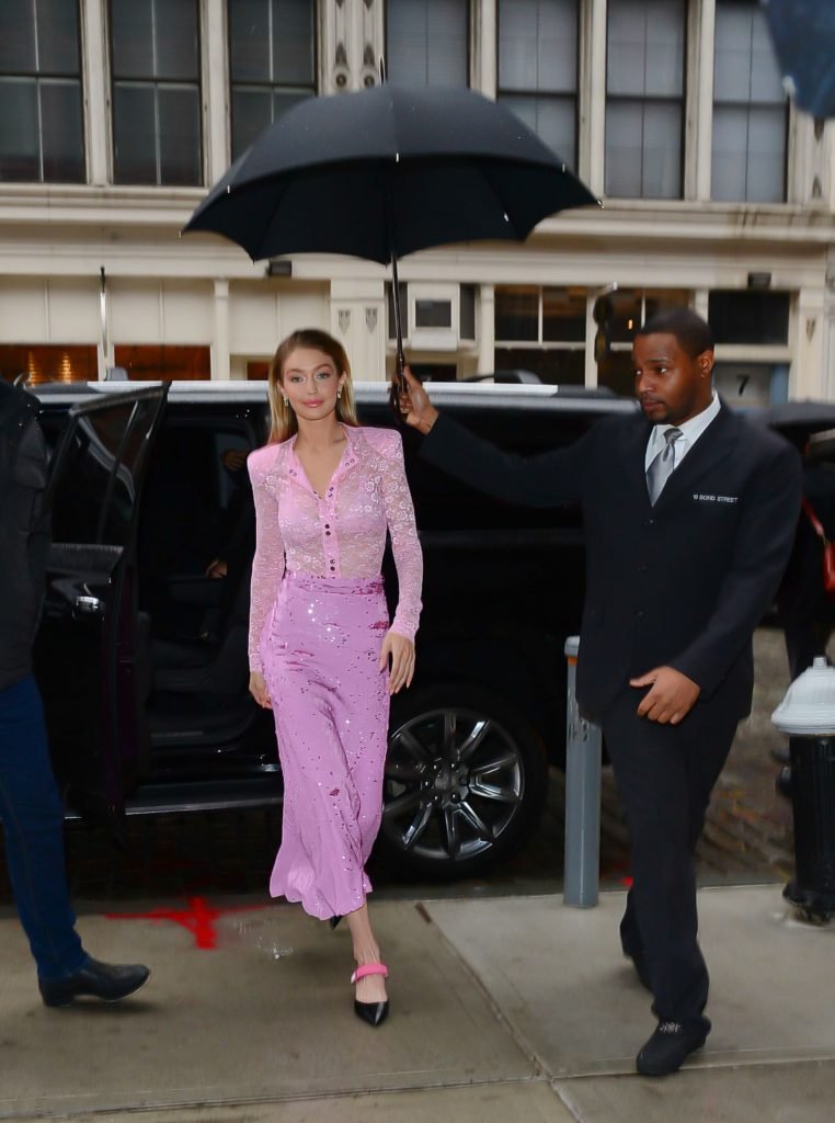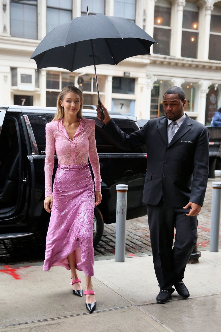 Model Gigi Hadid, 22 ans, porte un chemisier en dentelle rose et une jupe rose à New York, le 12/11/2017.