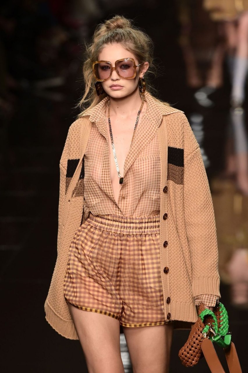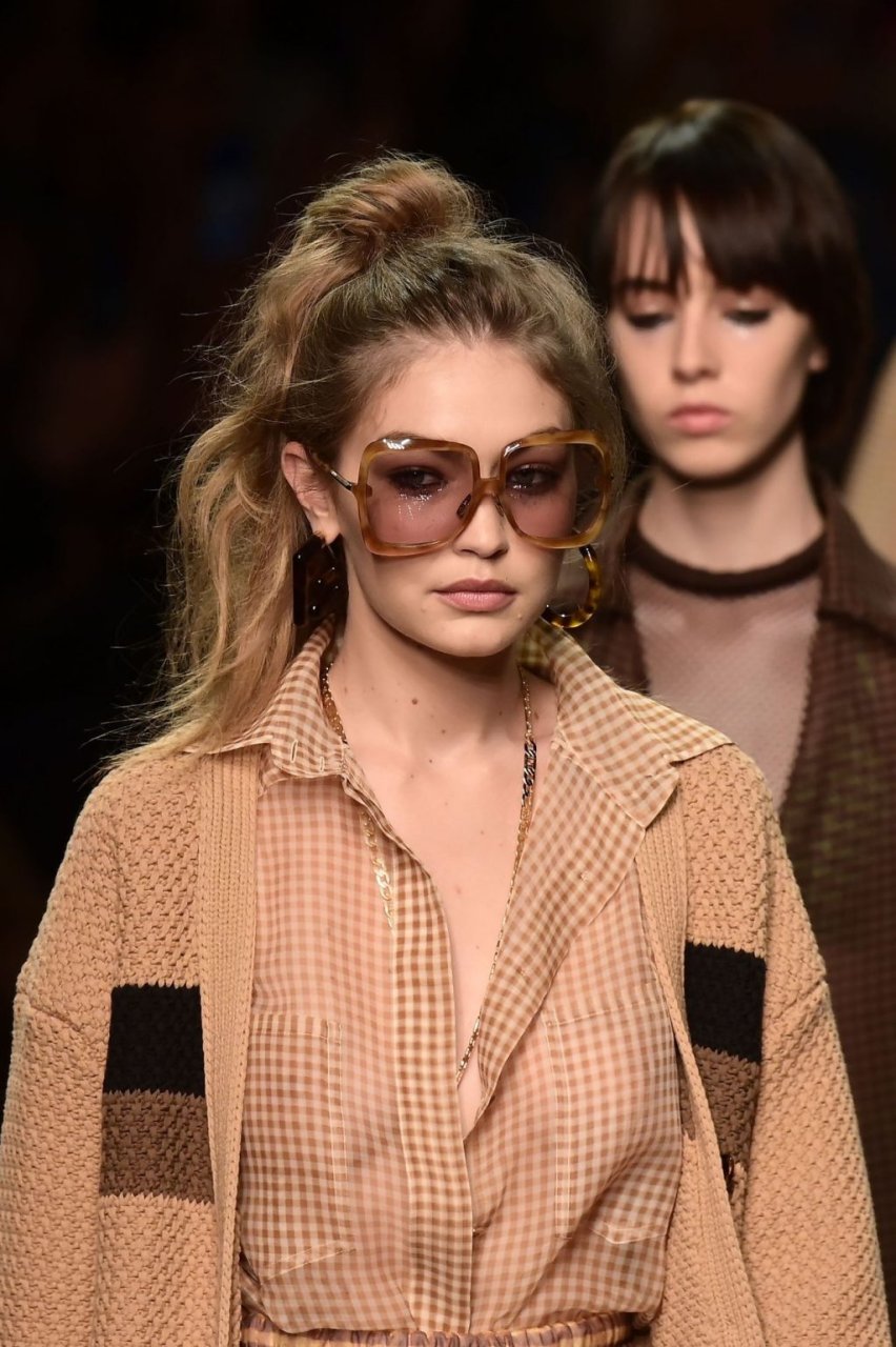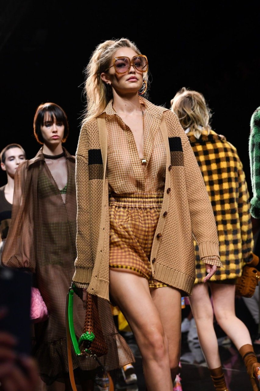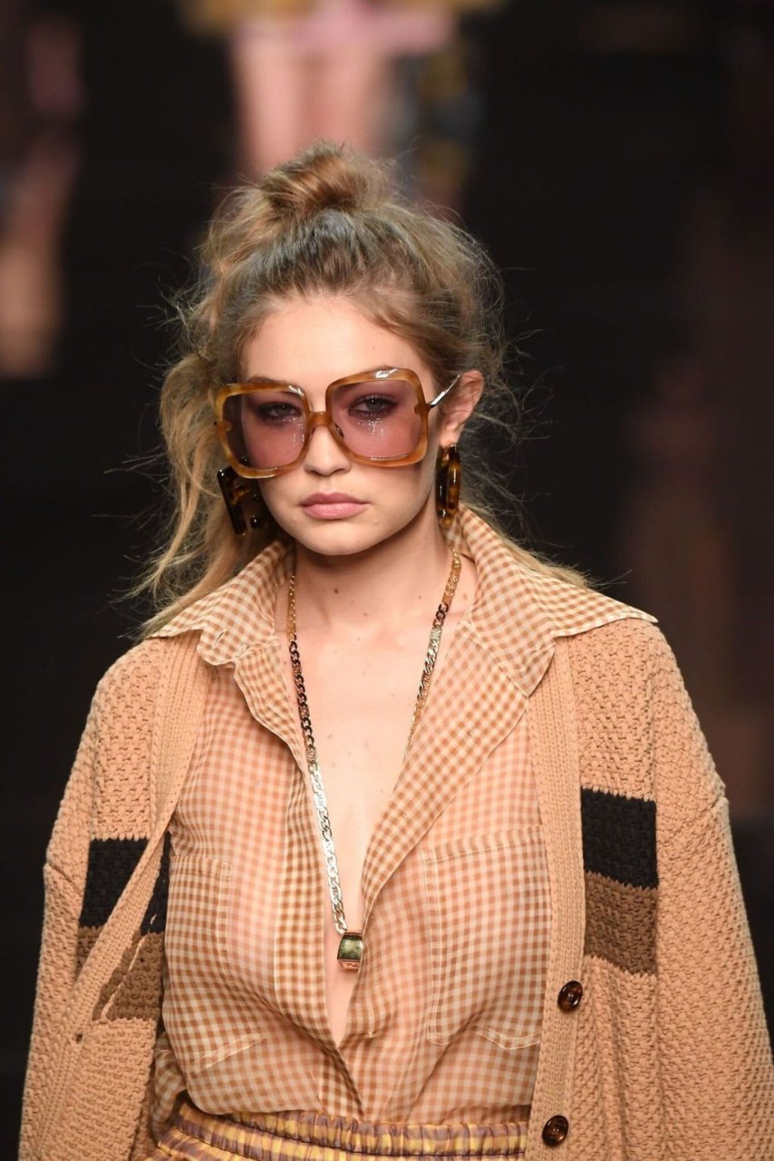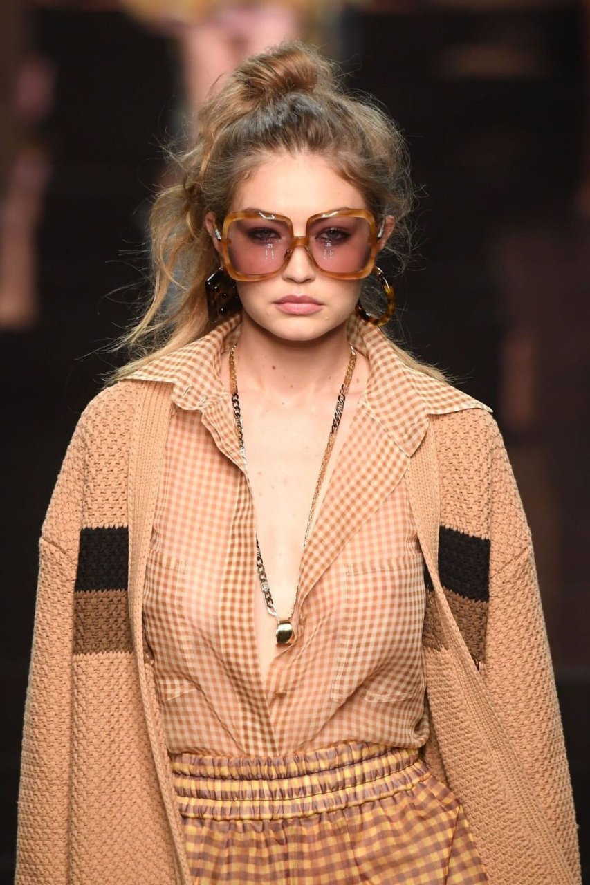Model Gigi Hadid a affiché son décolleté, portant une chemise transparente lors du défilé Fendi pendant la Semaine de la Mode de Milan Printemps/Été 2020, 19/09/2019.