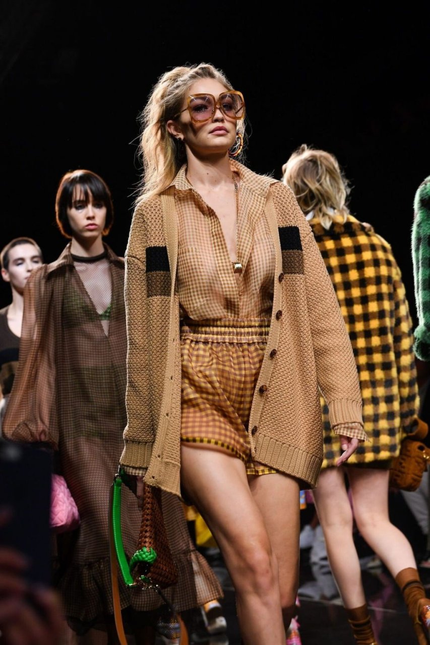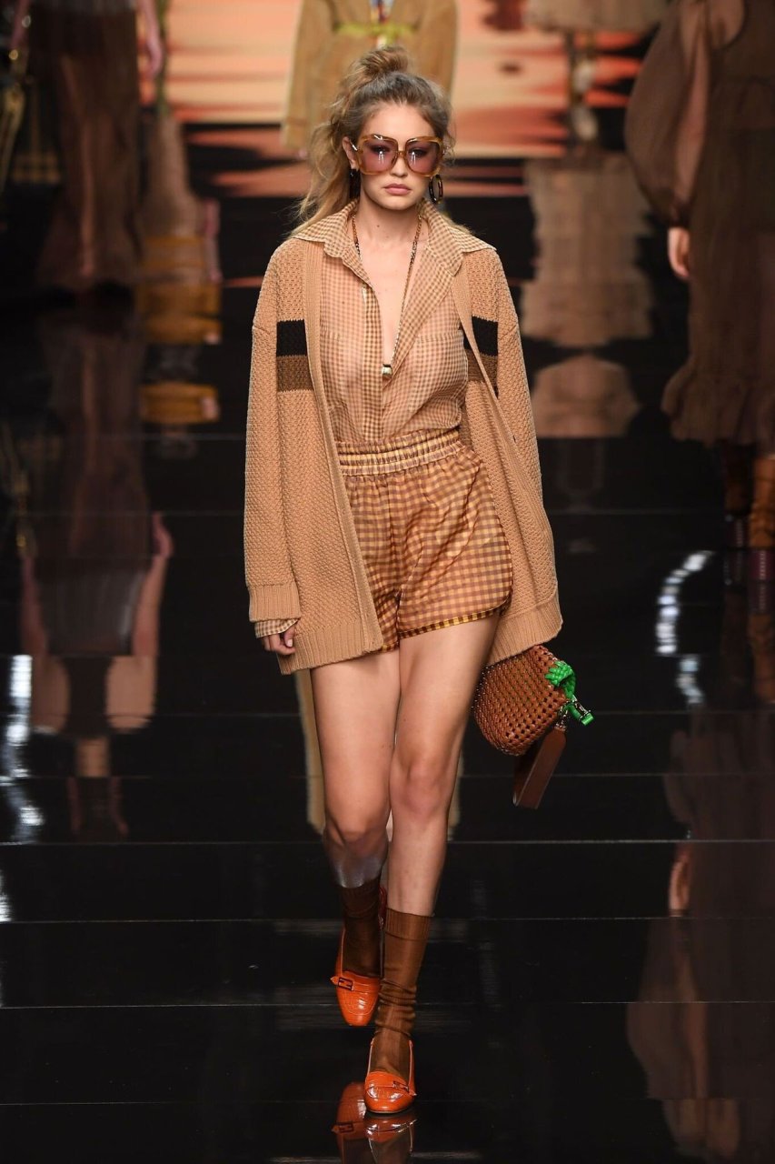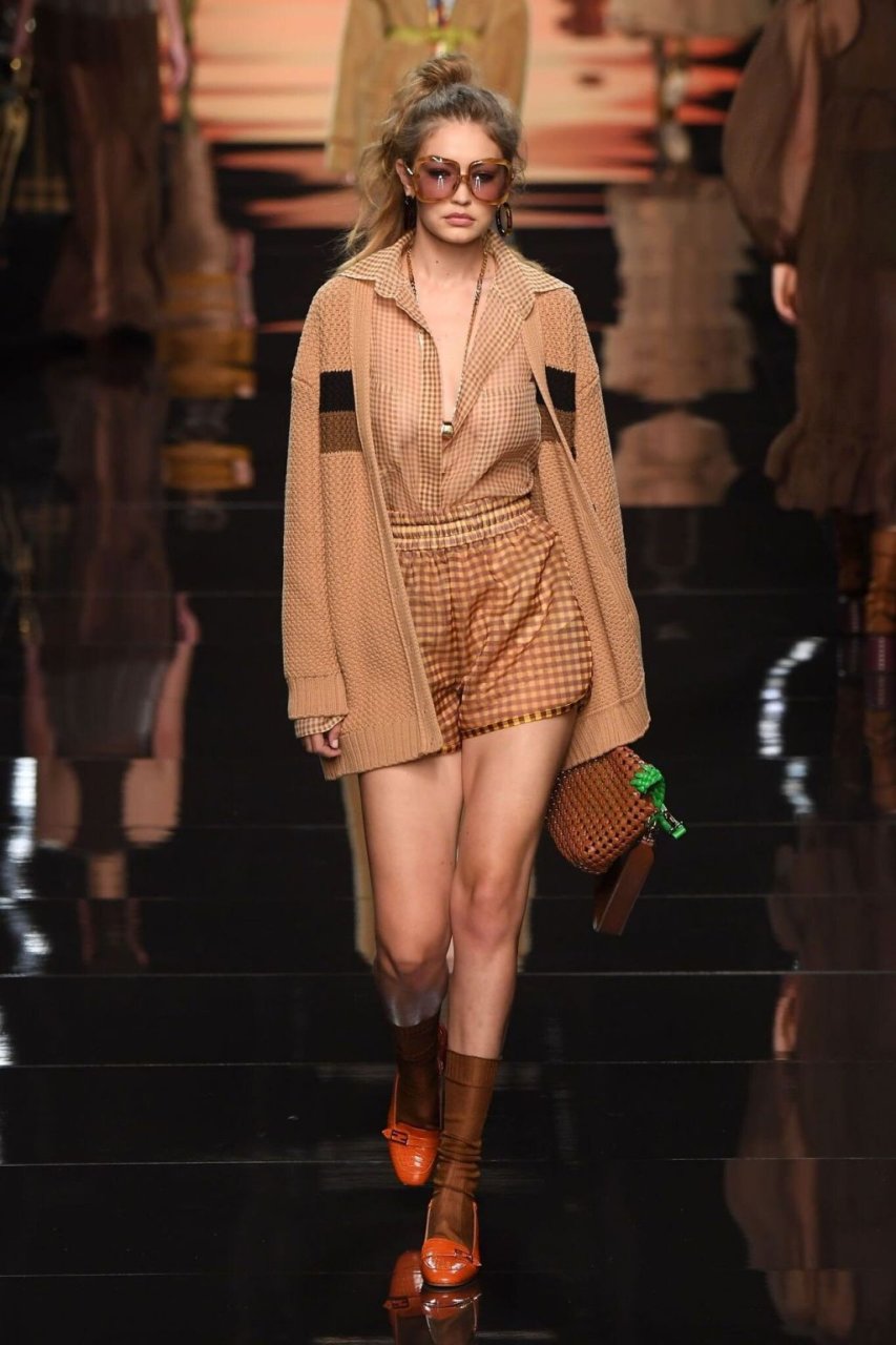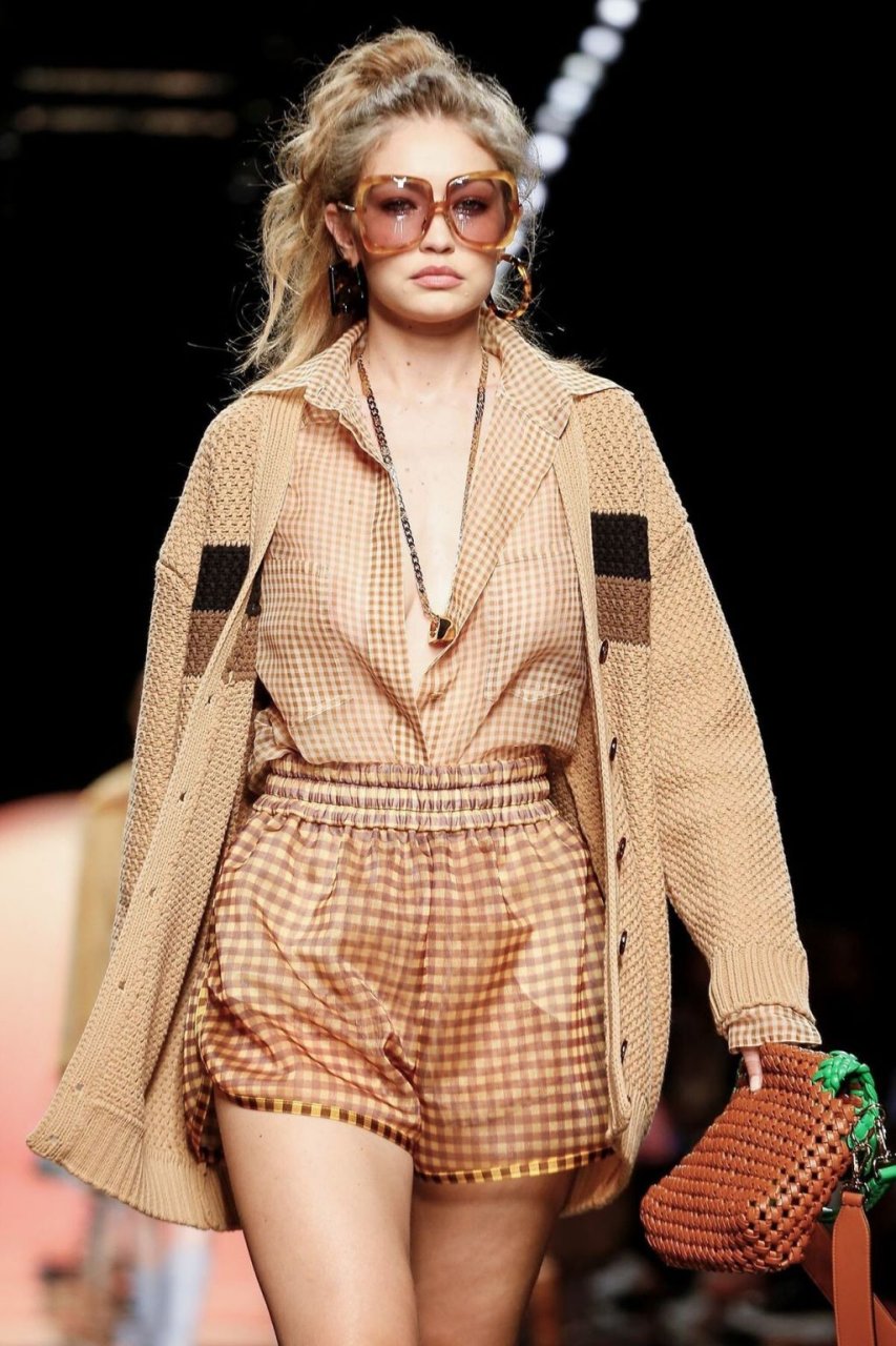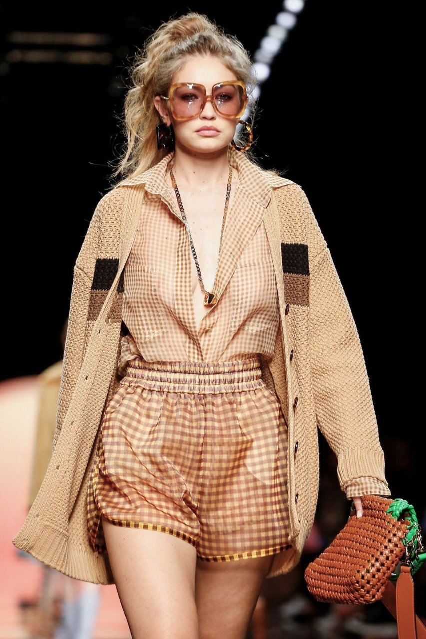 Model Gigi Hadid a affiché son décolleté, portant une chemise transparente lors du défilé Fendi pendant la Semaine de la Mode de Milan Printemps/Été 2020, 19/09/2019.