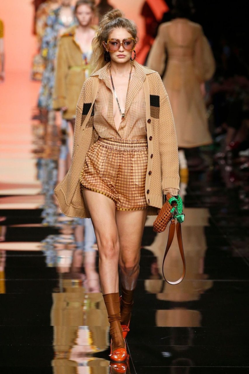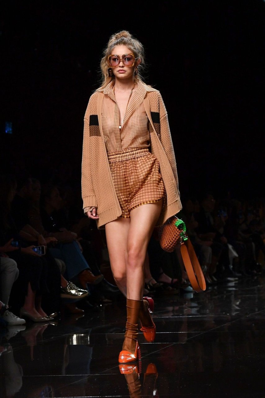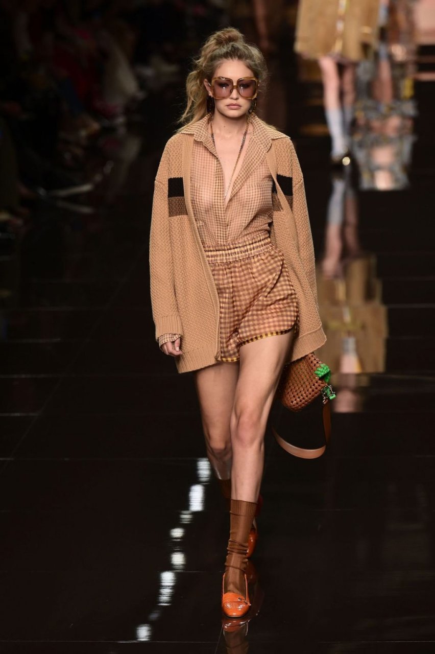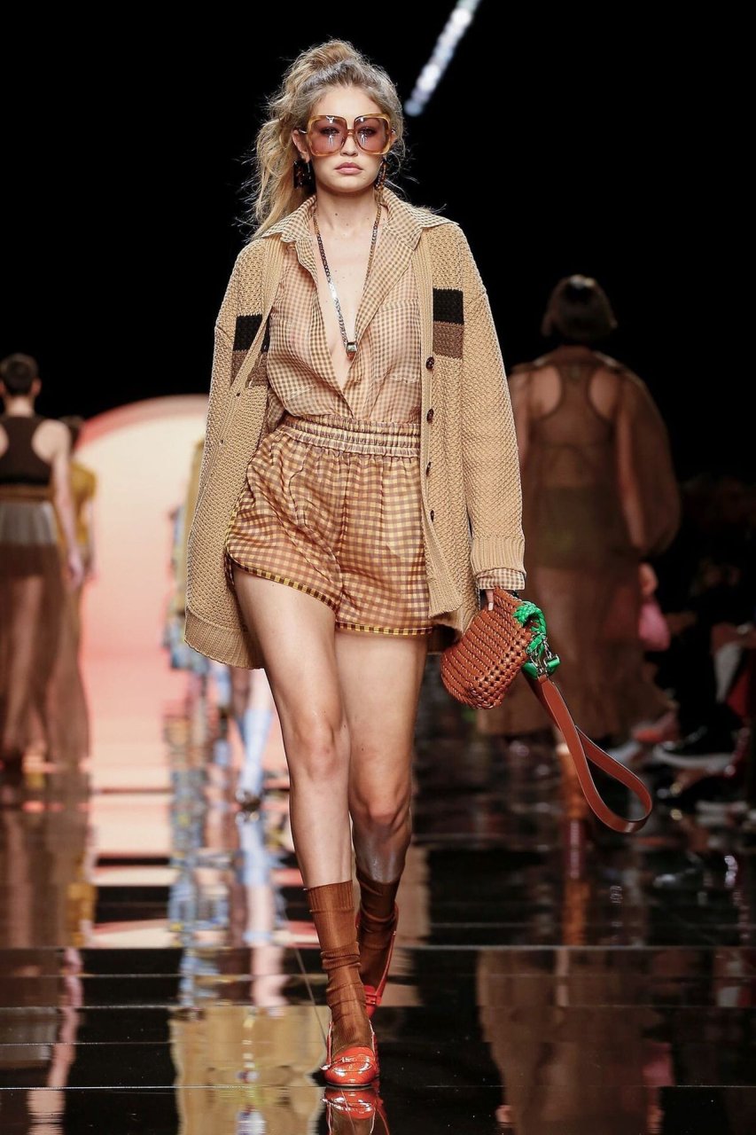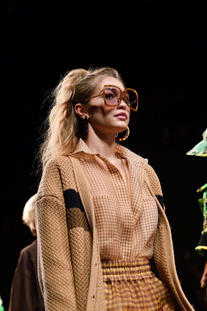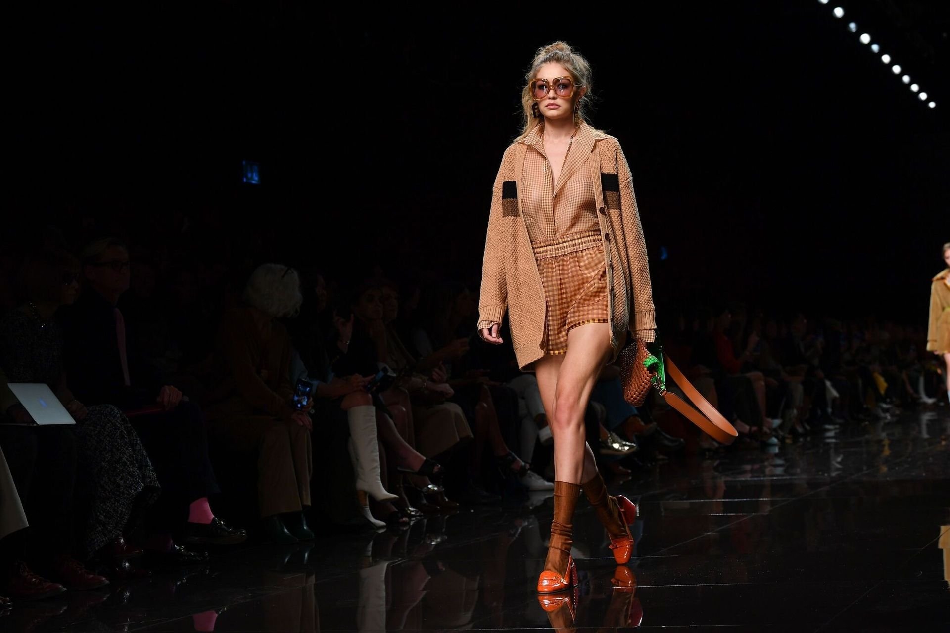 Model Gigi Hadid a affiché son décolleté, portant une chemise transparente lors du défilé Fendi pendant la Semaine de la Mode de Milan Printemps/Été 2020, 19/09/2019.