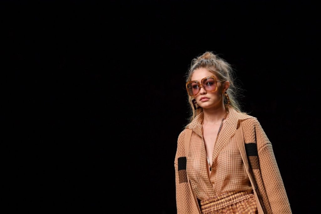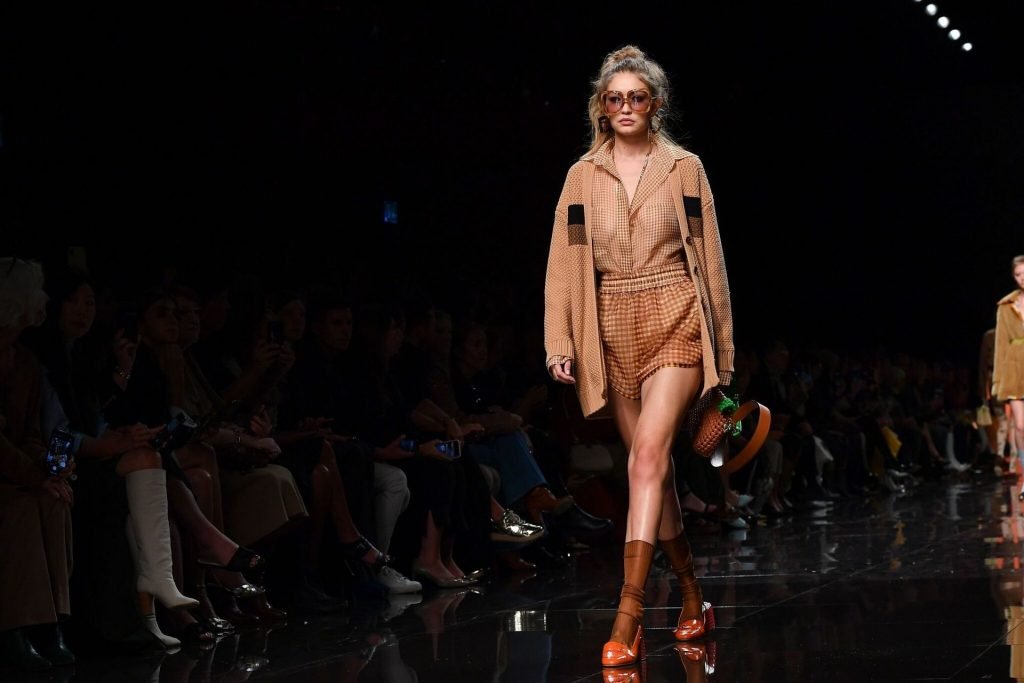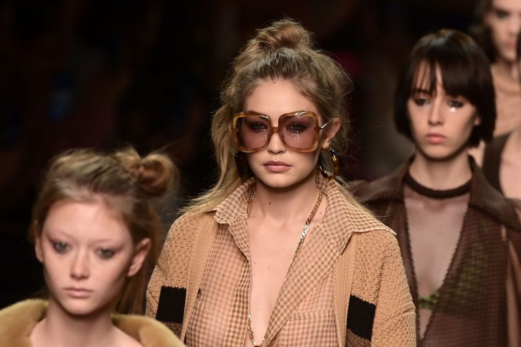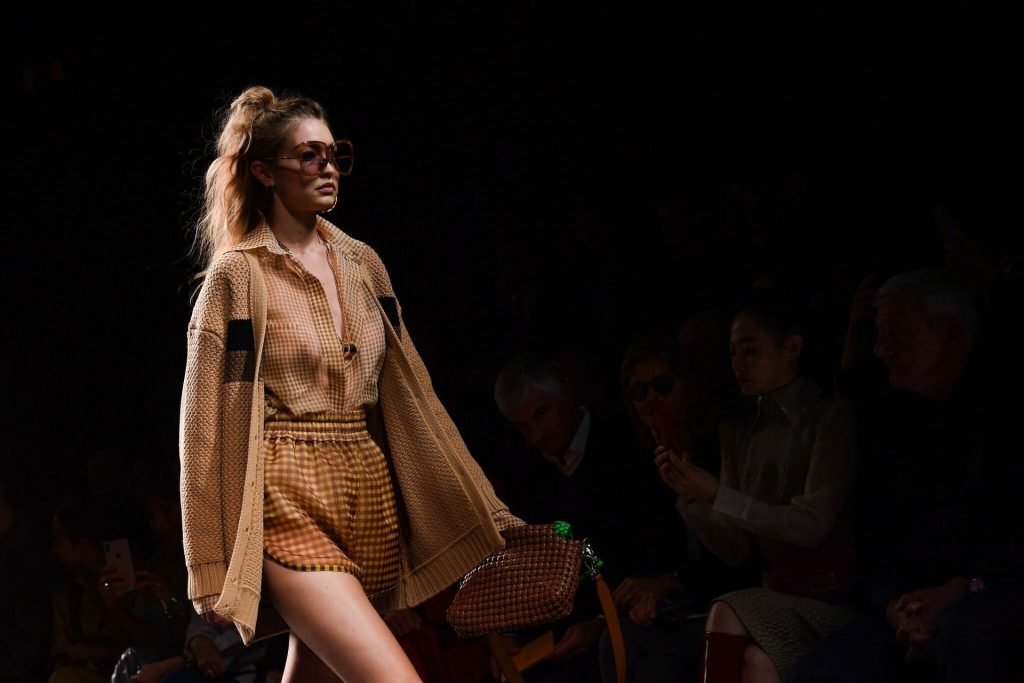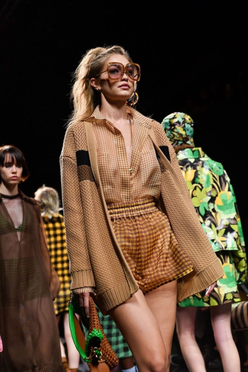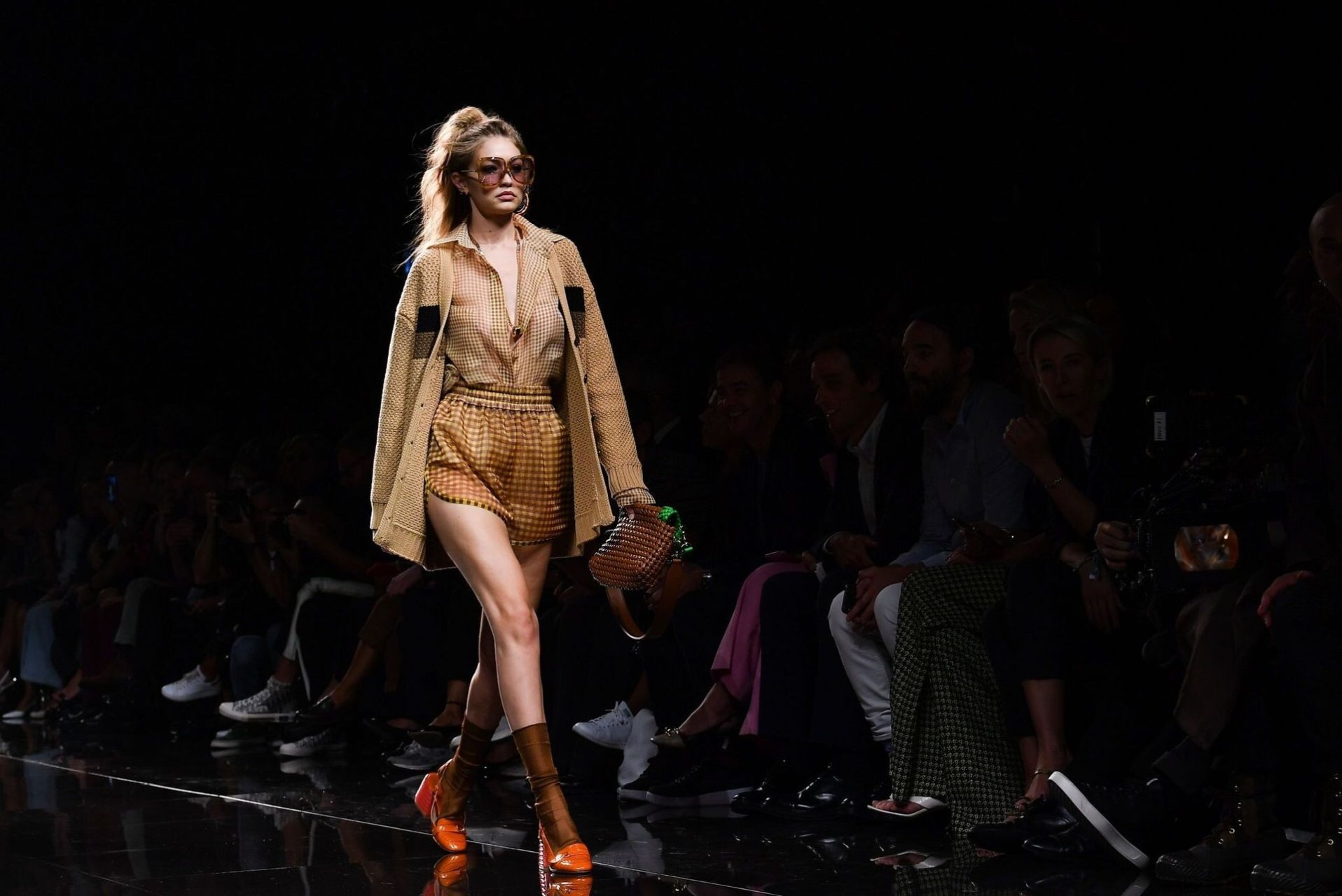 Model Gigi Hadid a affiché son décolleté, portant une chemise transparente lors du défilé Fendi pendant la Semaine de la Mode de Milan Printemps/Été 2020, 19/09/2019.
