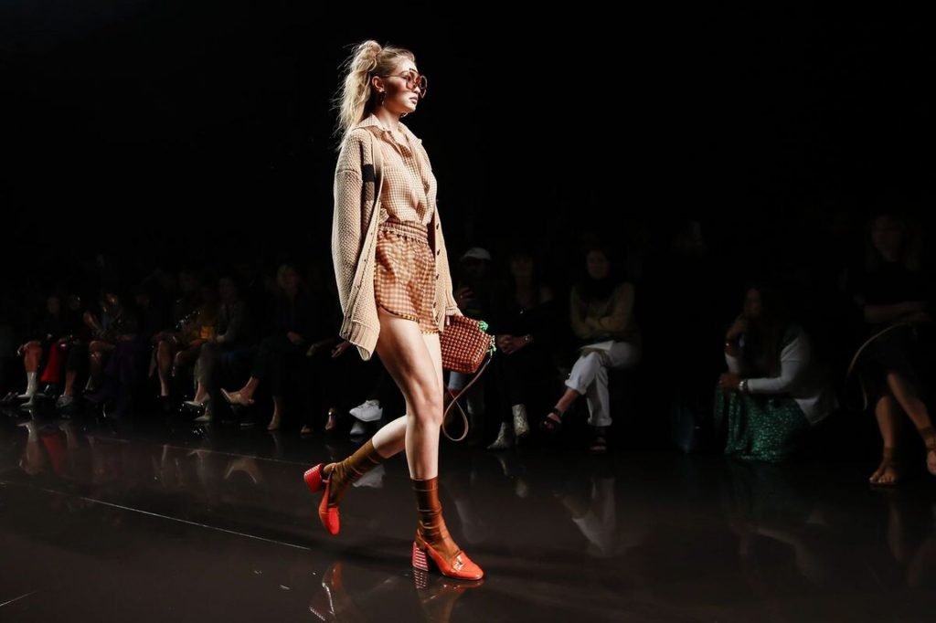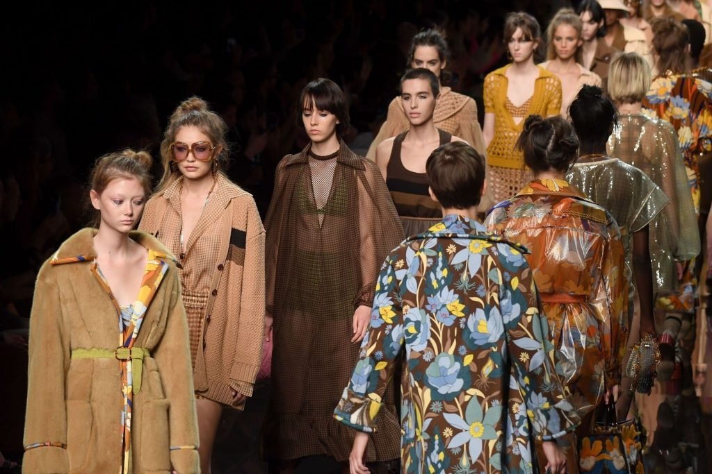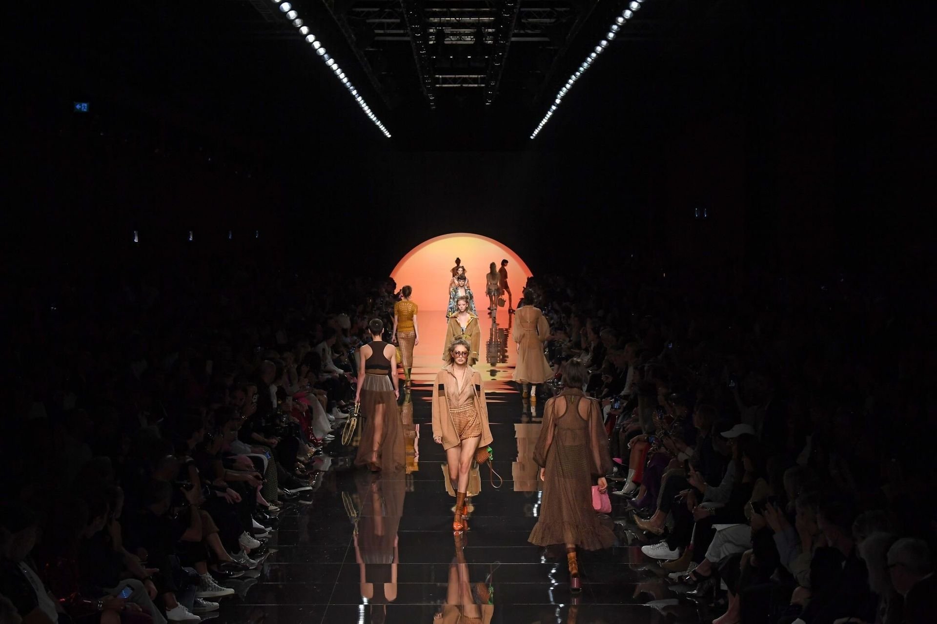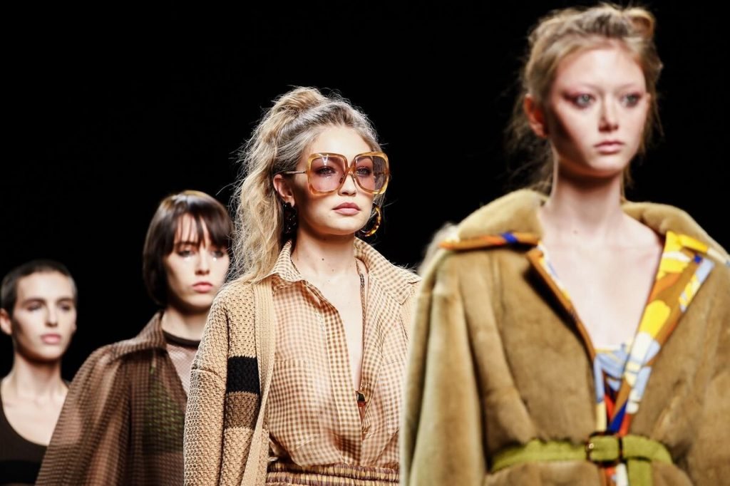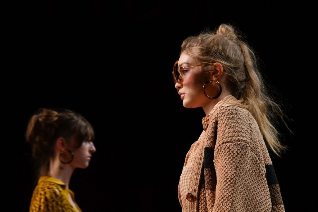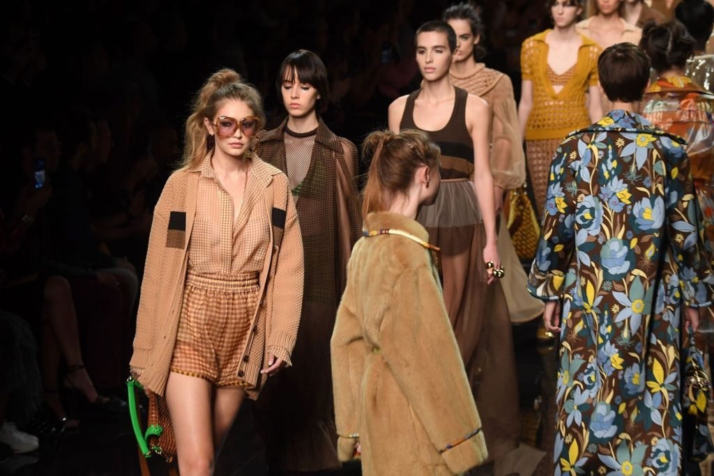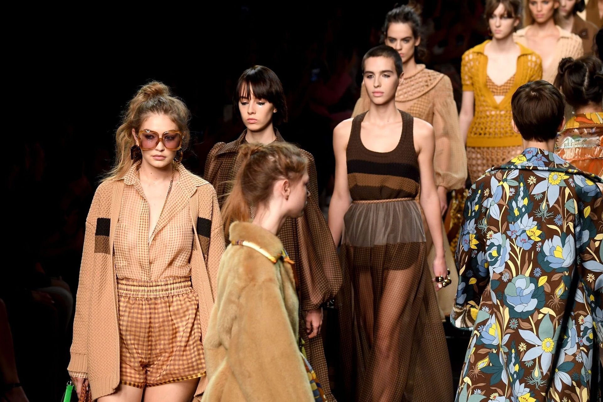 Model Gigi Hadid a affiché son décolleté, portant une chemise transparente lors du défilé Fendi pendant la Semaine de la Mode de Milan Printemps/Été 2020, 19/09/2019.