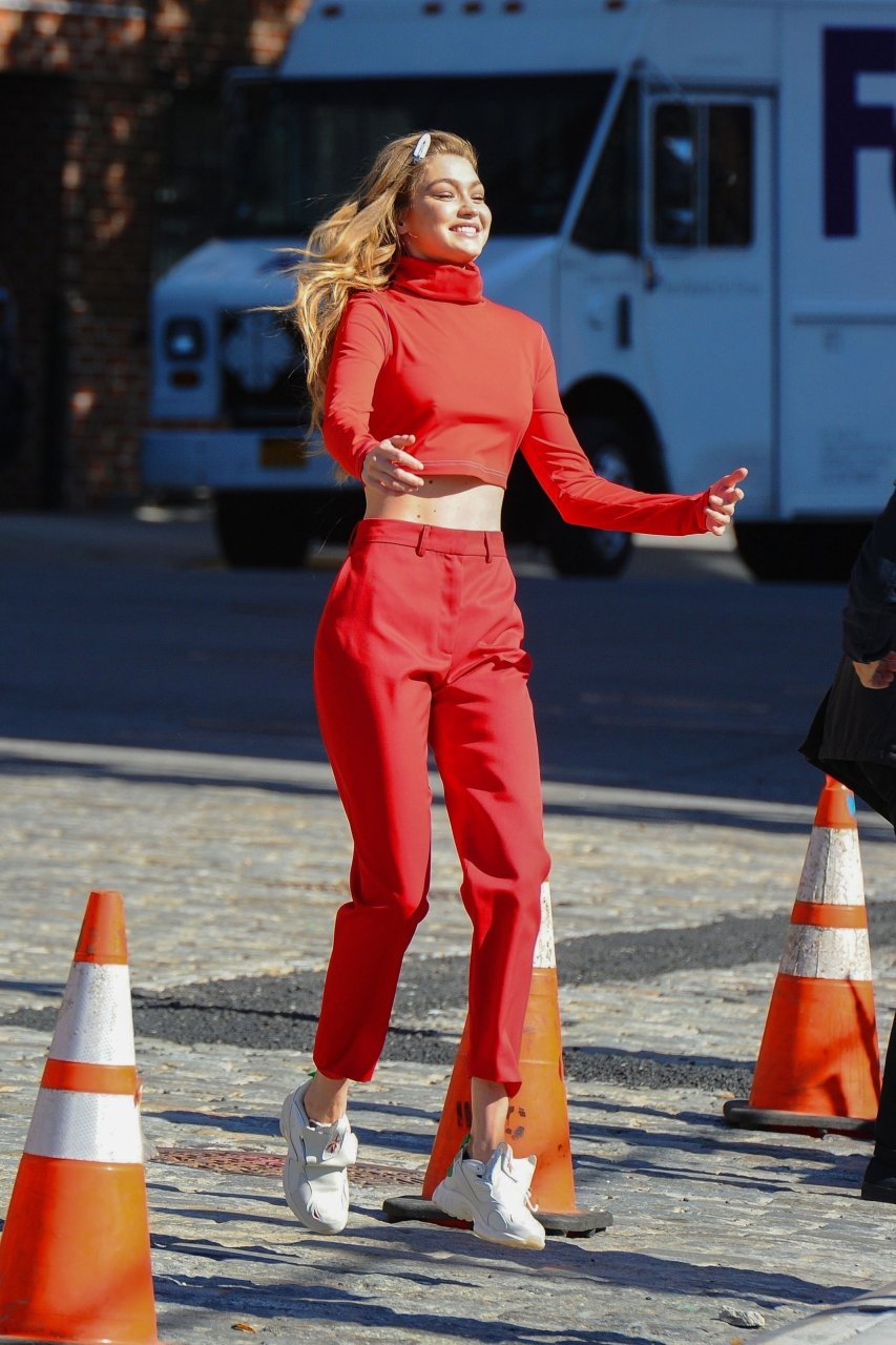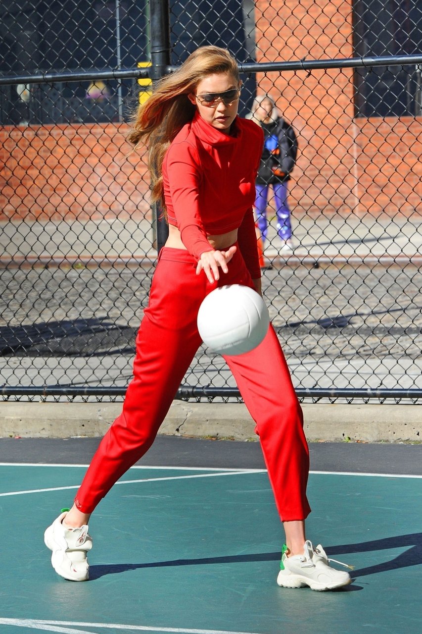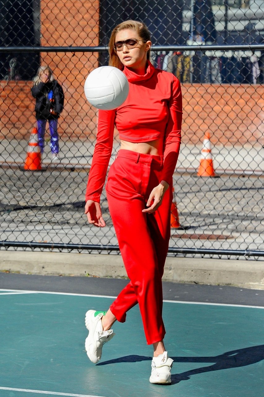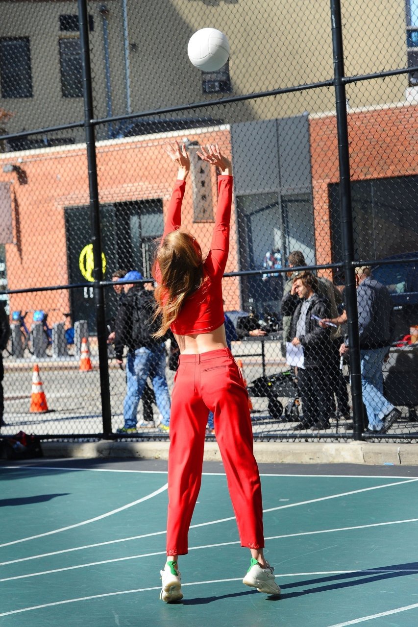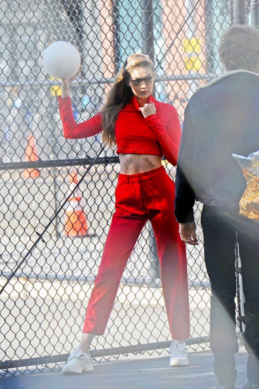 Le mannequin Gigi Hadid (23 ans) joue au volley-ball sur le plateau d’une séance photo à New York, le 17/10/2018. Gigi montre son ventre et ses formes dans une tenue rouge avec des baskets blanches alors qu’elle joue avec un ballon de volley pendant une pause.