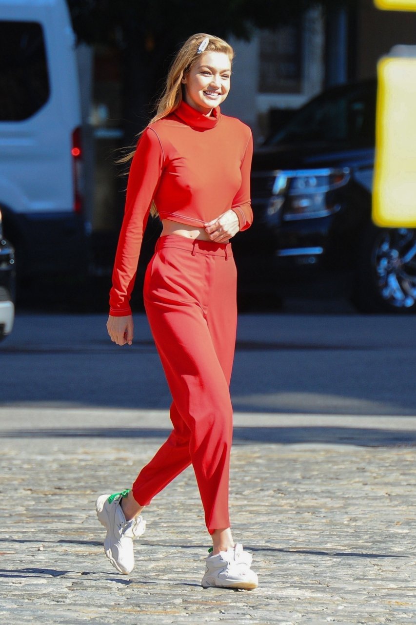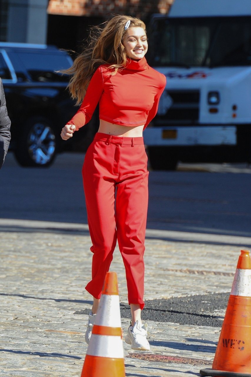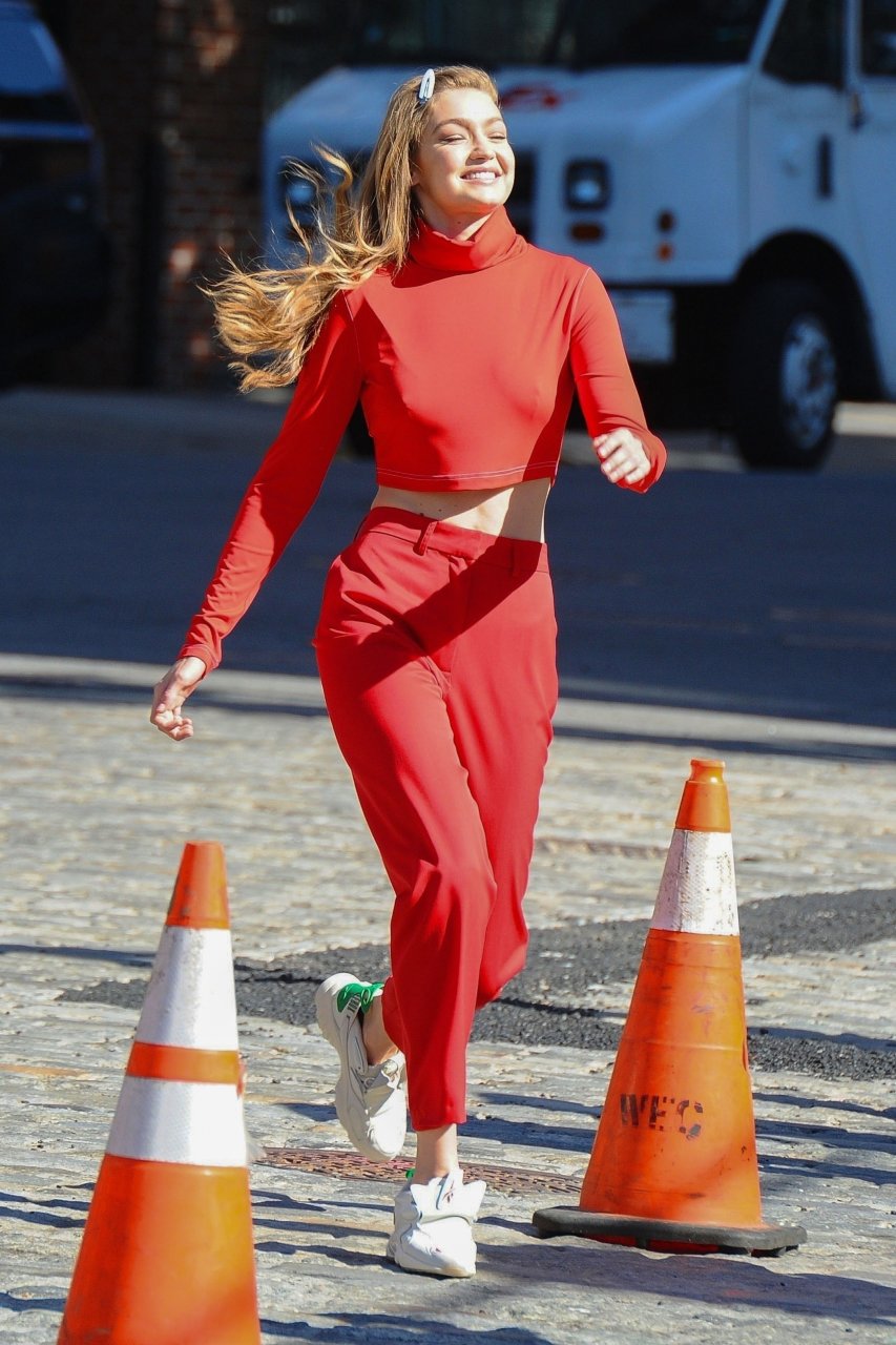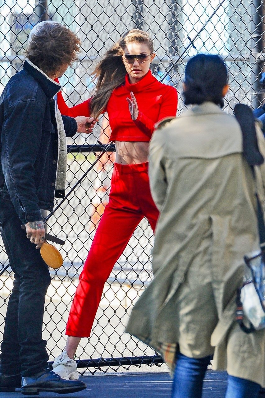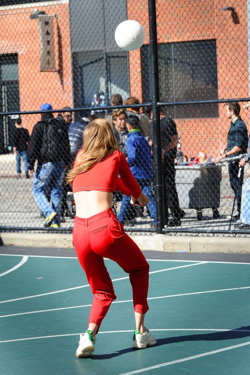 Le mannequin Gigi Hadid (23 ans) joue au volley-ball sur le plateau d’une séance photo à New York, le 17/10/2018. Gigi montre son ventre et ses formes dans une tenue rouge avec des baskets blanches alors qu’elle joue avec un ballon de volley pendant une pause.