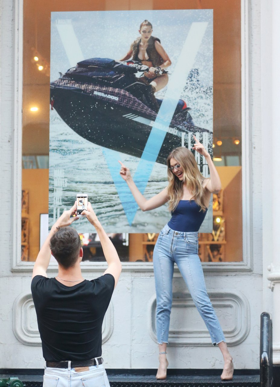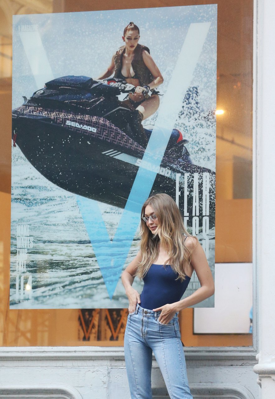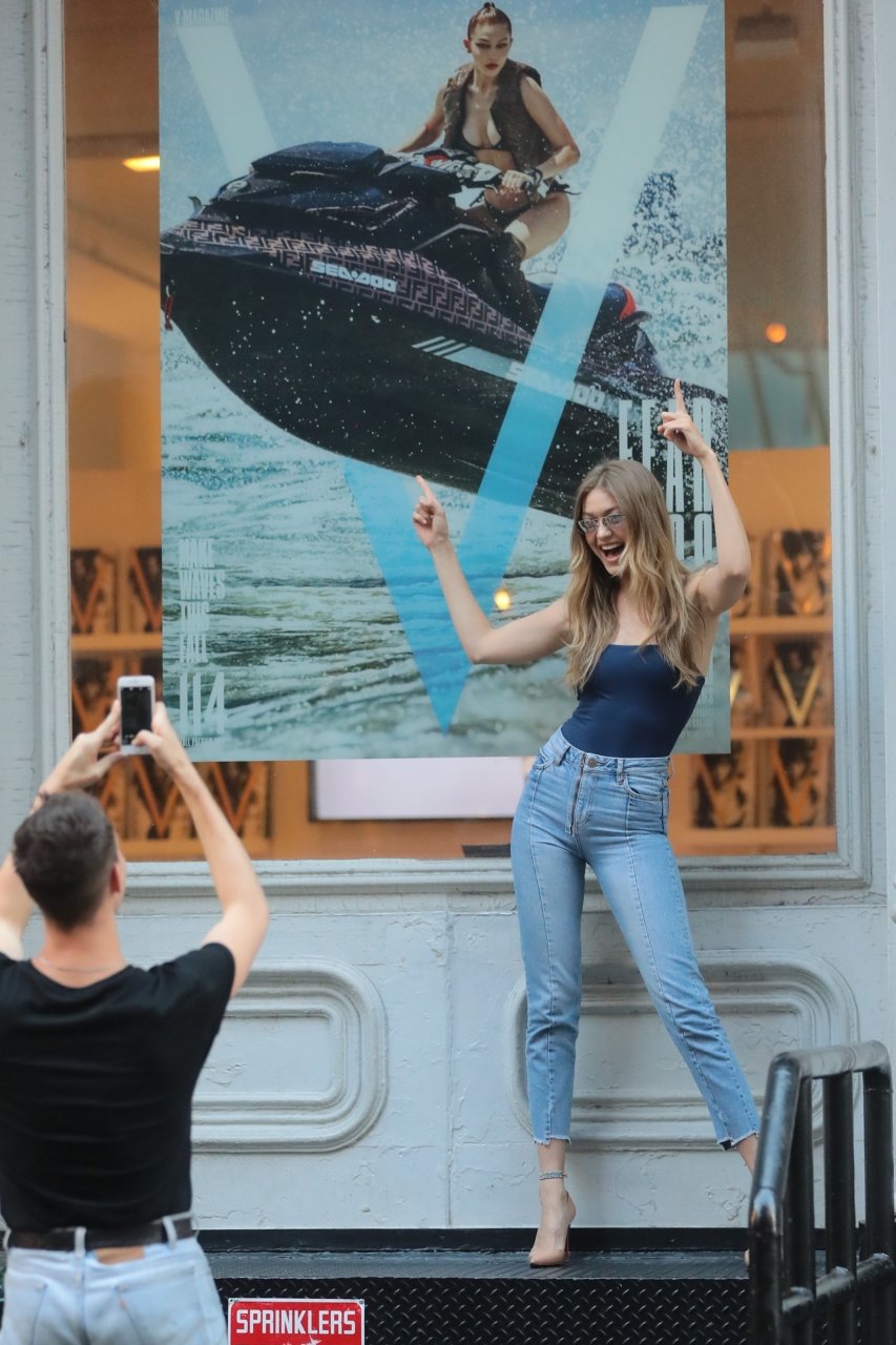 Model Gigi Hadid stops by the V Magazine offices in New York.
