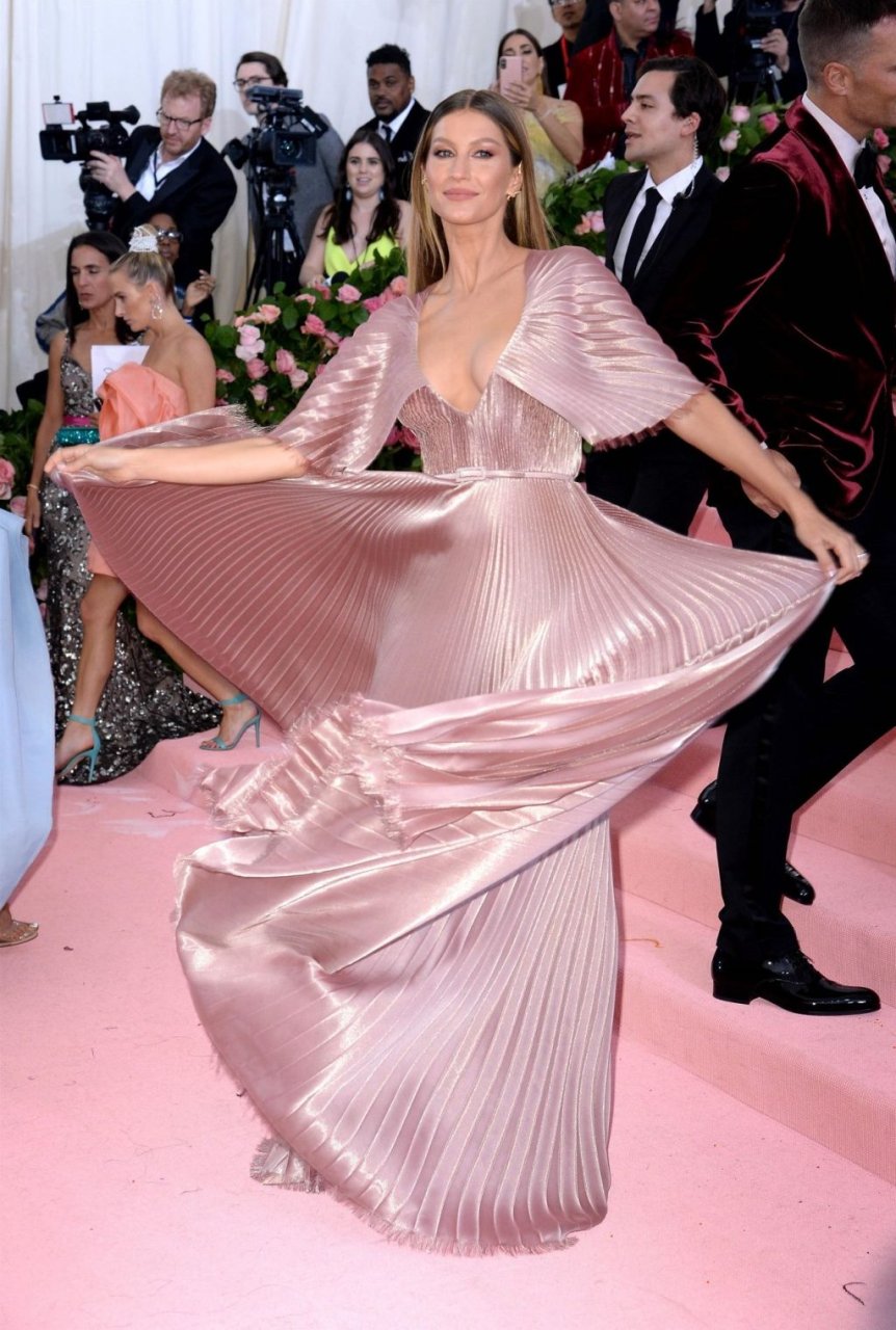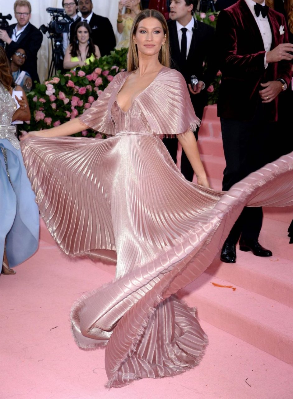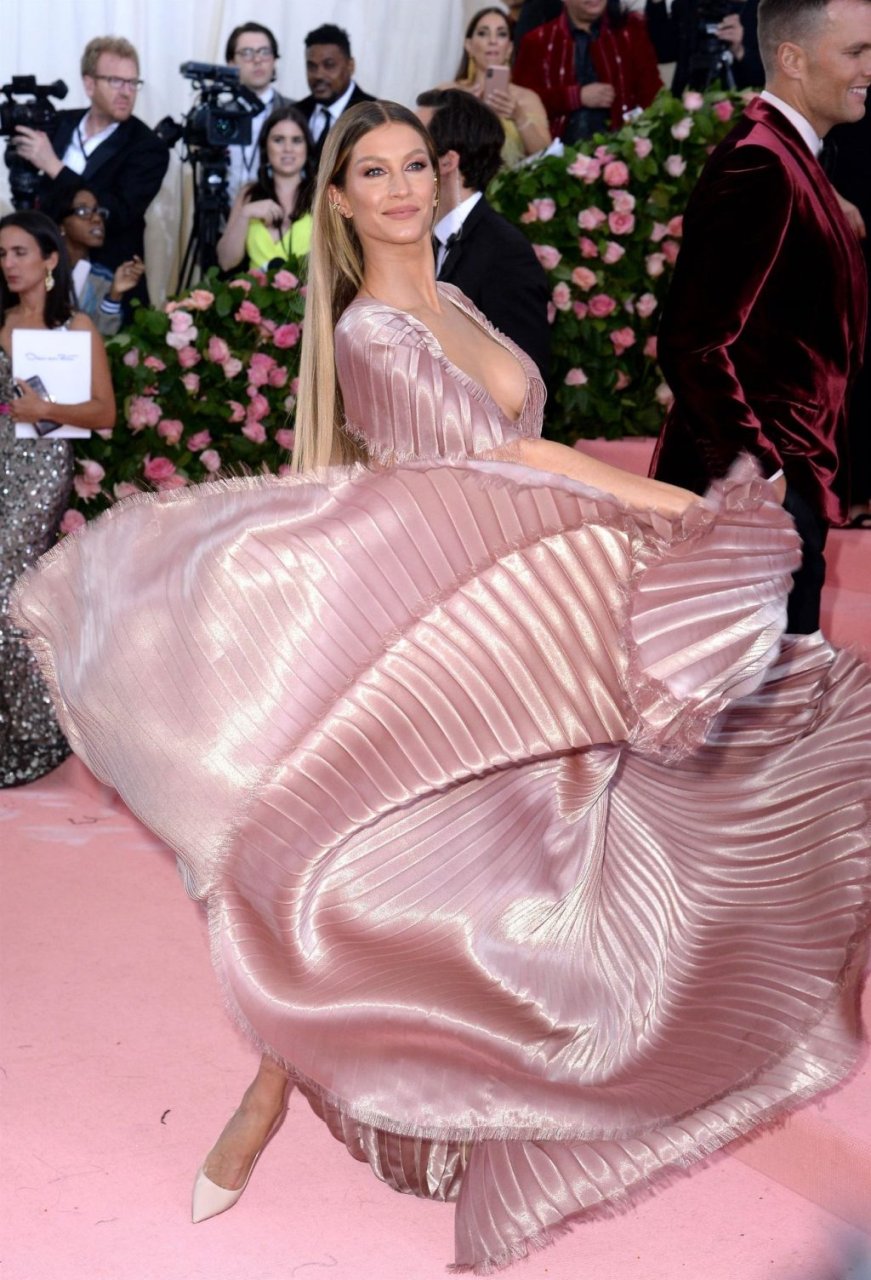 La supermodèle brésilienne Gisele Bündchen a exhibé son décolleté en portant une magnifique robe rose lors du MET Gala 2019 à New York, le 06/05/2019. Elle est apparue sur le tapis rose avec son mari, le footballeur Tom Brady.