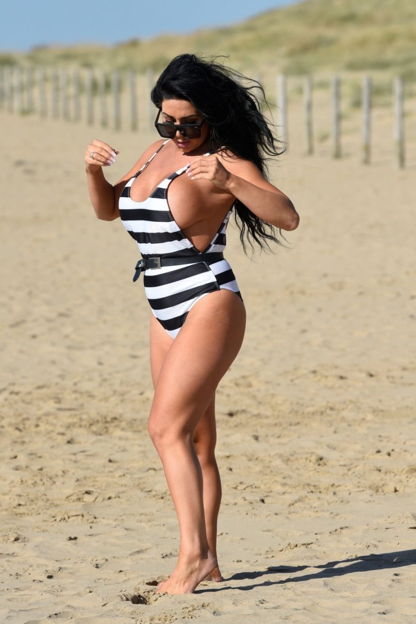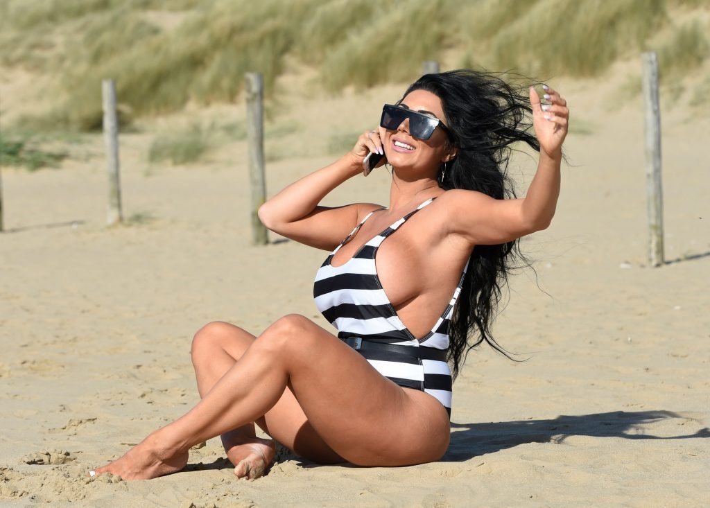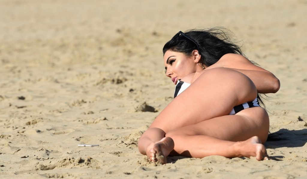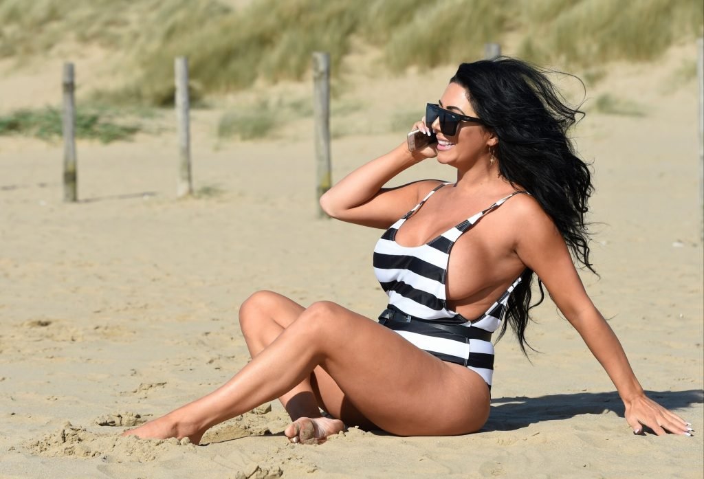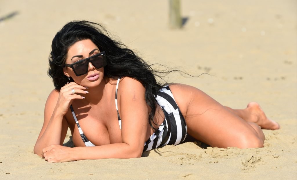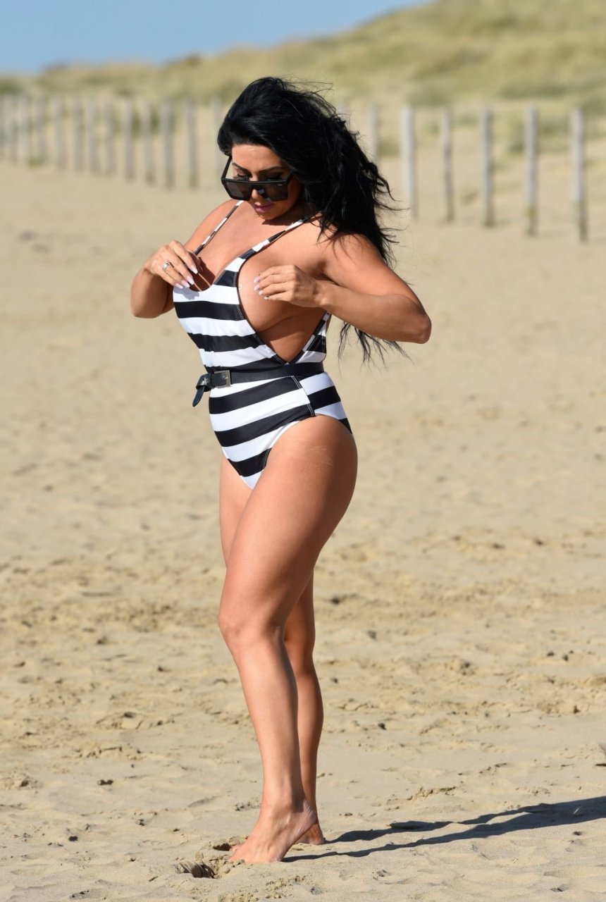 Gagnante du titre de Mannequin Glamour de l’Année 2018, la brune sexy Grace J Teal offre un spectacle très voluptueux alors qu’elle profite de la plage pendant ses vacances en Espagne, 10/04/2018.