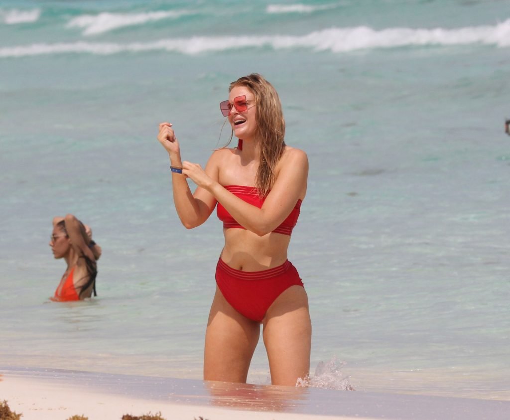 Actrice britannique, mannequin et Miss Univers Grande-Bretagne 2014, Grace Levy est éblouissante dans un maillot de bain deux pièces rouge lors de ses vacances à Tulum, au Mexique, le 25/09/2019.