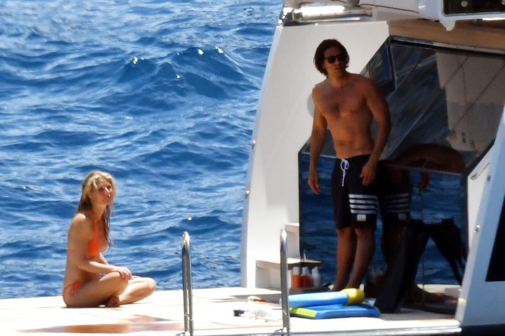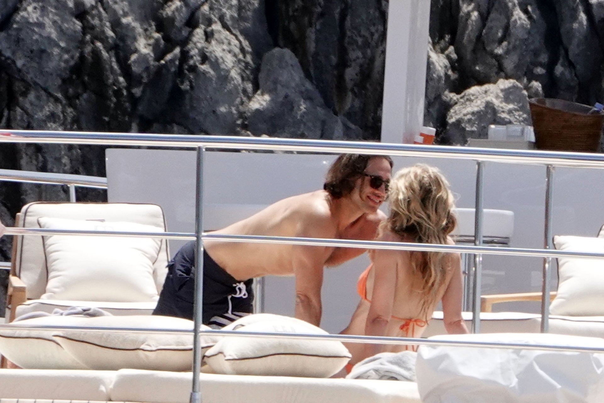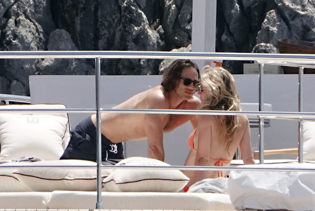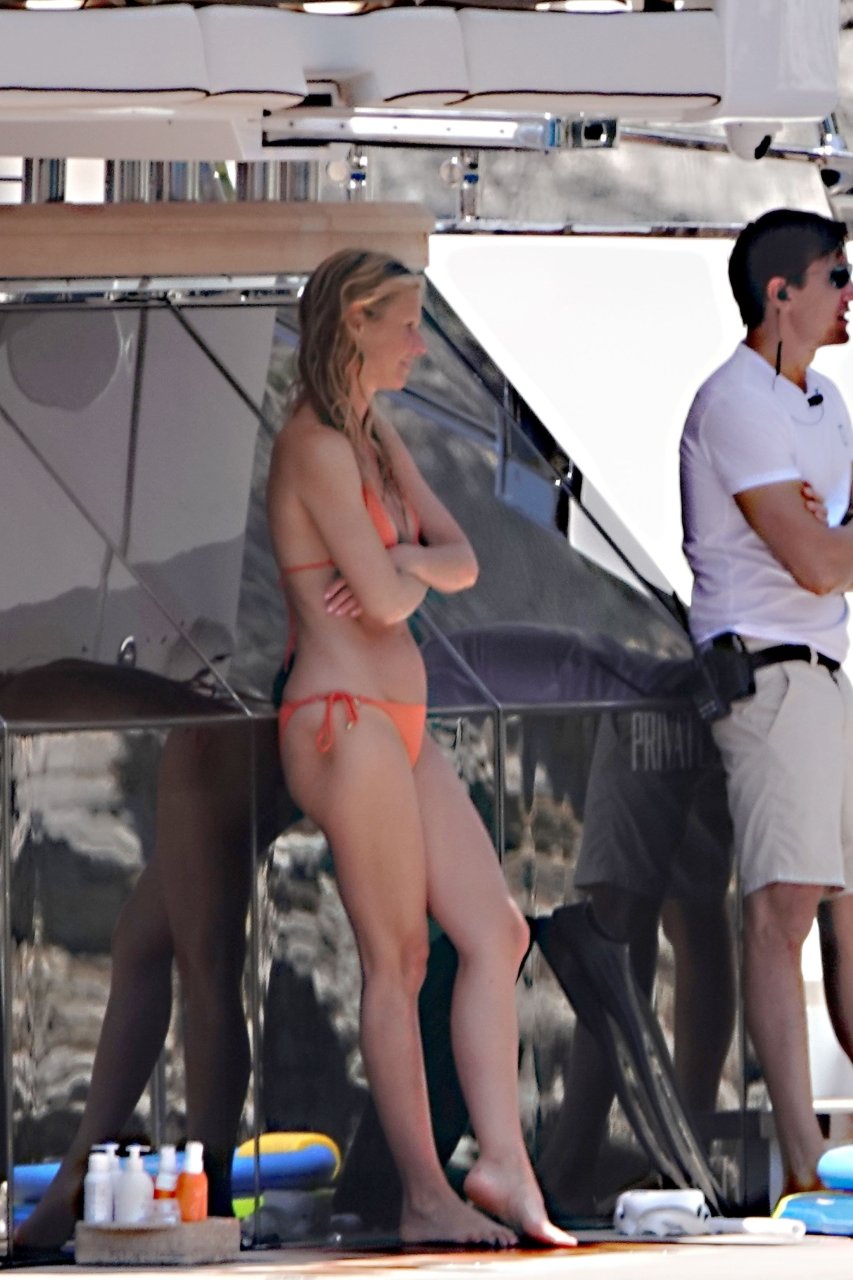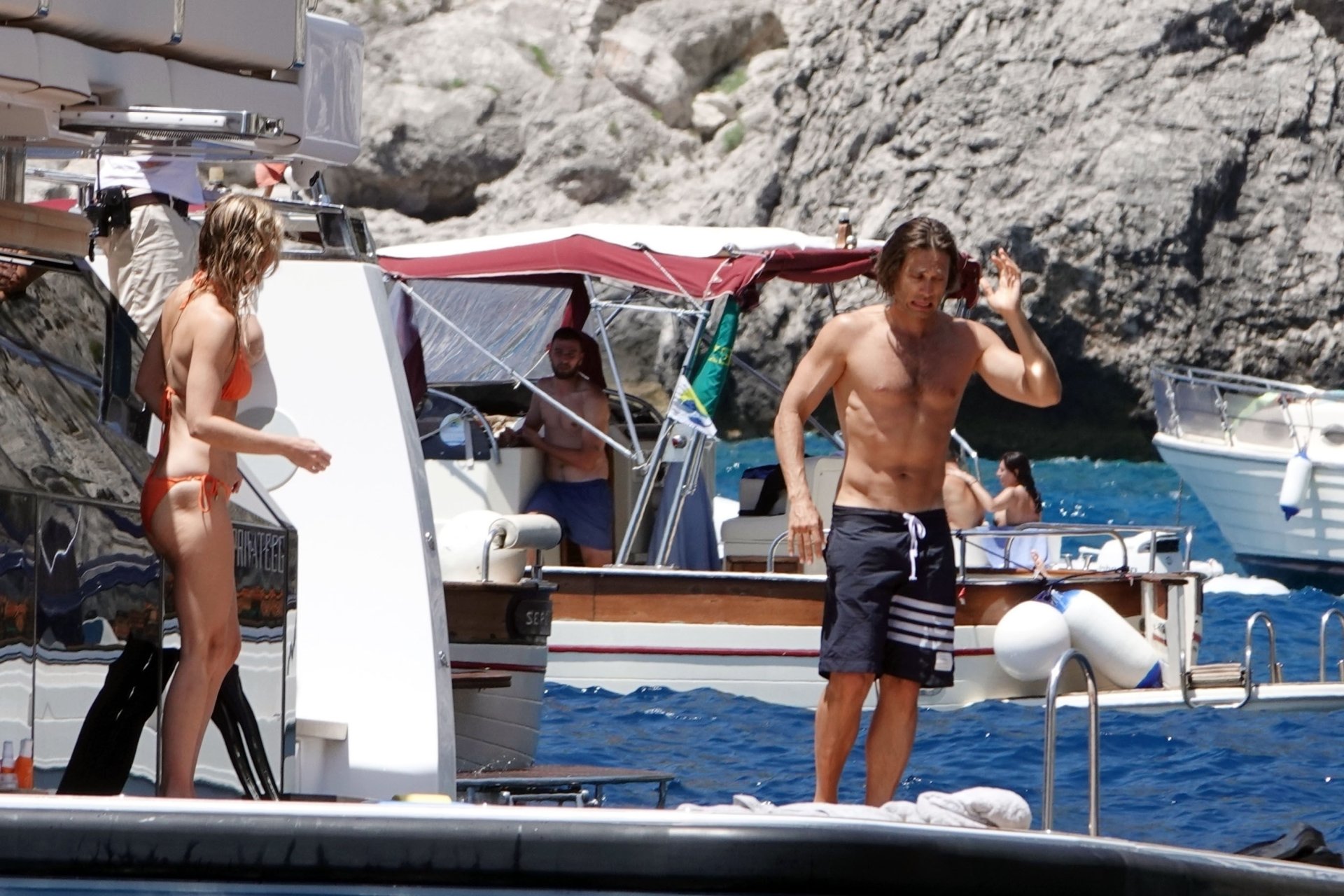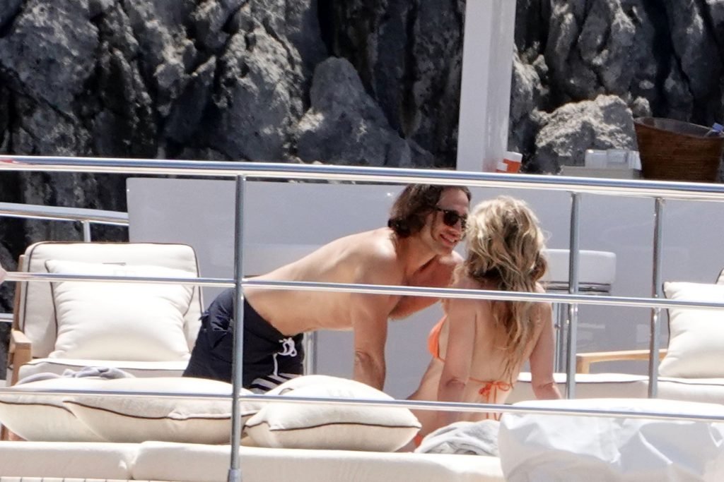 Actrice Gwyneth Paltrow, 45 ans, photographiée avec son fiancé Brad Falchuk, 47 ans, en vacances à Capri, le 24/06/2018. Gwyneth et Brad ont été vus profitant de leurs vacances romantiques et affichant leur affection en public pendant qu’elle prenait le soleil sur le bateau. Le couple a été photographié en train de nager à l’arrière du bateau. Gwyneth a montré son corps sexy et tonique en bikini en portant un bikini orange vif.