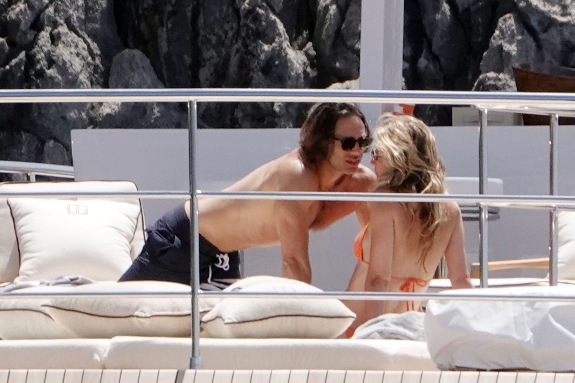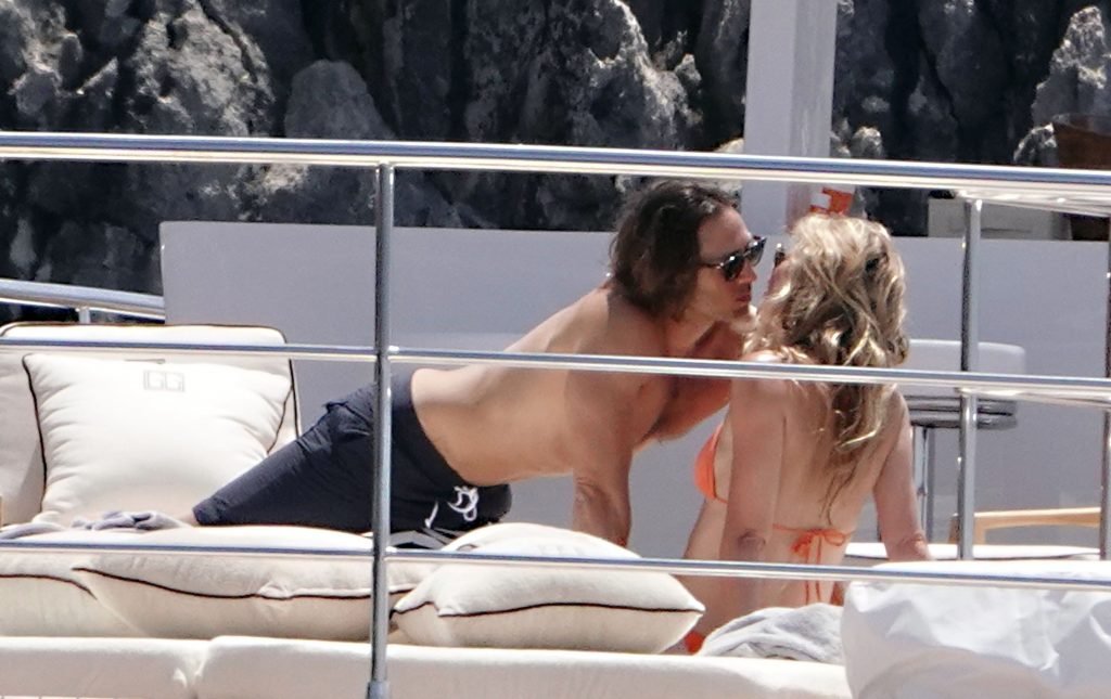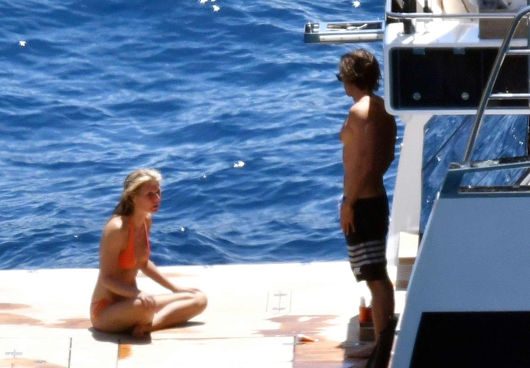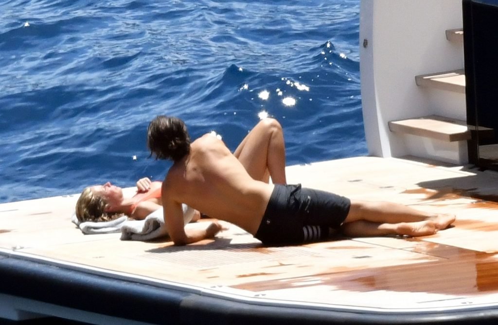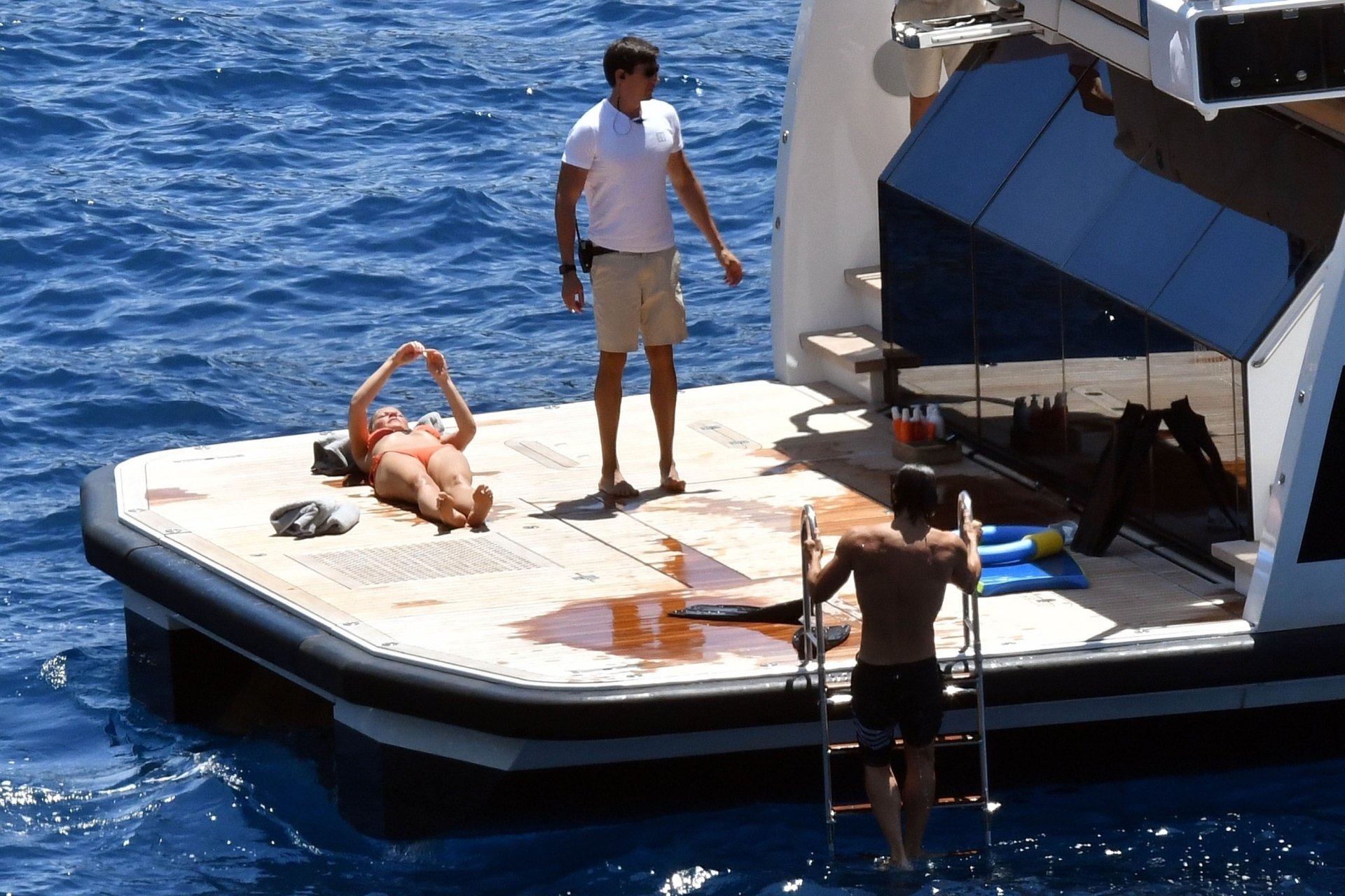 Actrice Gwyneth Paltrow, 45 ans, photographiée avec son fiancé Brad Falchuk, 47 ans, en vacances à Capri, le 24/06/2018. Gwyneth et Brad ont été vus profitant de leurs vacances romantiques et affichant leur affection en public pendant qu’elle prenait le soleil sur le bateau. Le couple a été photographié en train de nager à l’arrière du bateau. Gwyneth a montré son corps sexy et tonique en bikini en portant un bikini orange vif.