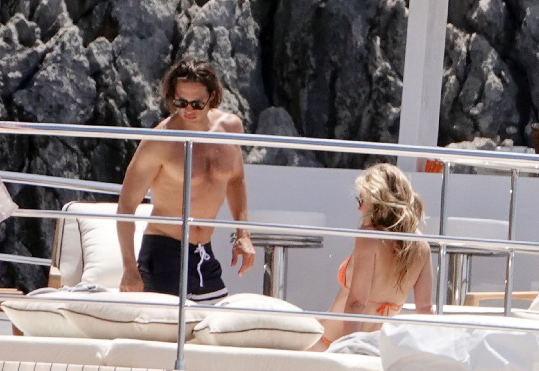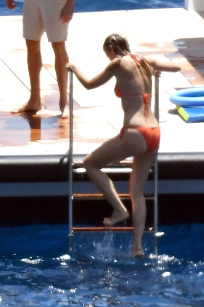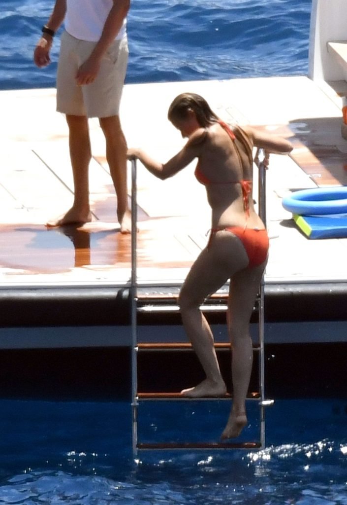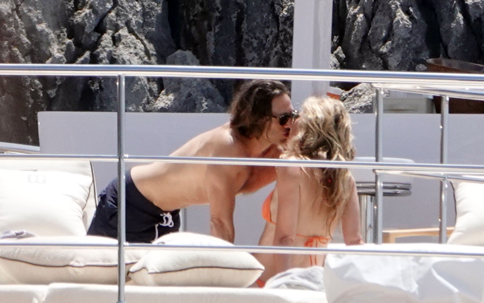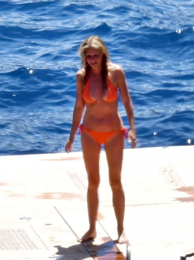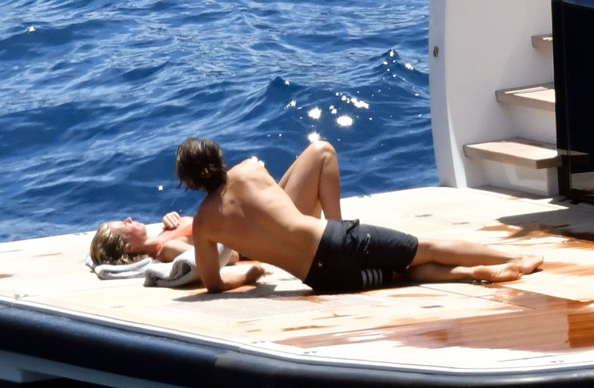 Actrice Gwyneth Paltrow, 45 ans, photographiée avec son fiancé Brad Falchuk, 47 ans, en vacances à Capri, le 24/06/2018. Gwyneth et Brad ont été vus profitant de leurs vacances romantiques et affichant leur affection en public pendant qu’elle prenait le soleil sur le bateau. Le couple a été photographié en train de nager à l’arrière du bateau. Gwyneth a montré son corps sexy et tonique en bikini en portant un bikini orange vif.