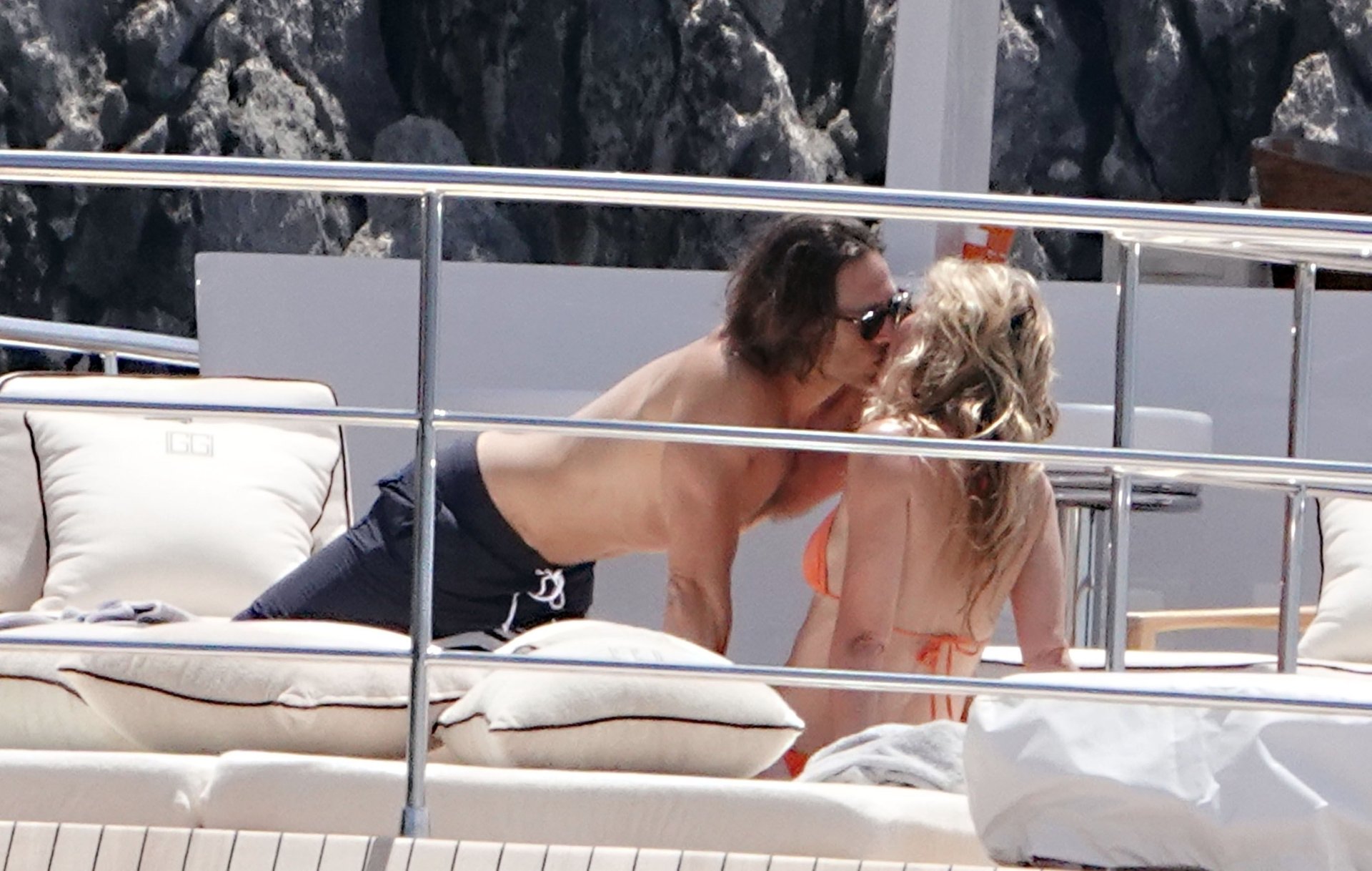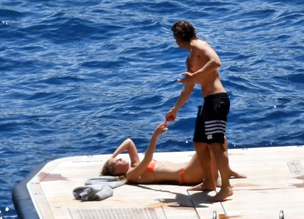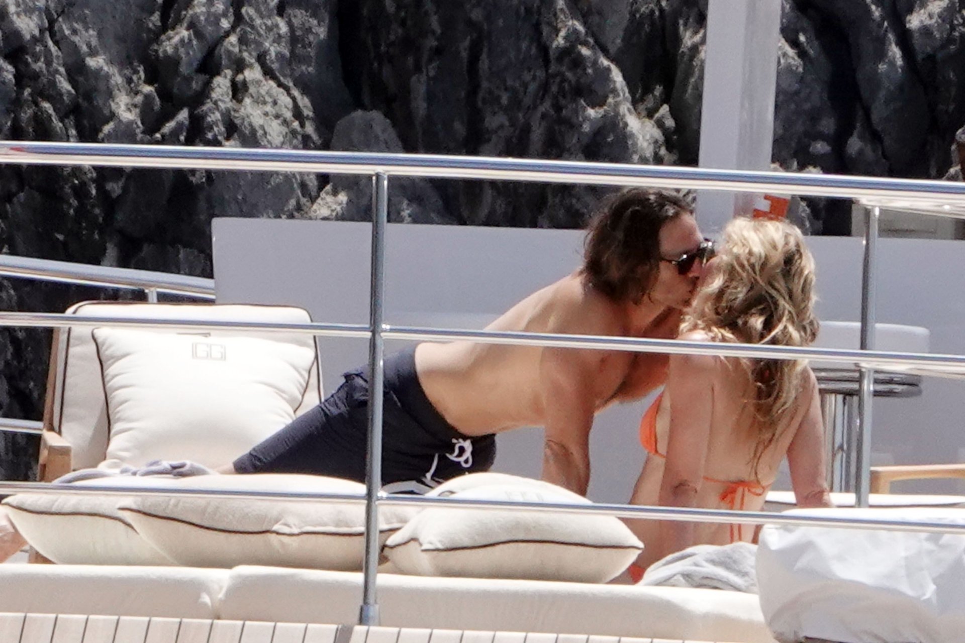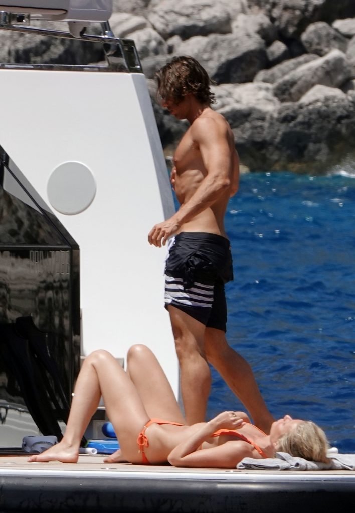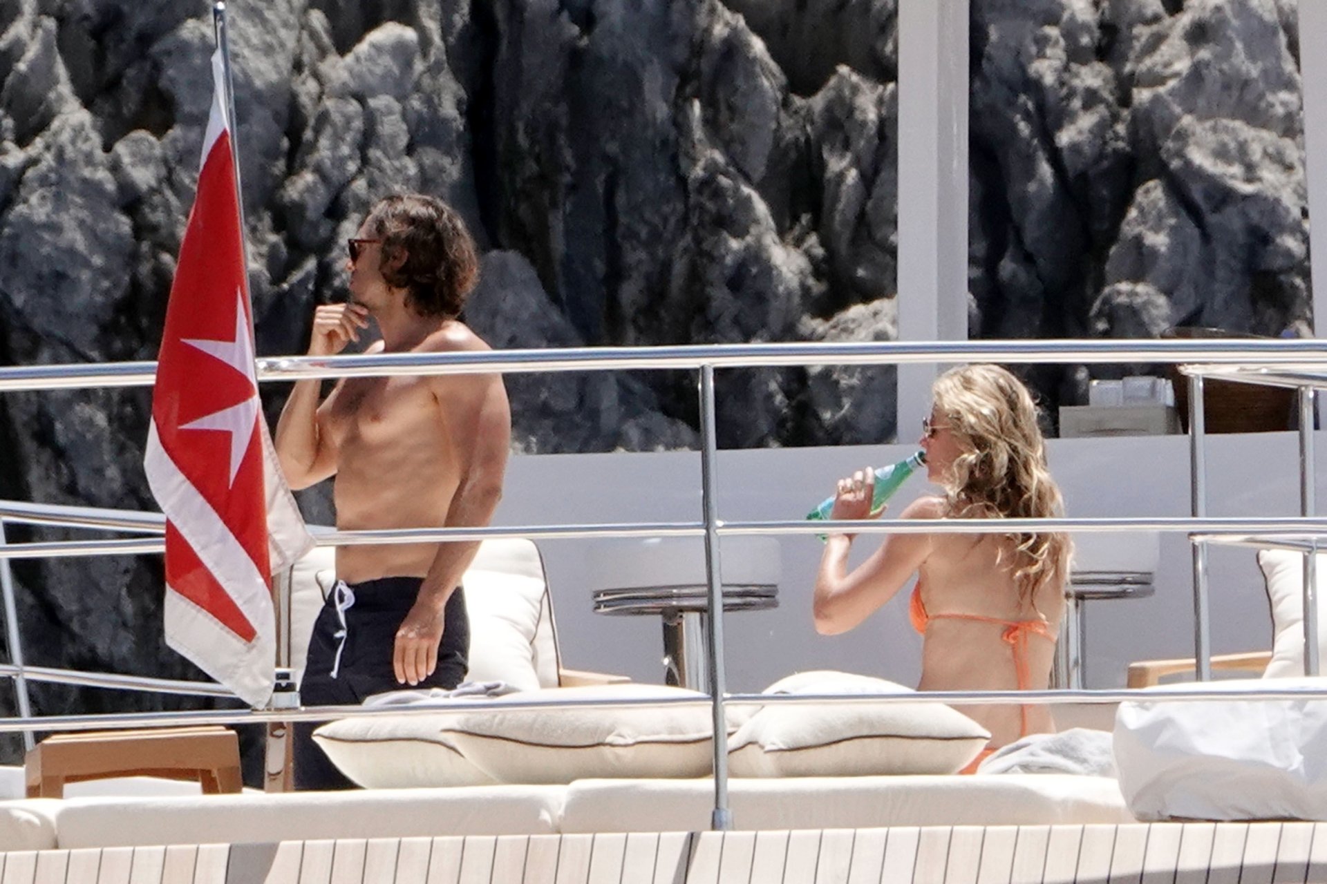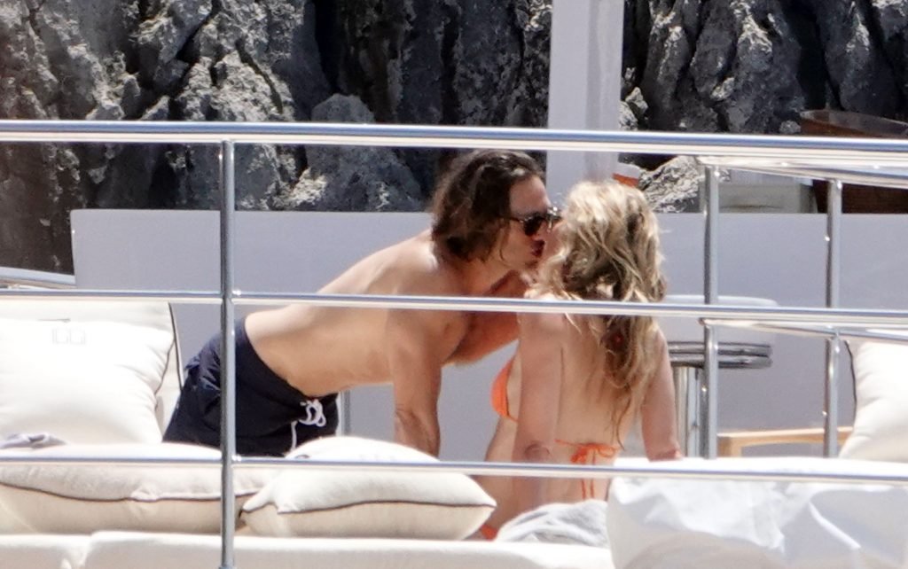Actrice Gwyneth Paltrow, 45 ans, photographiée avec son fiancé Brad Falchuk, 47 ans, en vacances à Capri, le 24/06/2018. Gwyneth et Brad ont été vus profitant de leurs vacances romantiques et affichant leur affection en public pendant qu’elle prenait le soleil sur le bateau. Le couple a été photographié en train de nager à l’arrière du bateau. Gwyneth a montré son corps sexy et tonique en bikini en portant un bikini orange vif.