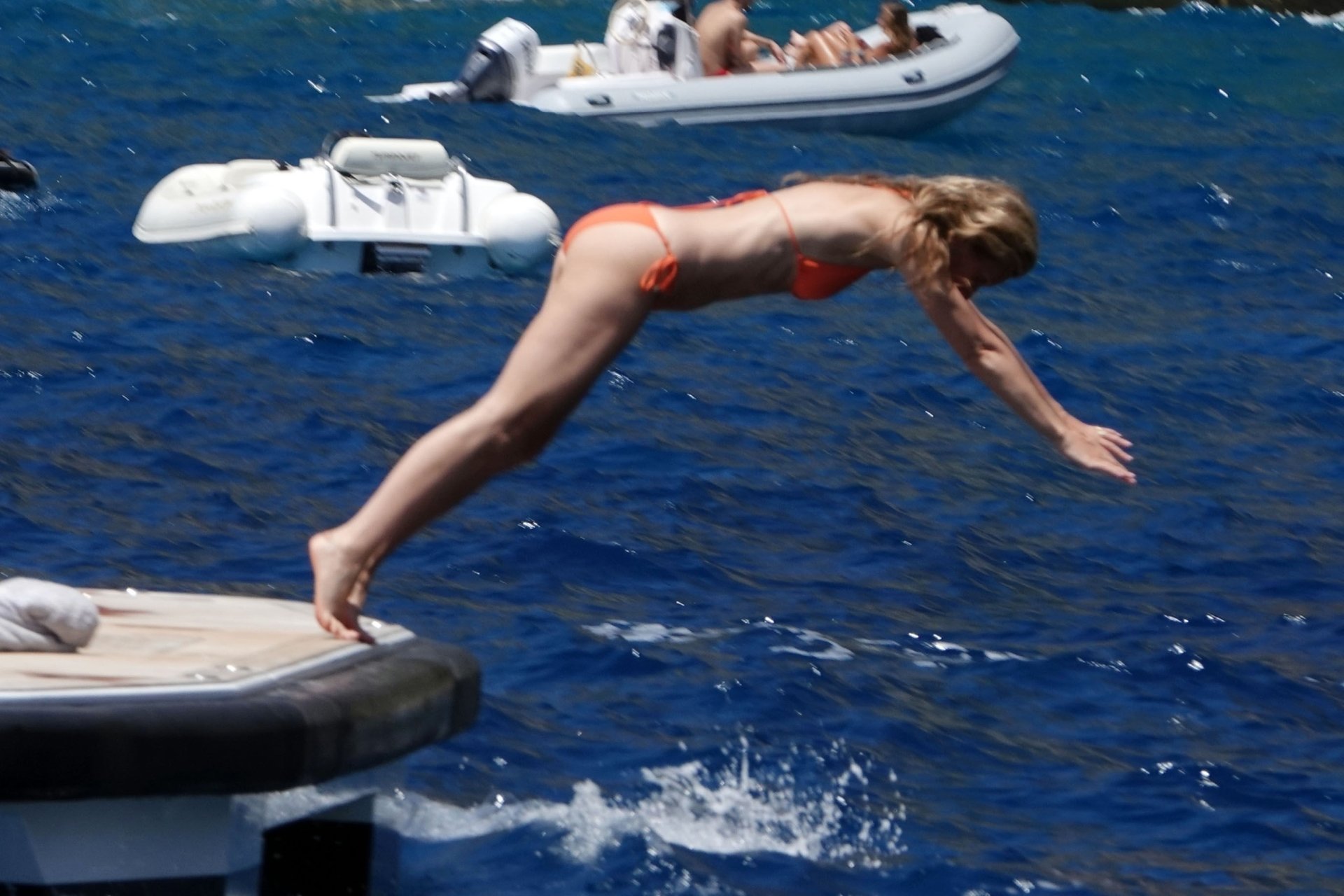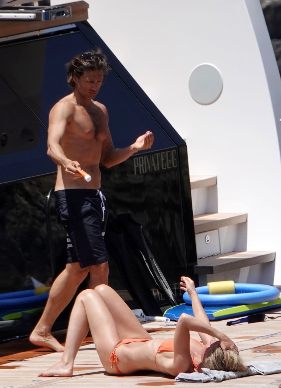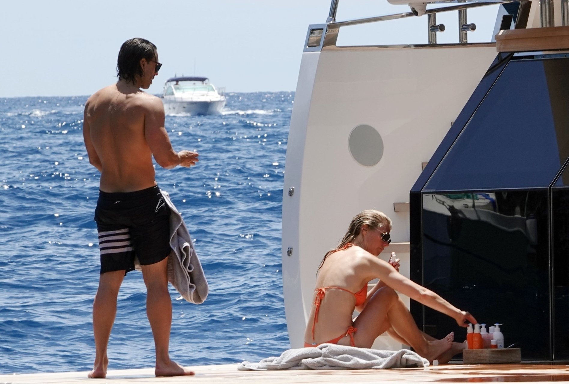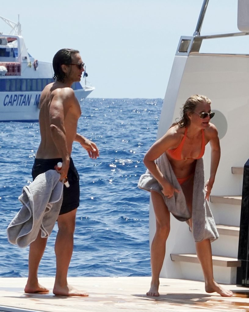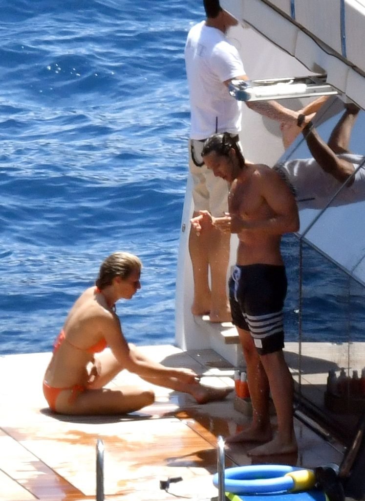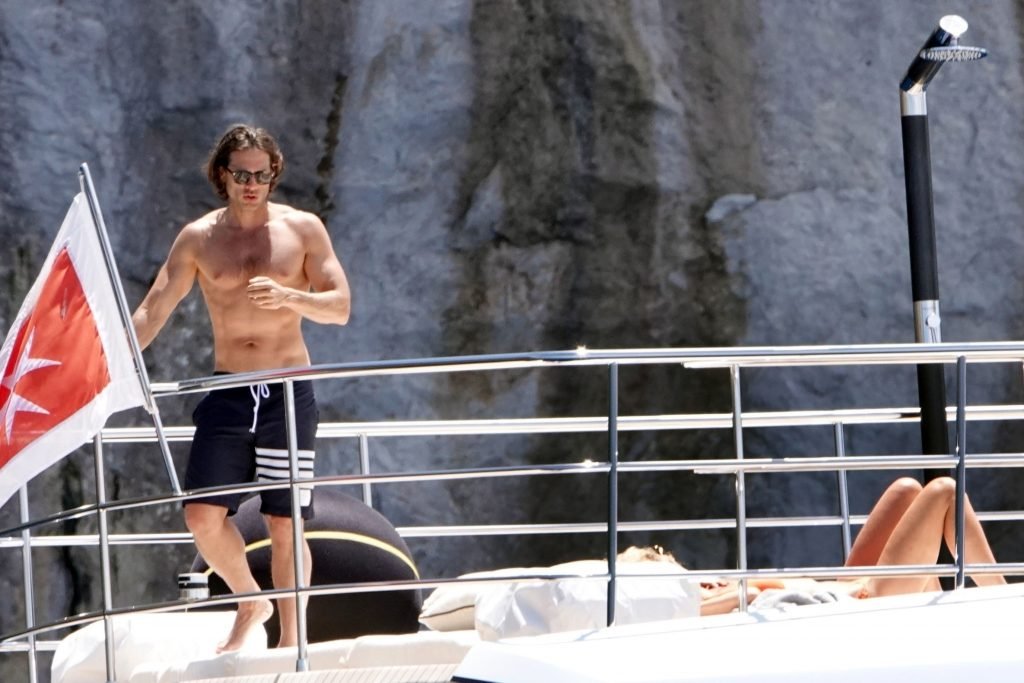 Actrice Gwyneth Paltrow, 45 ans, photographiée avec son fiancé Brad Falchuk, 47 ans, en vacances à Capri, le 24/06/2018. Gwyneth et Brad ont été vus profitant de leurs vacances romantiques et affichant leur affection en public pendant qu’elle prenait le soleil sur le bateau. Le couple a été photographié en train de nager à l’arrière du bateau. Gwyneth a montré son corps sexy et tonique en bikini en portant un bikini orange vif.