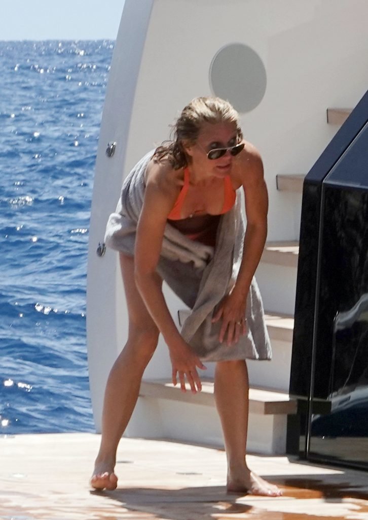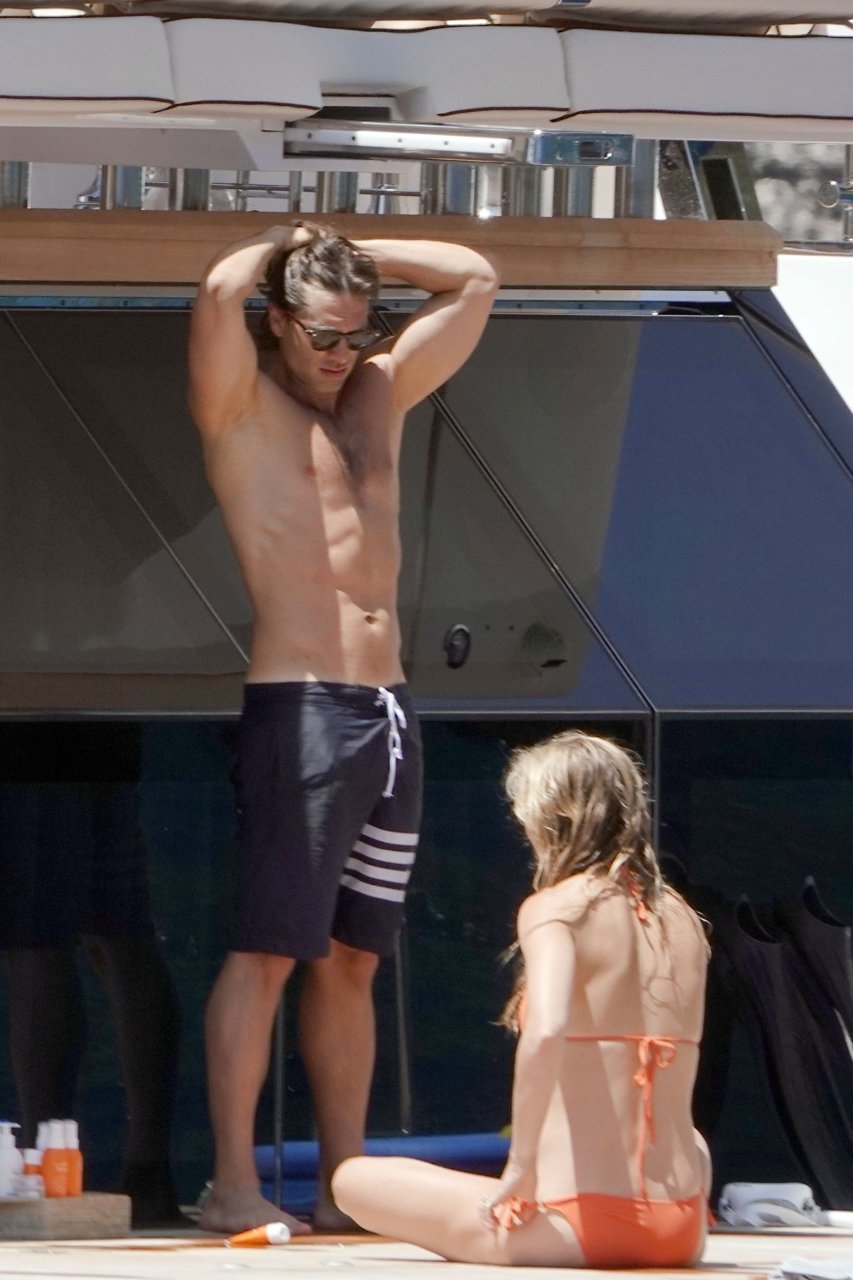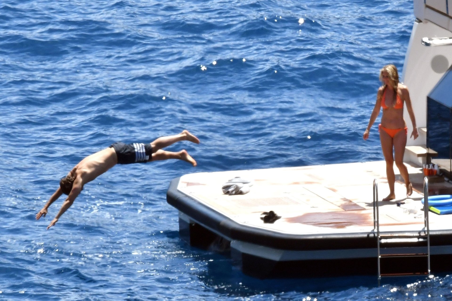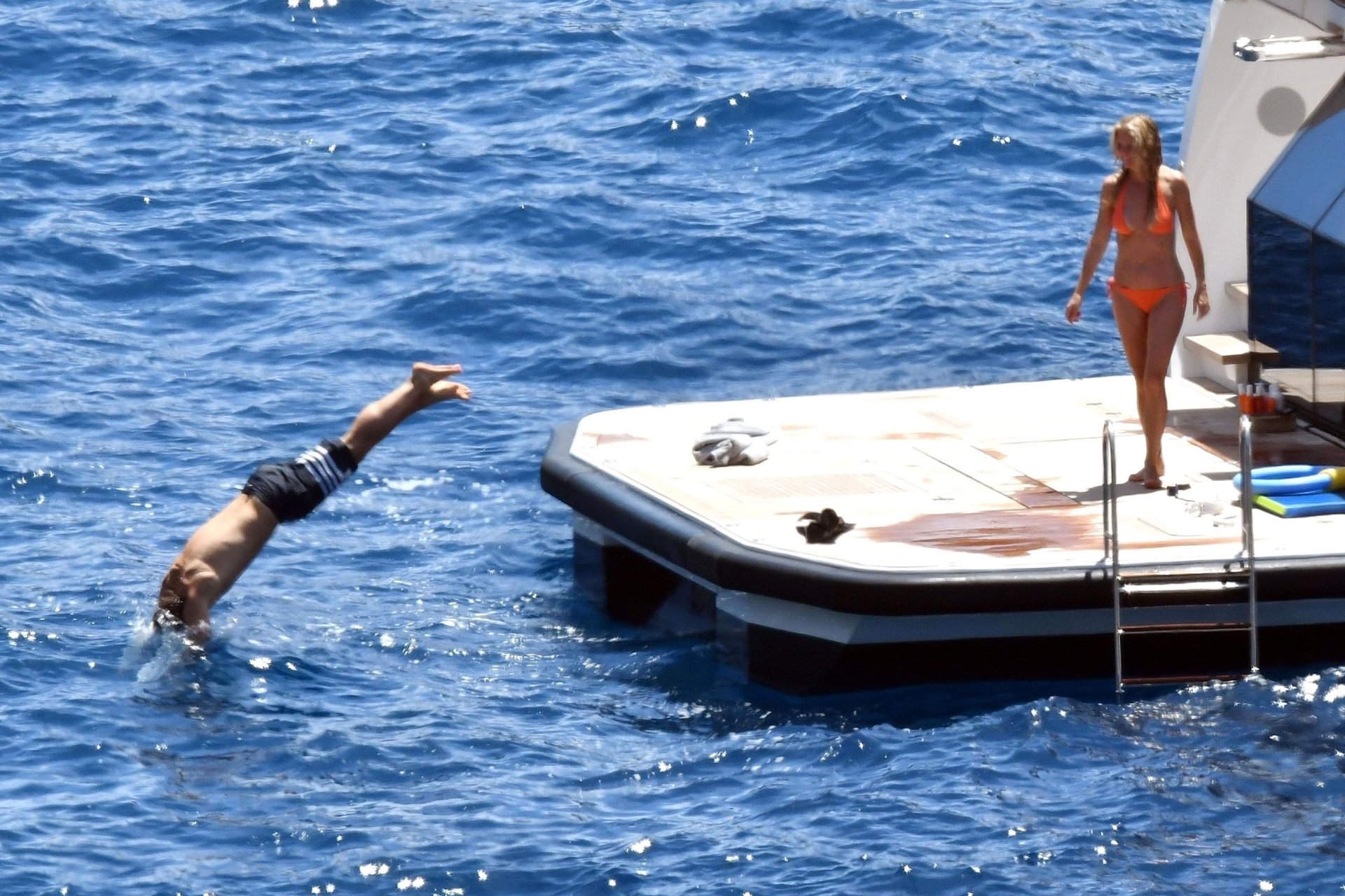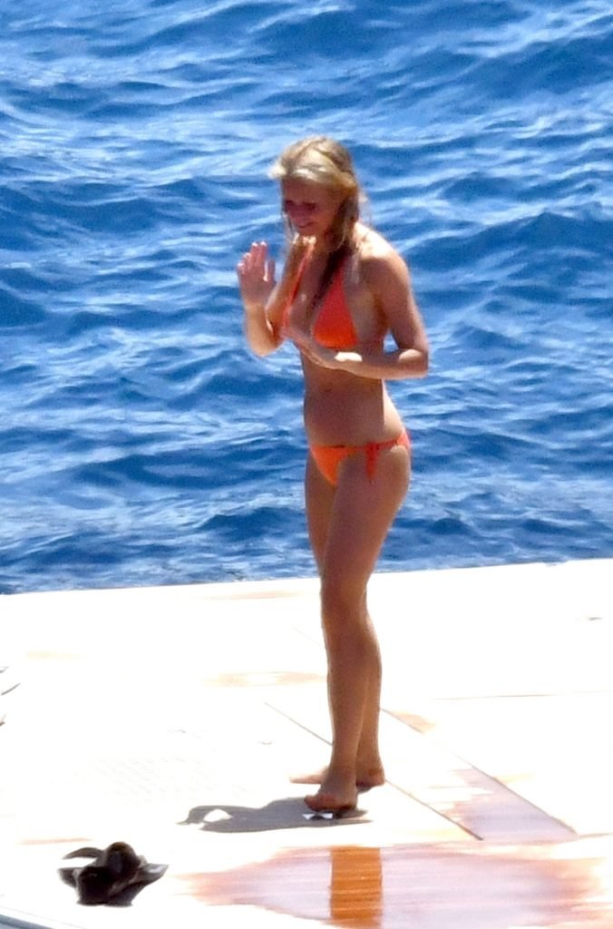 Actrice Gwyneth Paltrow, 45 ans, photographiée avec son fiancé Brad Falchuk, 47 ans, en vacances à Capri, le 24/06/2018. Gwyneth et Brad ont été vus profitant de leurs vacances romantiques et affichant leur affection en public pendant qu’elle prenait le soleil sur le bateau. Le couple a été photographié en train de nager à l’arrière du bateau. Gwyneth a montré son corps sexy et tonique en bikini en portant un bikini orange vif.