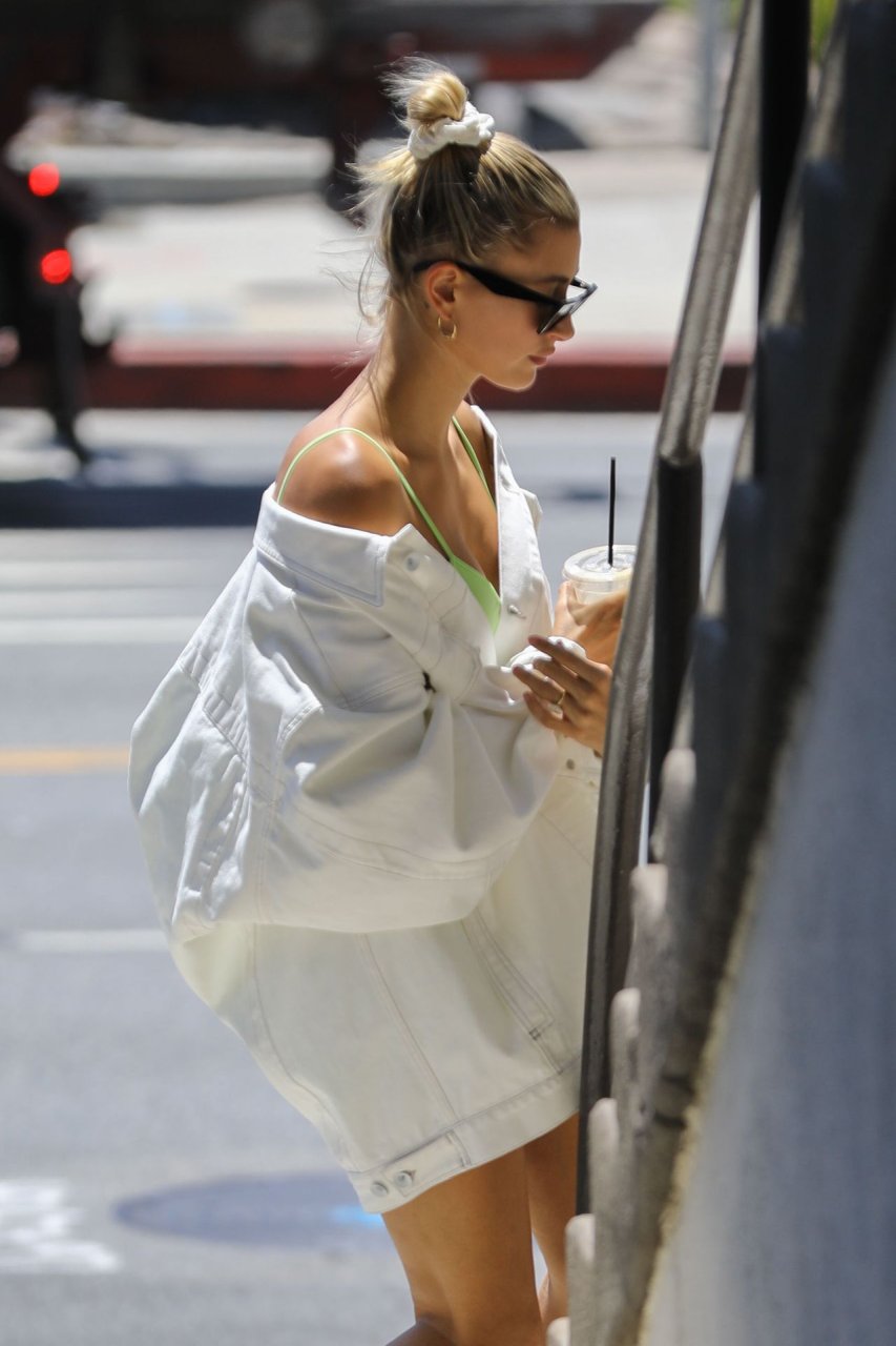 Qu’a-t-elle dessous ?! Hailey Baldwin se couvre d’une veste en jean blanche surdimensionnée et ce qui semble être un soutien-gorge de sport ou un haut de maillot de bain vert néon en dessous – West Hollywood, 20/08/2019.
